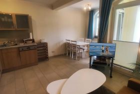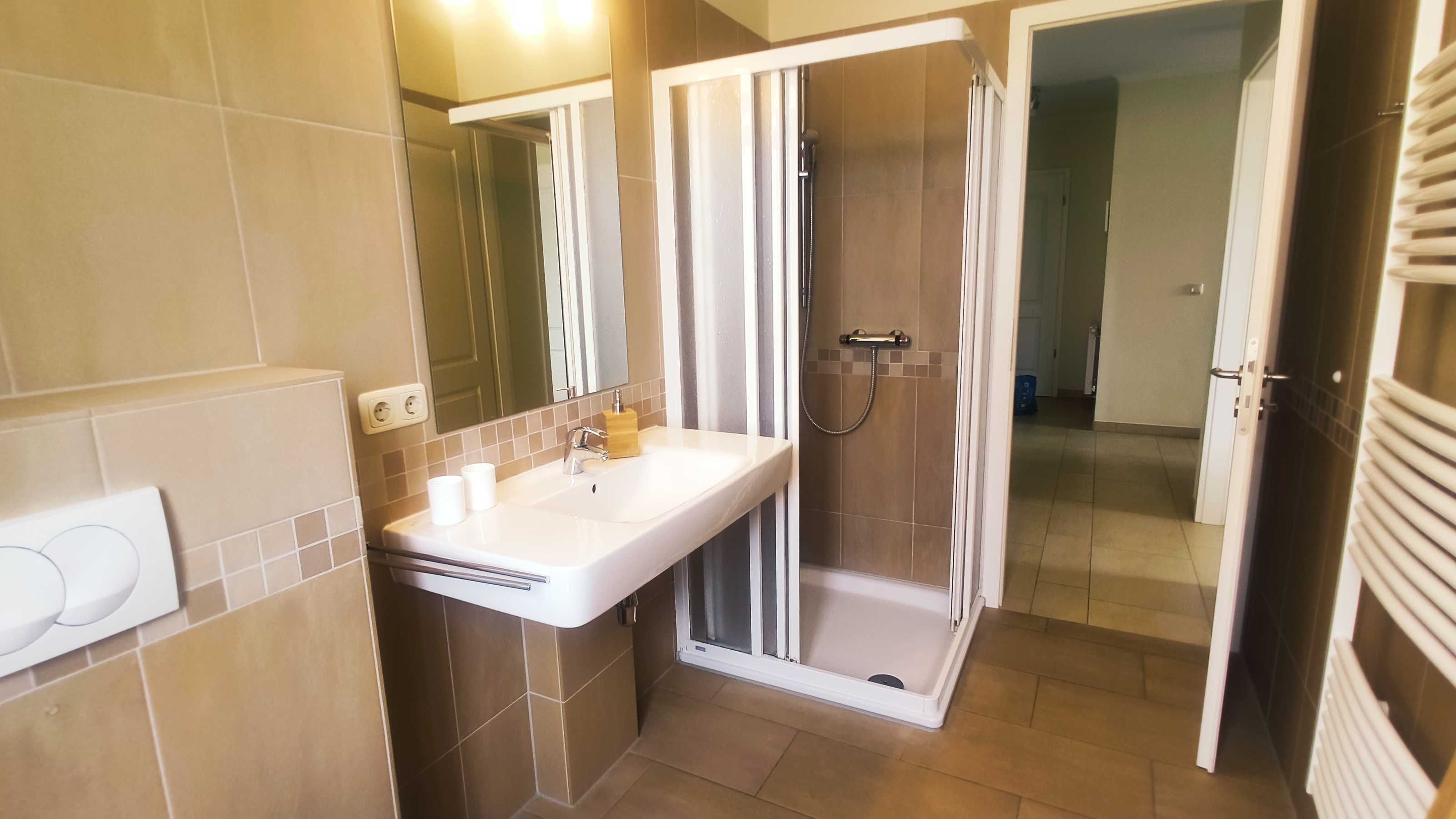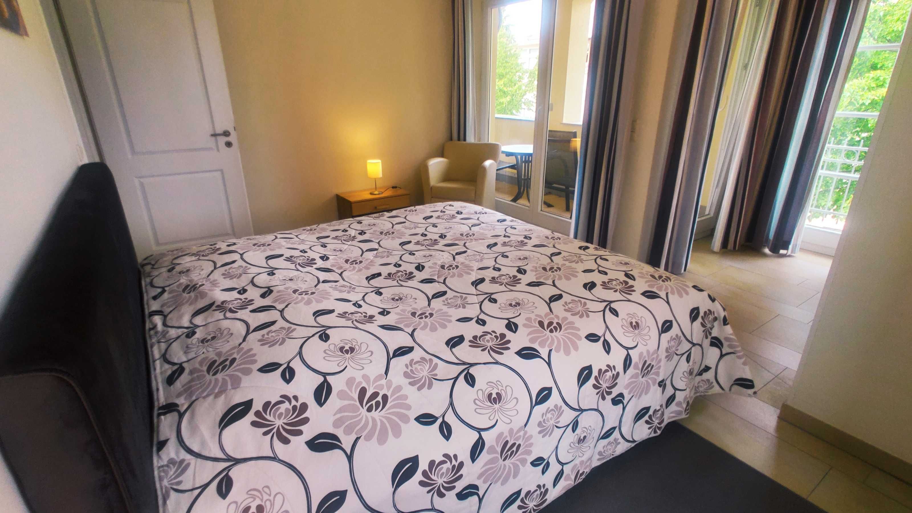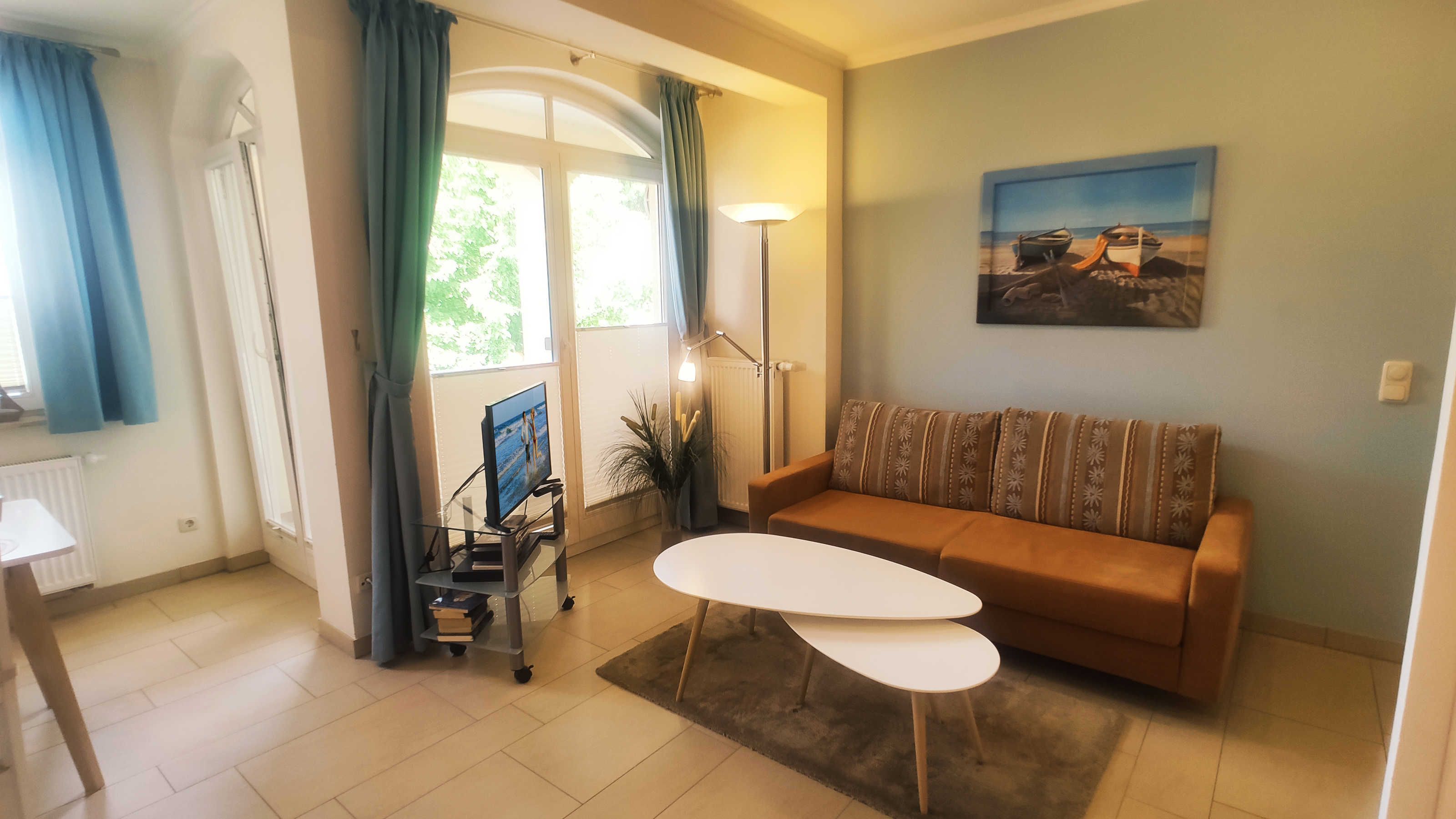 2-Zimmer-Ferienwohnung im Obergeschoss, bestehend aus Wohnzimmer (Fernsehcouch, TV, Essecke), Schlafzimmer (Ehebett mit getrennten Matratzen), Küche (Mikrowelle, Geschirrspüler), Bad mit WC/Dusche, Balkon und Loggia zur Westseite.