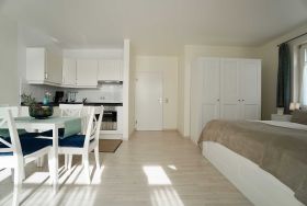 Das gemütlich eingerichtete Ferienappartement Mönchgut (A) bietet auf 44 m² eine moderne Unterkunft für bis zu 4 Gäste. Es verfügt über einen Wohn-Schlafraum mit Doppelbett und einem Schlafsofa für weitere zwei Gäste. Entspannen Sie vor dem Flachbild-TV oder ziehen Sie sich mit einem guten Buch in den bequemen Lesesessel in den integrierten Wintergarten zurück.Der WLAN-Zugang und ein SodaStream steht Ihnen kostenfrei zur Verfügung. Die hübsche Landhausküche ist mit allem ausgestattet, um Ihre Mahlzeiten zuzubereiten. Der Essbereich ist ebenfalls in diesem Wohn-Schlafraum. Zur Wohnung gehört ein helles Tageslicht-Duschbad. Ein Fön gehört ebenfalls zur Ausstattung. Ein Kinderreisebett (bis zwei Jahre) kann bei Bedarf bereit gestellt werden.