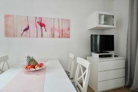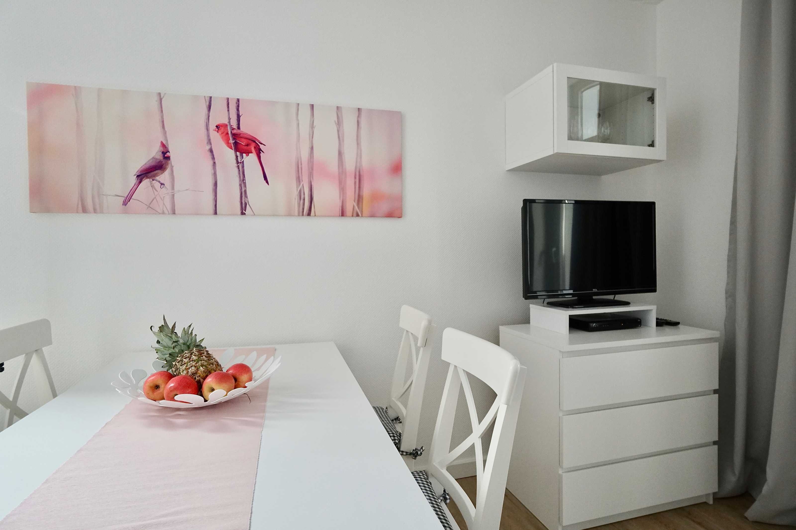 Im Komfort-Appartement Jasmund (A) mit ca. 53 - 60 m² finden bis zu 6 Personen Platz für einen schönen Urlaub. In dem modern eingerichteten Wohn- und Essbereich finden Sie ein gemütliches Sofa, das abends zu zwei Schlafmöglichkeiten umfunktioniert werden kann. Von dort aus haben Sie auch den direkten Blick auf den Flachbild-Fernseher, der gerade in den Abendstunden gut für Ihre Unterhaltung sorgen kann. Ein kostenloser WLAN-Anschluss und ein SodaStream ist nutzbar. Am großen Esstisch finden alle Gäste dieses Appartements Platz, nachdem in der angrenzenden Landhaus-Küchenzeile, die sich auch in diesem Raum befindet, die Urlaubsmahlzeit zubereitet wurde. Hier finden Sie neben einem Cerankochfeld und Backofen auch die Kaffeemaschine, Wasserkocher und Toaster. An dieses Zimmer grenzt ein gemütlich eingerichteter Wintergarten, in dem Sie über Tag ein gutes Buch genießen können. Nachts bietet der Wintergarten zusätzlich zwei Schlafmöglichkeiten. Im separaten Schlafzimmer können es sich weitere 2 Personen in einem Doppelbett gemütlich machen. Ein Kinderreisebett (bis zwei Jahren) kann bei Bedarf augestellt werden.