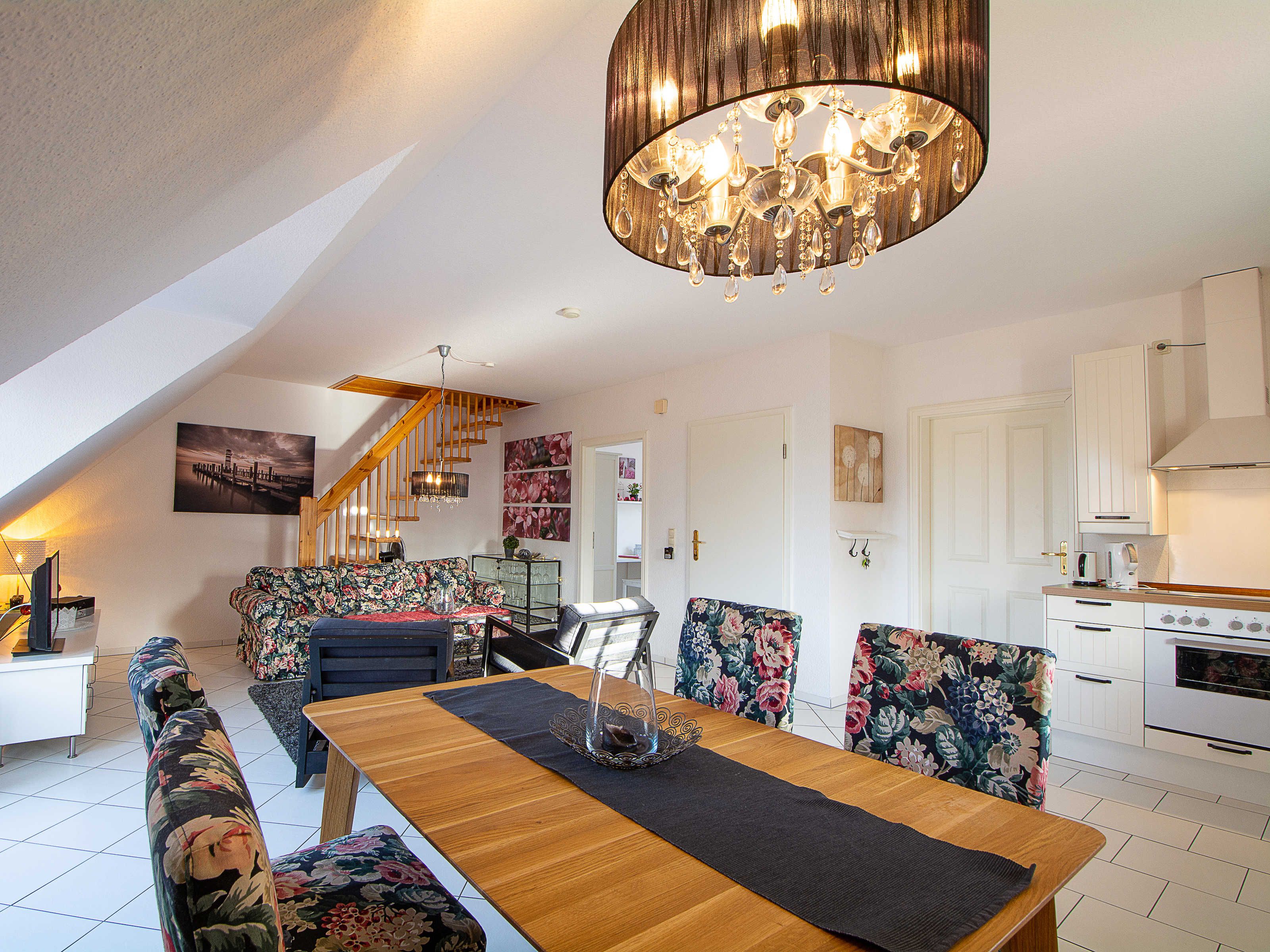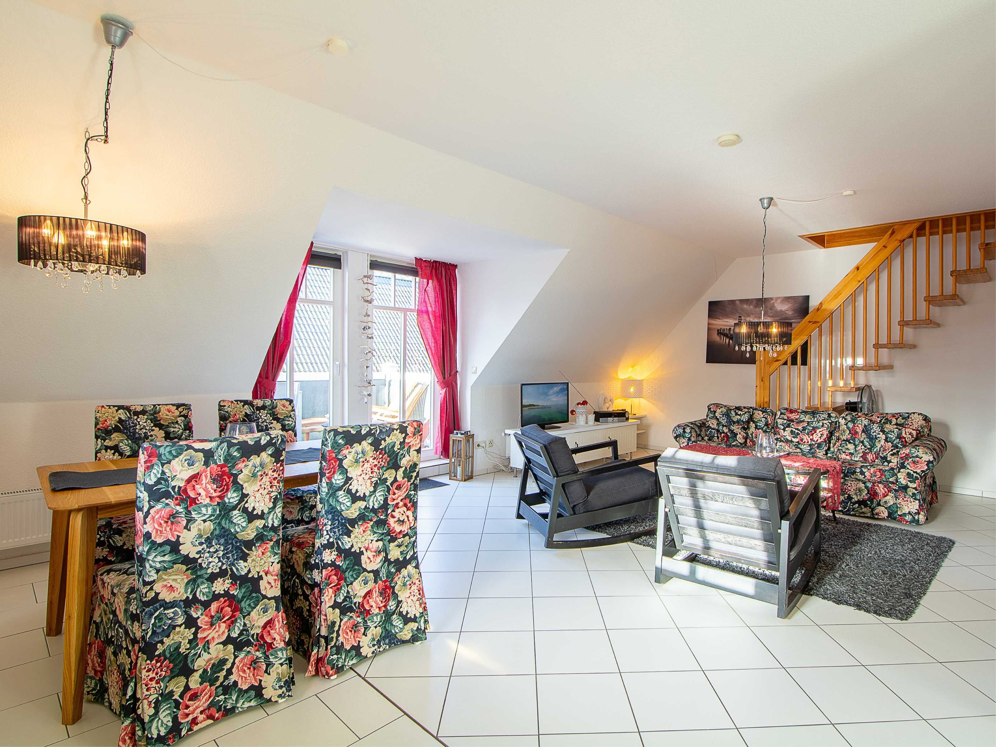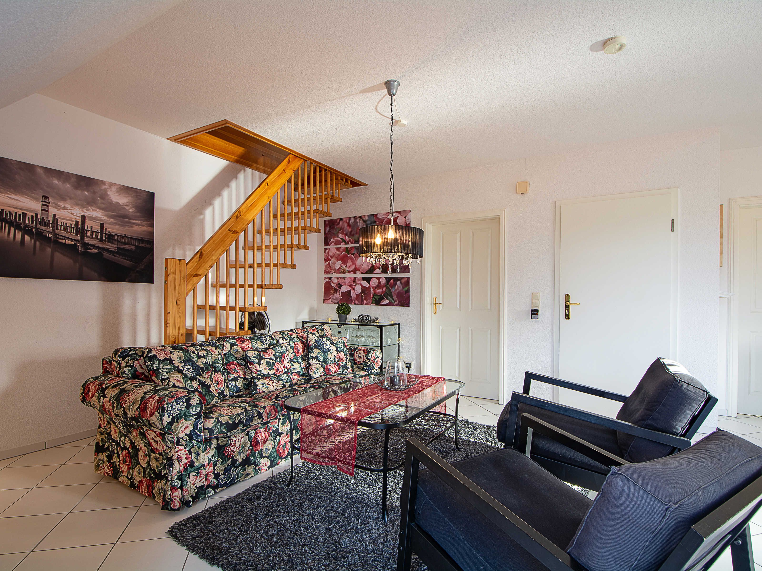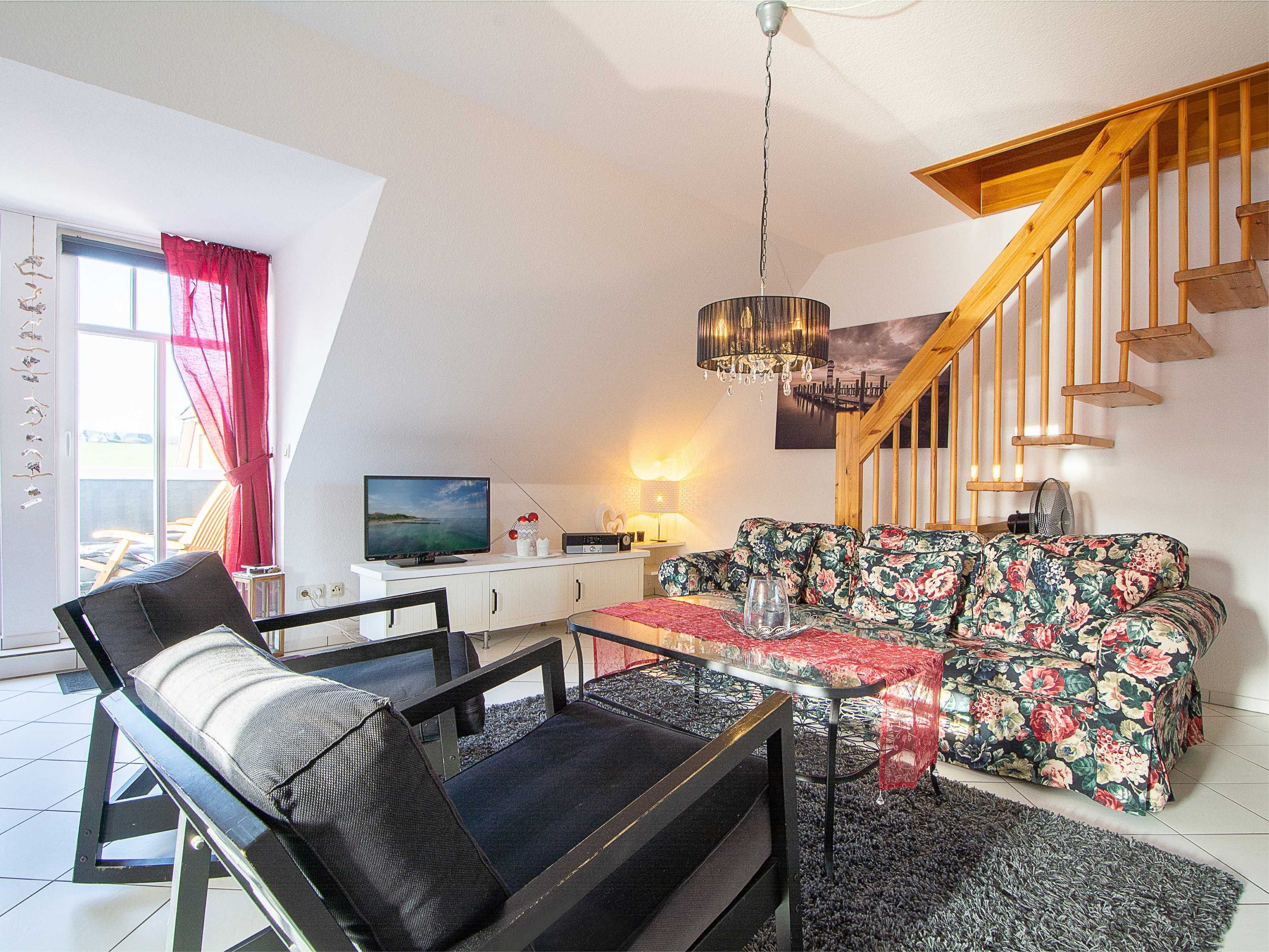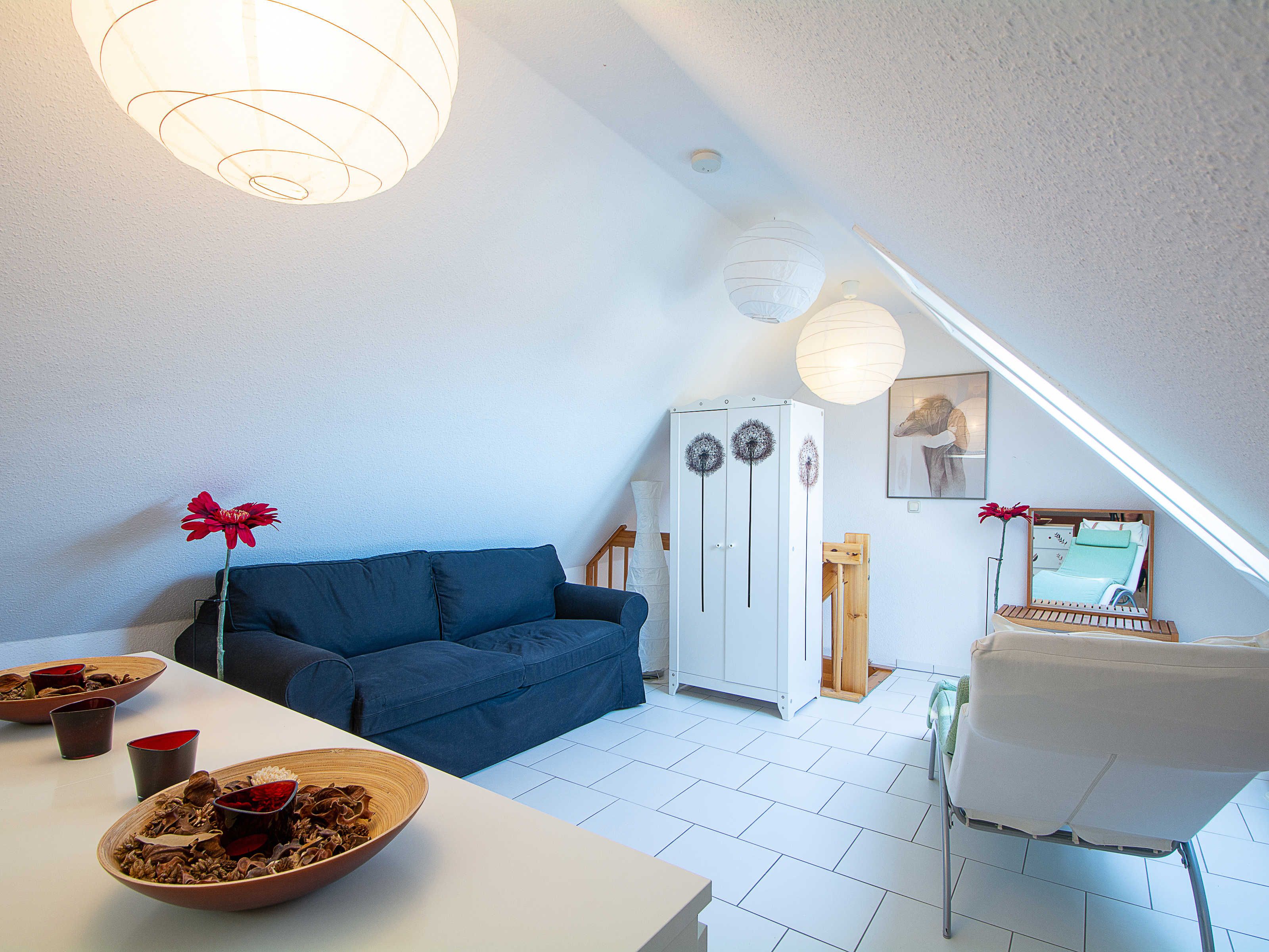 Sie wohnen in einer liebevoll eingerichteten 3-Raum-Wohnung von ca. 68 m², die über zwei Etagen verläuft. In der ersten Etage befinden sich das Wohnzimmer mit bequemer Sitzgarnitur, TV-Gerät und Küchenzeile (Herd, Kühlschrank, Geschirrspüler, Kaffeemaschine, Mikrowelle, Wasserkocher, Toaster), der Süd-Balkon und ein Schlafzimmer mit Kojenbett sowie das Bad mit Dusche und WC. Ein zweites Bad mit Badewanne und Waschmaschine schliesst sich hier an. Ein Schlafzimmer mit Doppelbett befindet sich im Dachgeschoss.