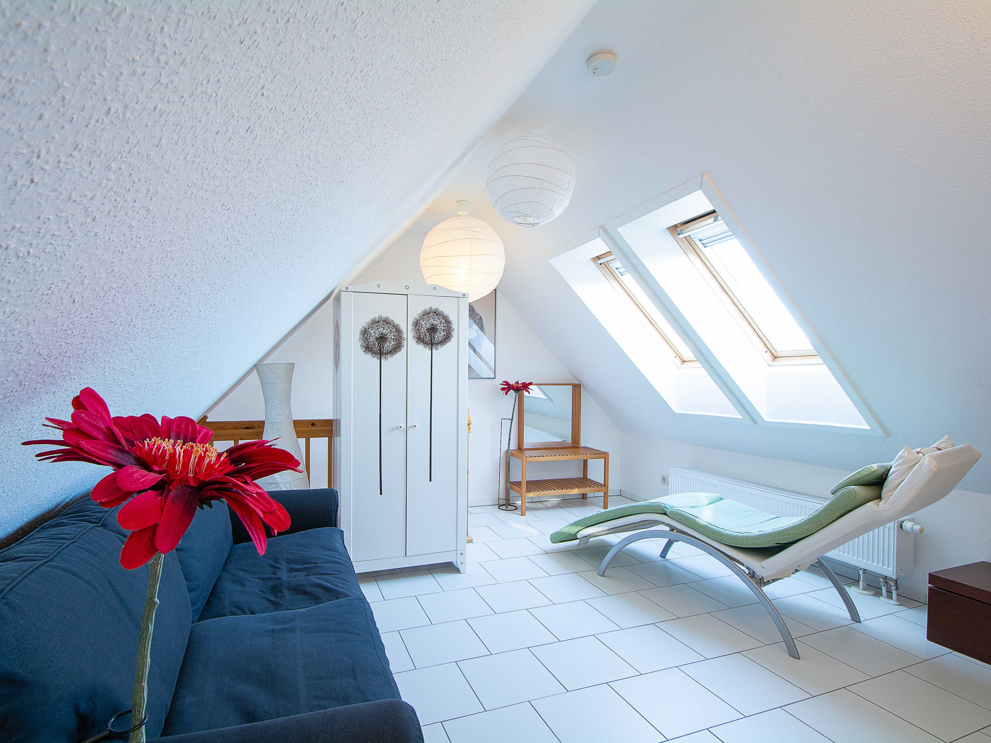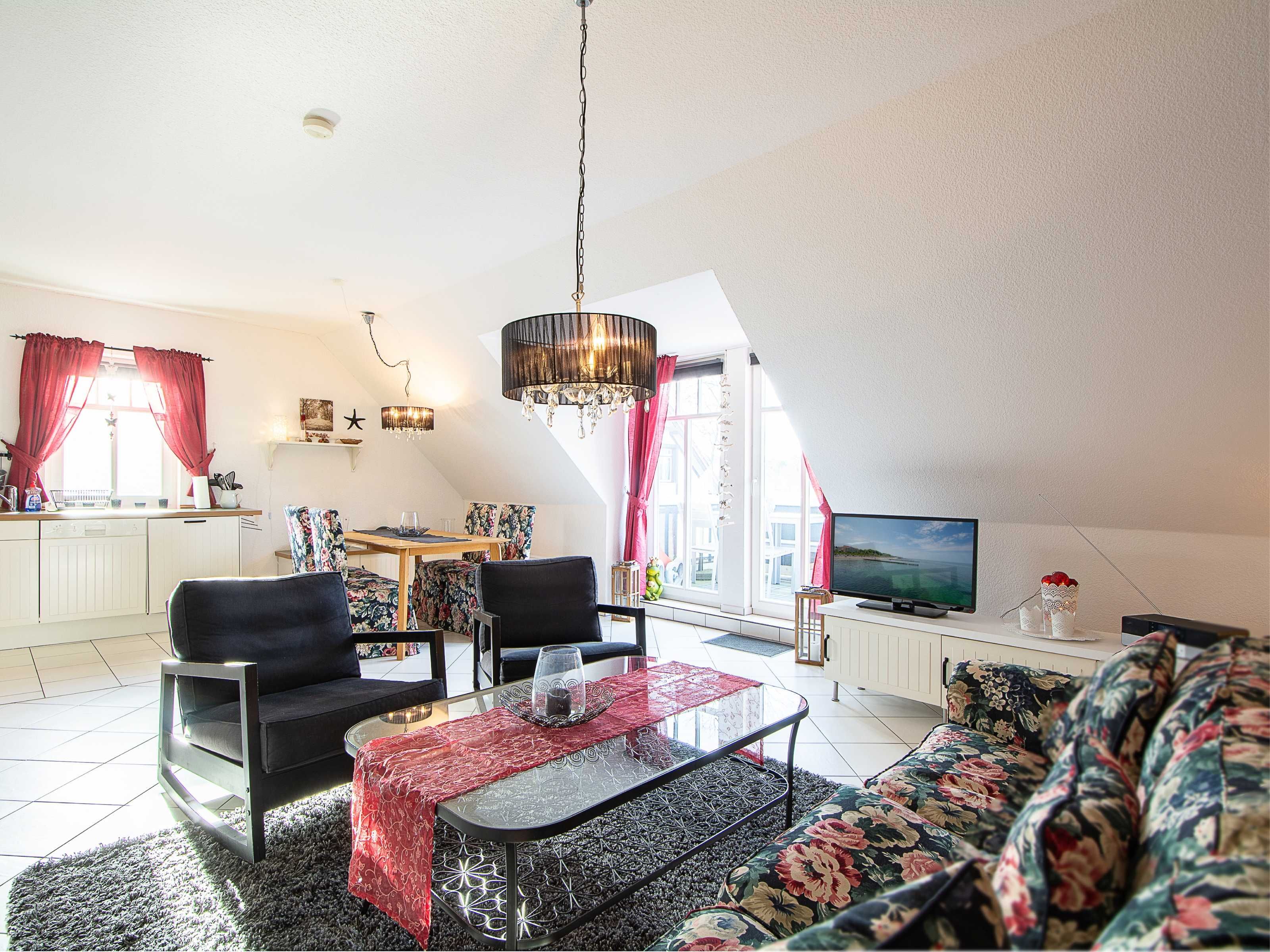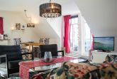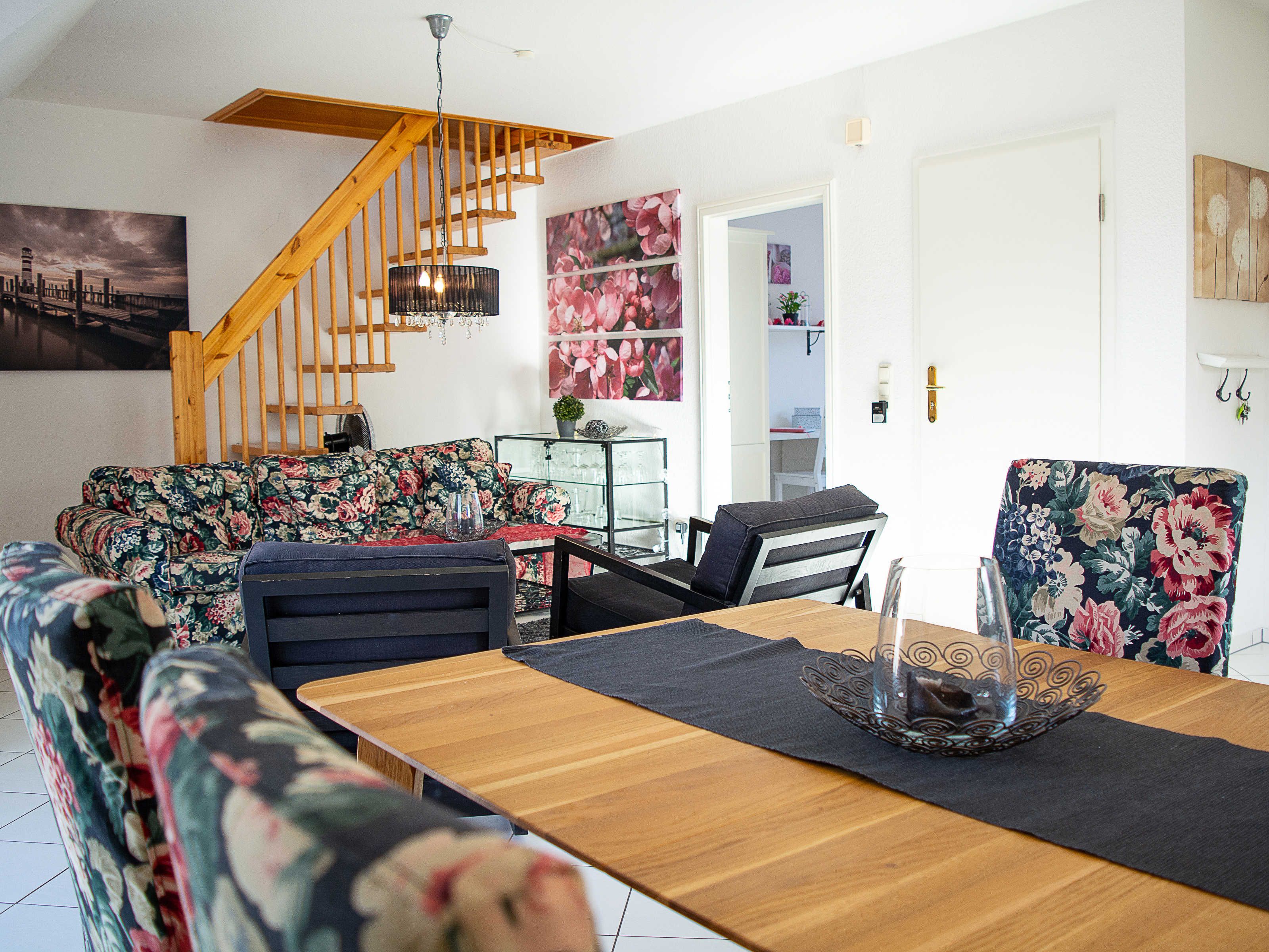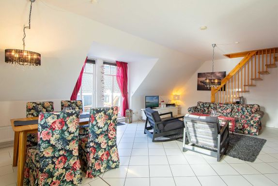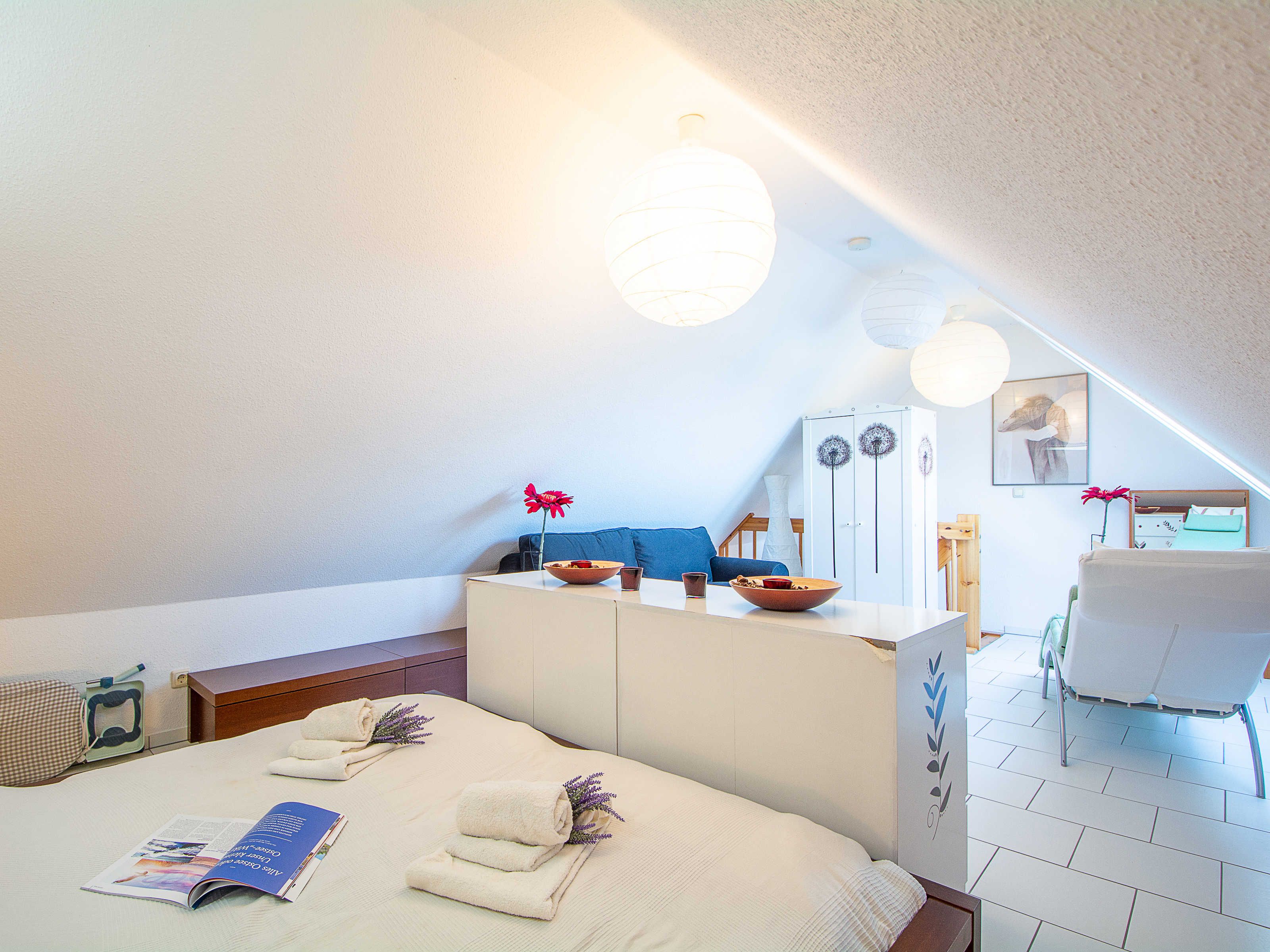 Sie wohnen in einer liebevoll eingerichteten 3-Raum-Wohnung von ca. 68 m², die über zwei Etagen verläuft. In der ersten Etage befinden sich das Wohnzimmer mit bequemer Sitzgarnitur, TV-Gerät und Küchenzeile (Herd, Kühlschrank, Geschirrspüler, Kaffeemaschine, Mikrowelle, Wasserkocher, Toaster), der Süd-Balkon und ein Schlafzimmer mit Kojenbett sowie das Bad mit Dusche und WC. Ein zweites Bad mit Badewanne und Waschmaschine schliesst sich hier an. Ein Schlafzimmer mit Doppelbett befindet sich im Dachgeschoss.