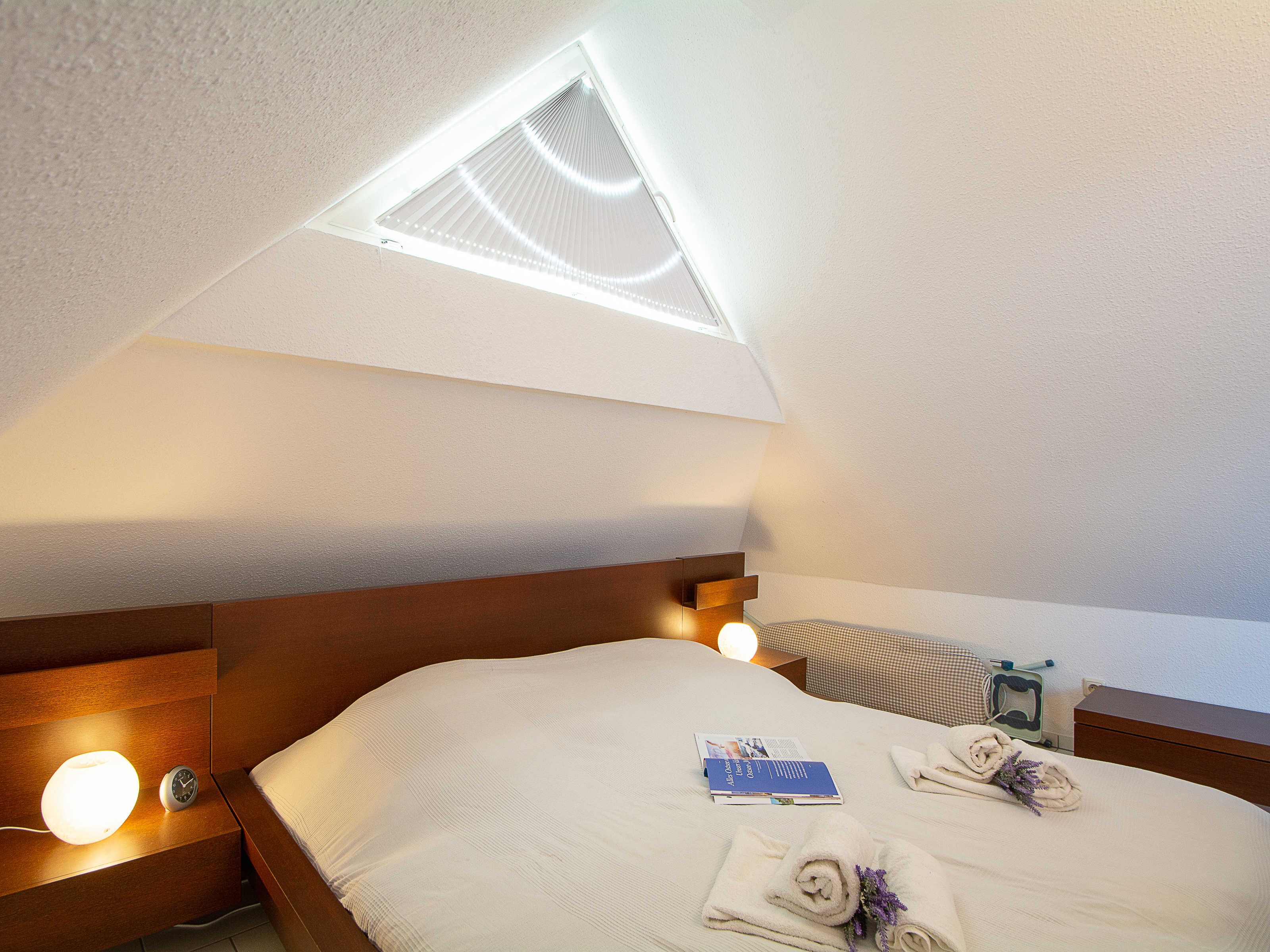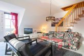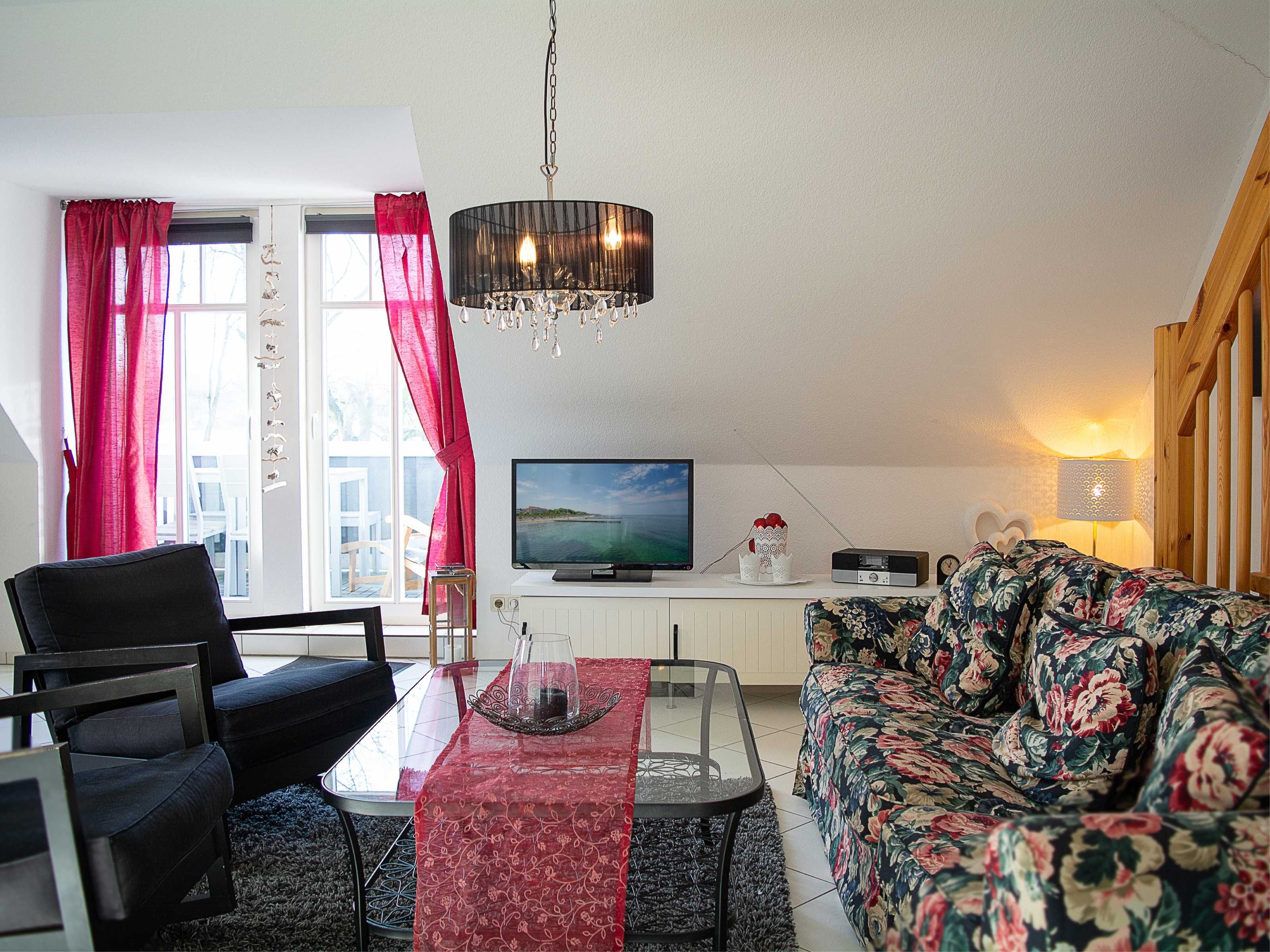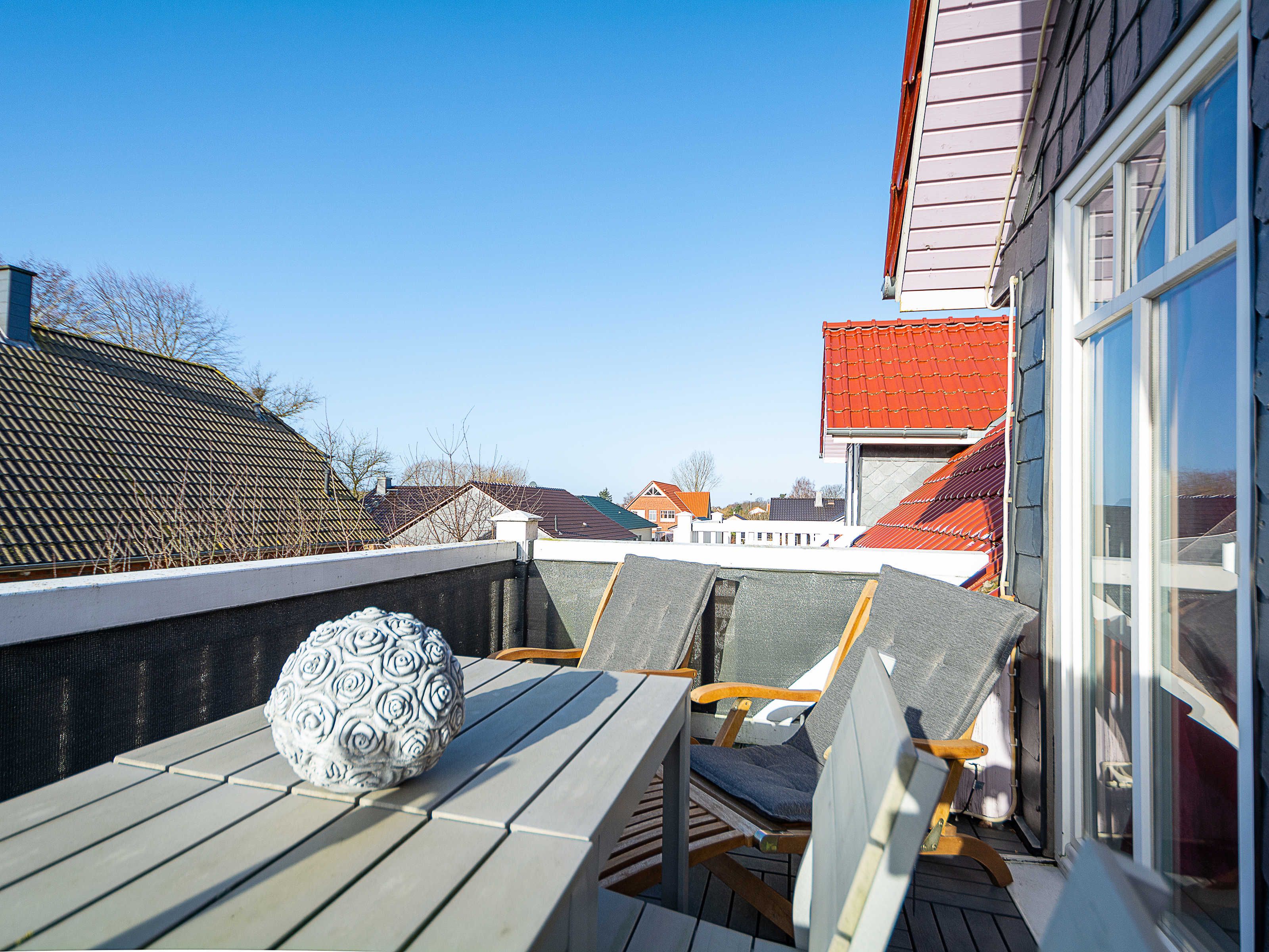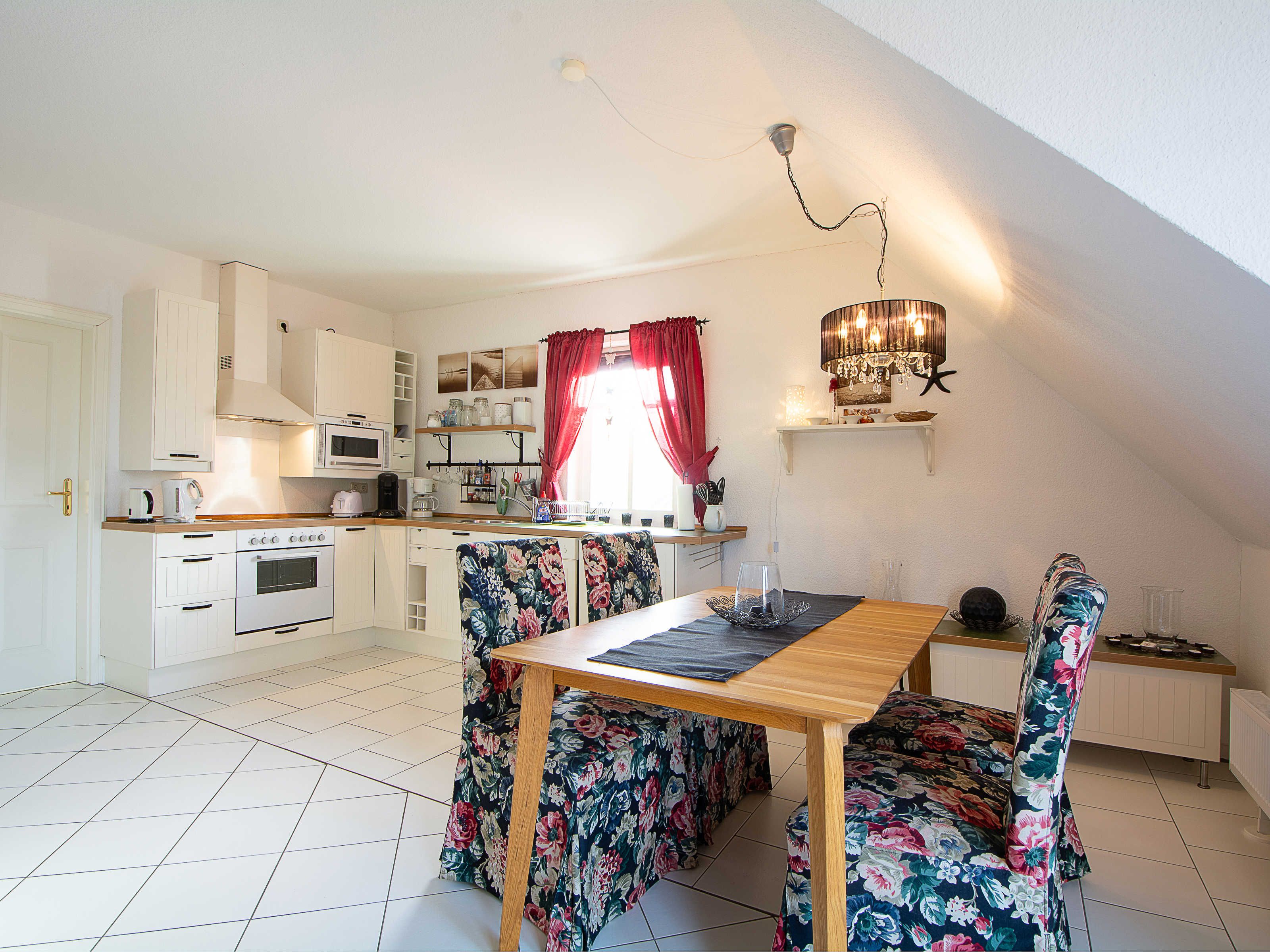 Sie wohnen in einer liebevoll eingerichteten 3-Raum-Wohnung von ca. 68 m², die über zwei Etagen verläuft. In der ersten Etage befinden sich das Wohnzimmer mit bequemer Sitzgarnitur, TV-Gerät und Küchenzeile (Herd, Kühlschrank, Geschirrspüler, Kaffeemaschine, Mikrowelle, Wasserkocher, Toaster), der Süd-Balkon und ein Schlafzimmer mit Kojenbett sowie das Bad mit Dusche und WC. Ein zweites Bad mit Badewanne und Waschmaschine schliesst sich hier an. Ein Schlafzimmer mit Doppelbett befindet sich im Dachgeschoss.