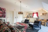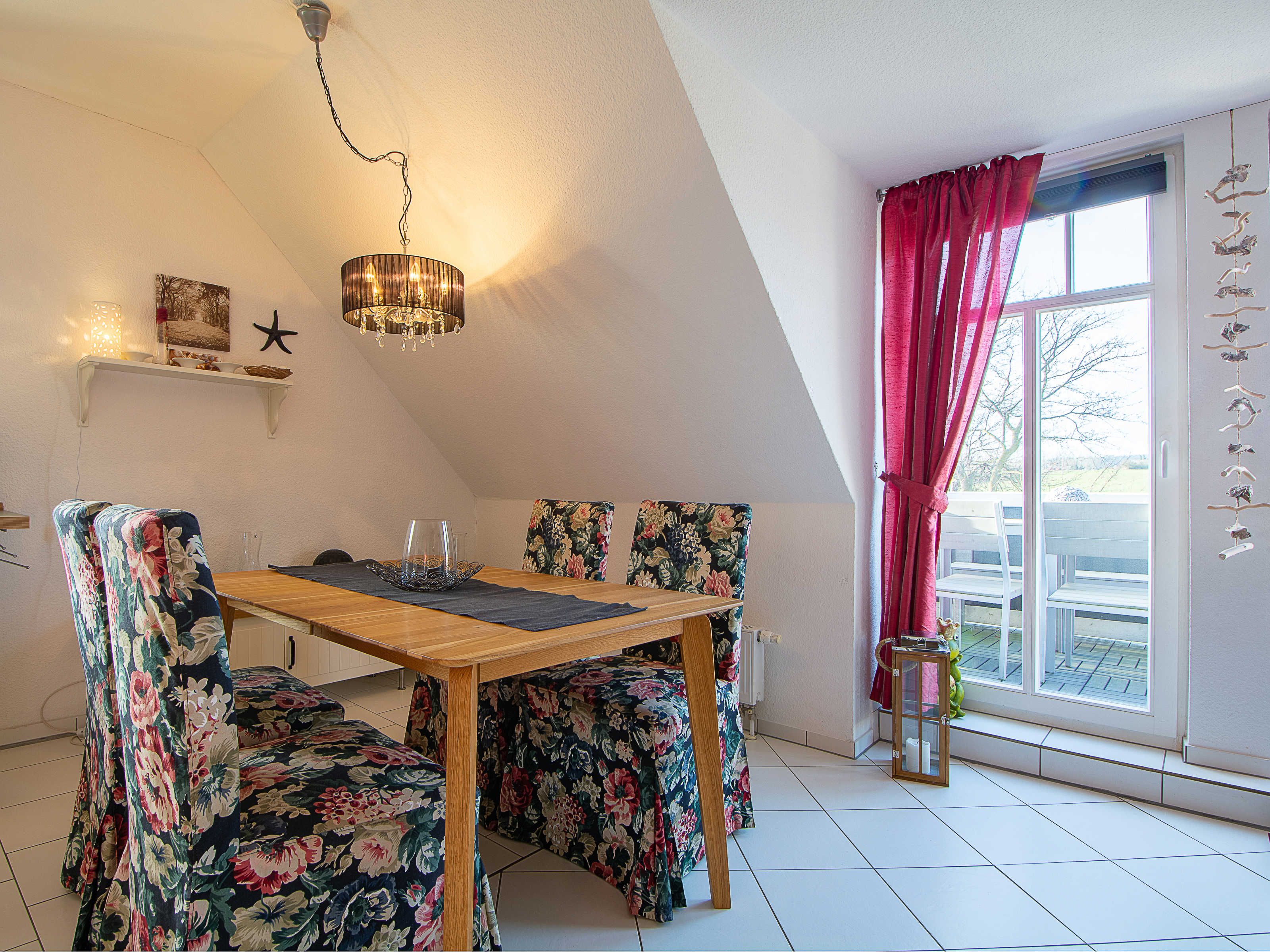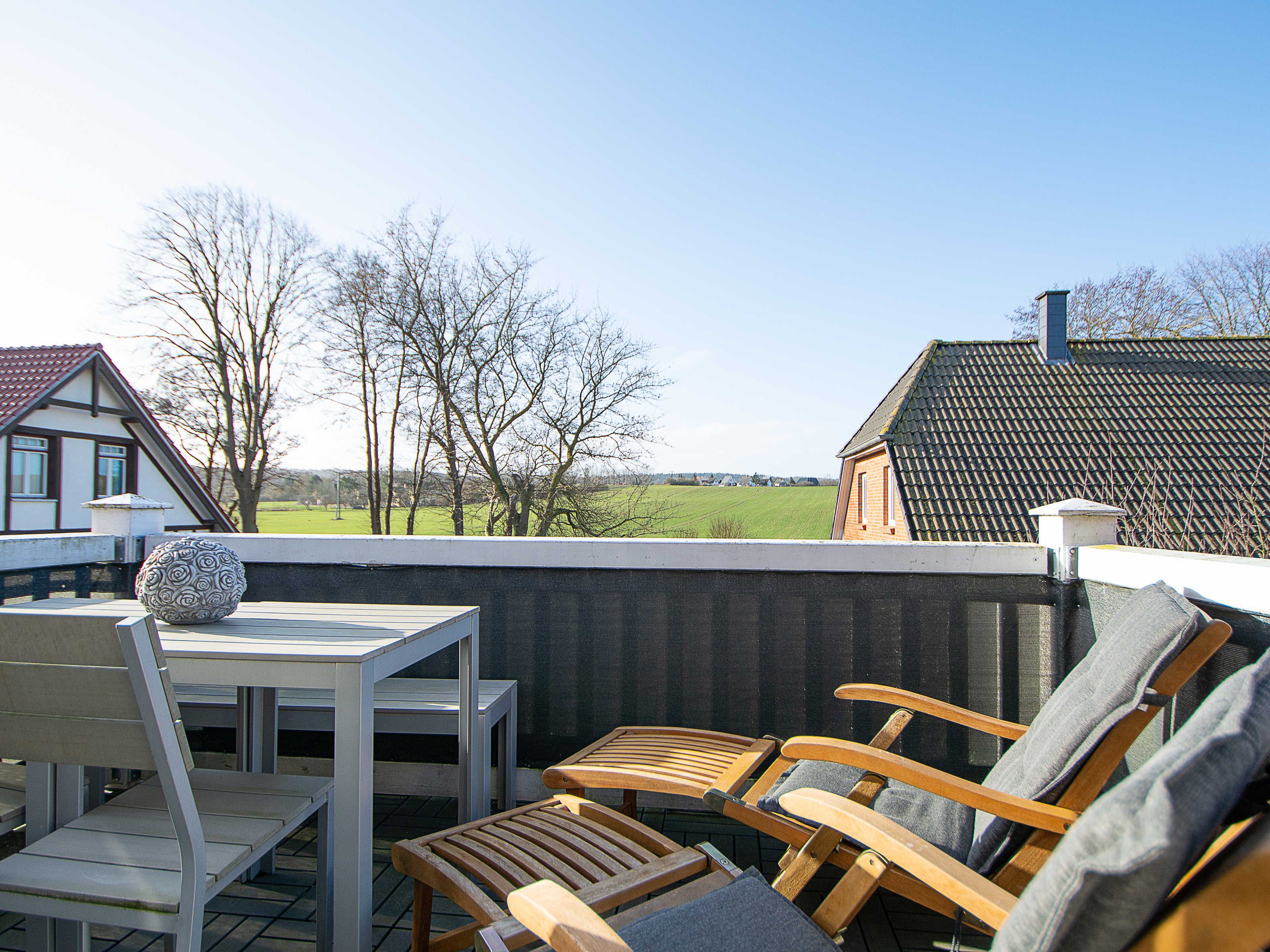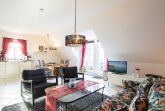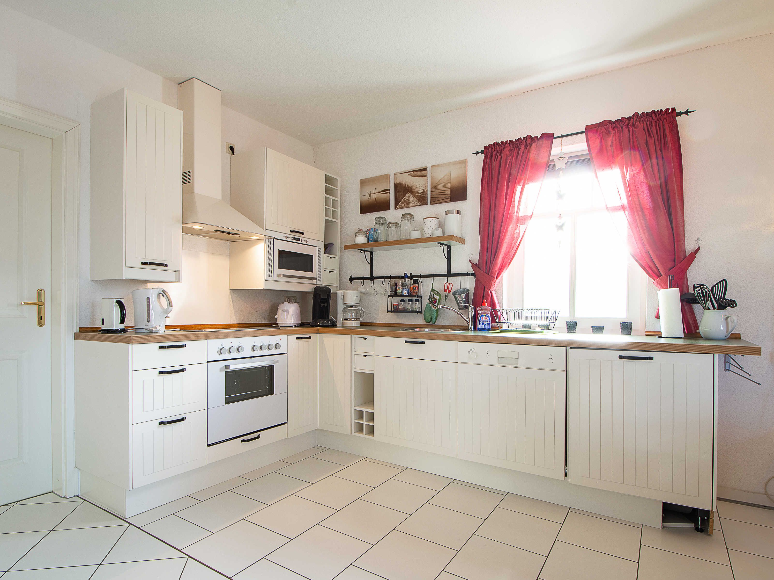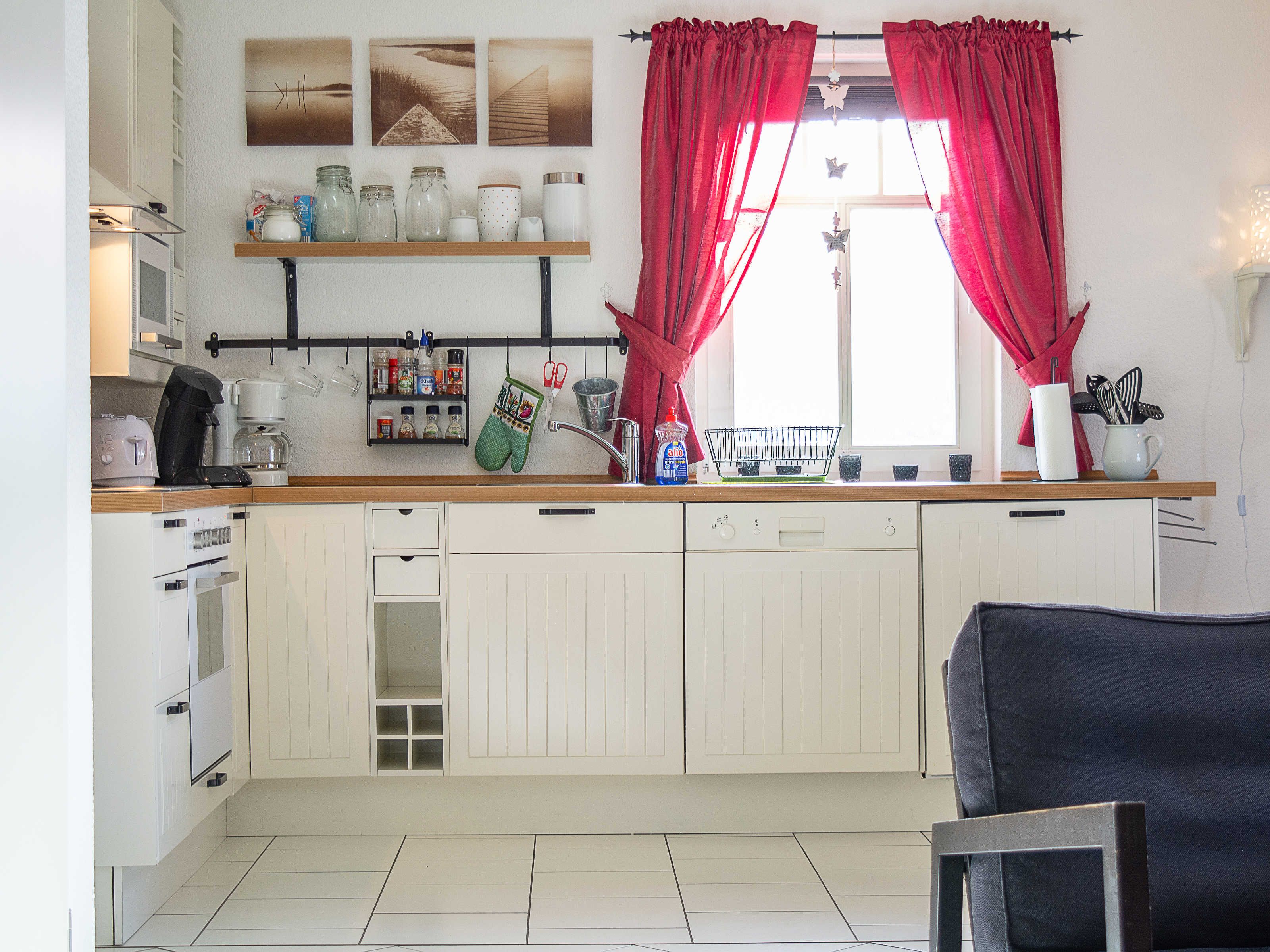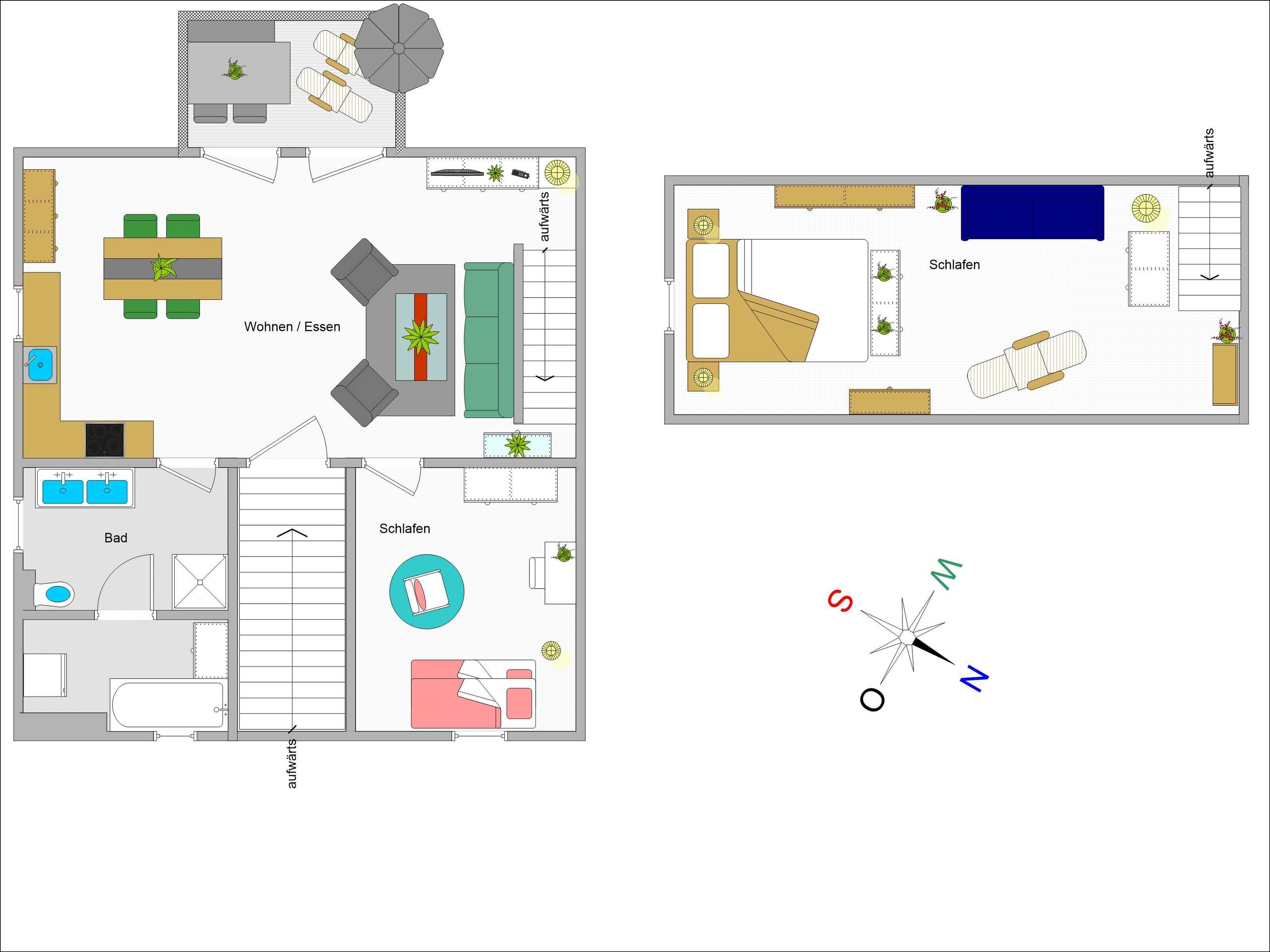Sie wohnen in einer liebevoll eingerichteten 3-Raum-Wohnung von ca. 68 m², die über zwei Etagen verläuft. In der ersten Etage befinden sich das Wohnzimmer mit bequemer Sitzgarnitur, TV-Gerät und Küchenzeile (Herd, Kühlschrank, Geschirrspüler, Kaffeemaschine, Mikrowelle, Wasserkocher, Toaster), der Süd-Balkon und ein Schlafzimmer mit Kojenbett sowie das Bad mit Dusche und WC. Ein zweites Bad mit Badewanne und Waschmaschine schliesst sich hier an. Ein Schlafzimmer mit Doppelbett befindet sich im Dachgeschoss.