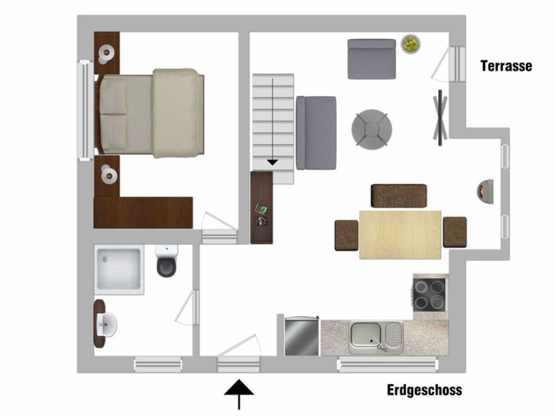 • Das Schlafzimmer im Erdgeschoss verfügt über ein Doppelbett (1,80 x 2,00m) und einem Kleiderschrank
