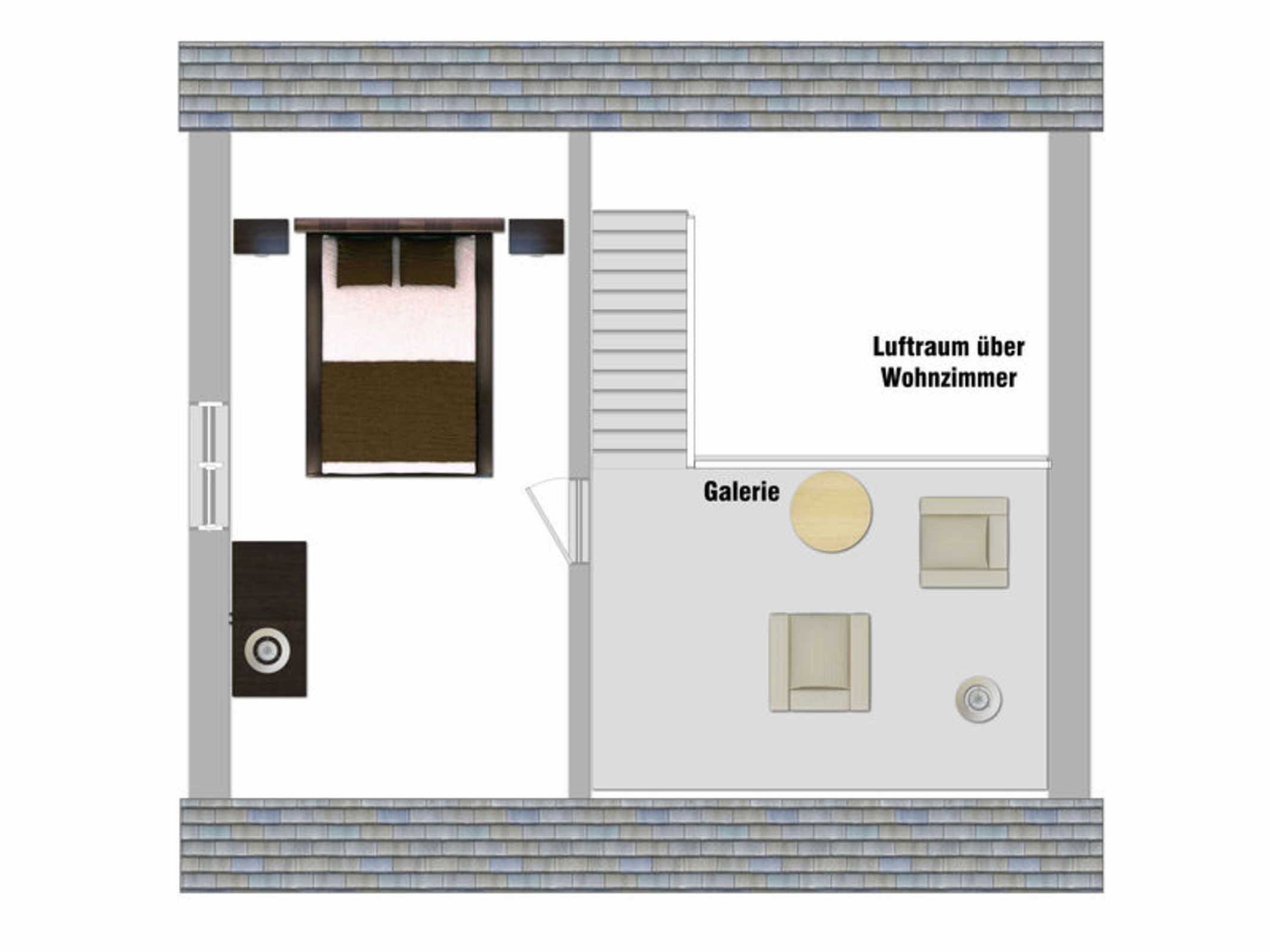 • Über eine steile Eisentreppe gelangen Sie vom Wohnzimmer in die Galerie im Obergeschoss