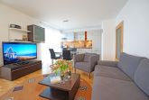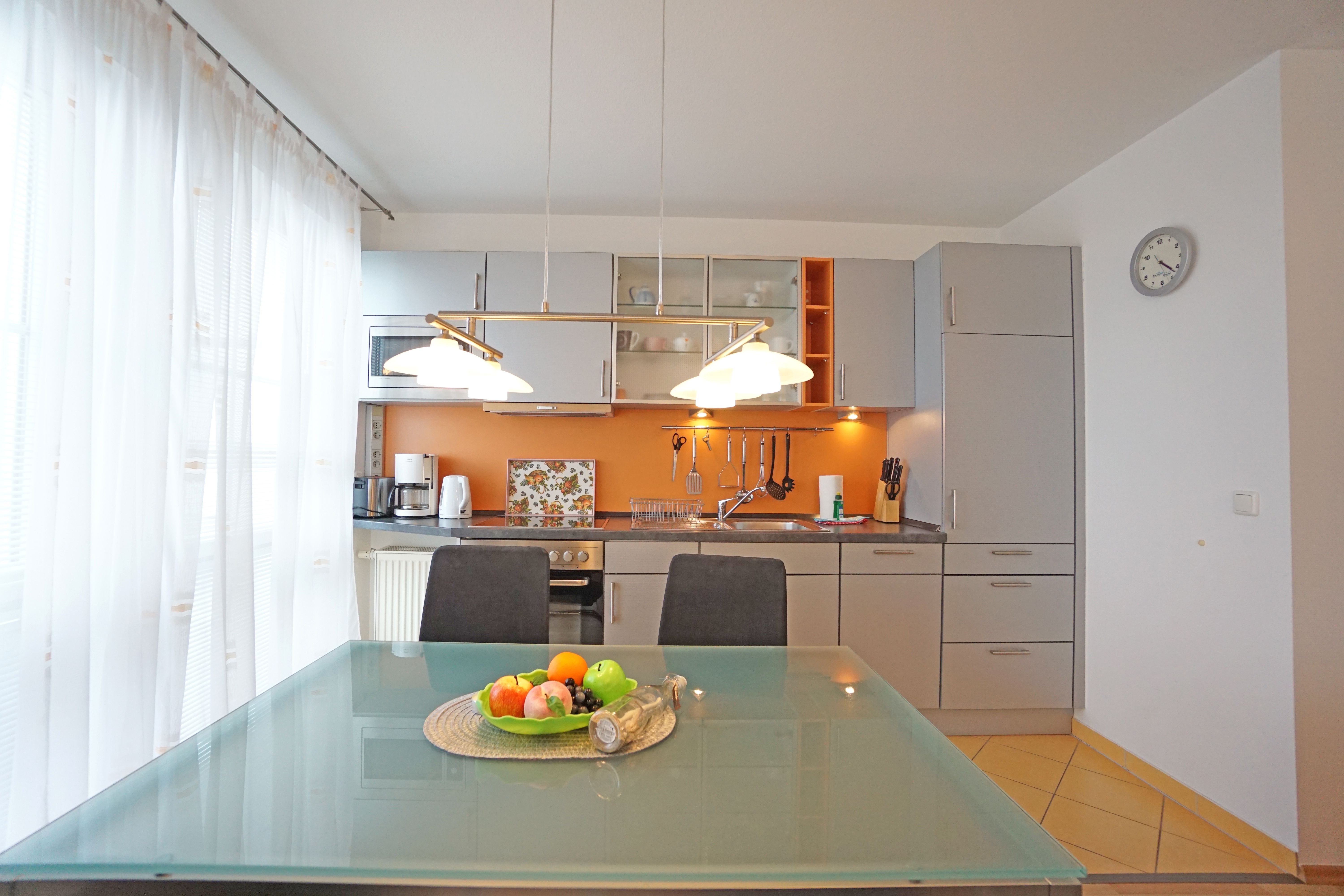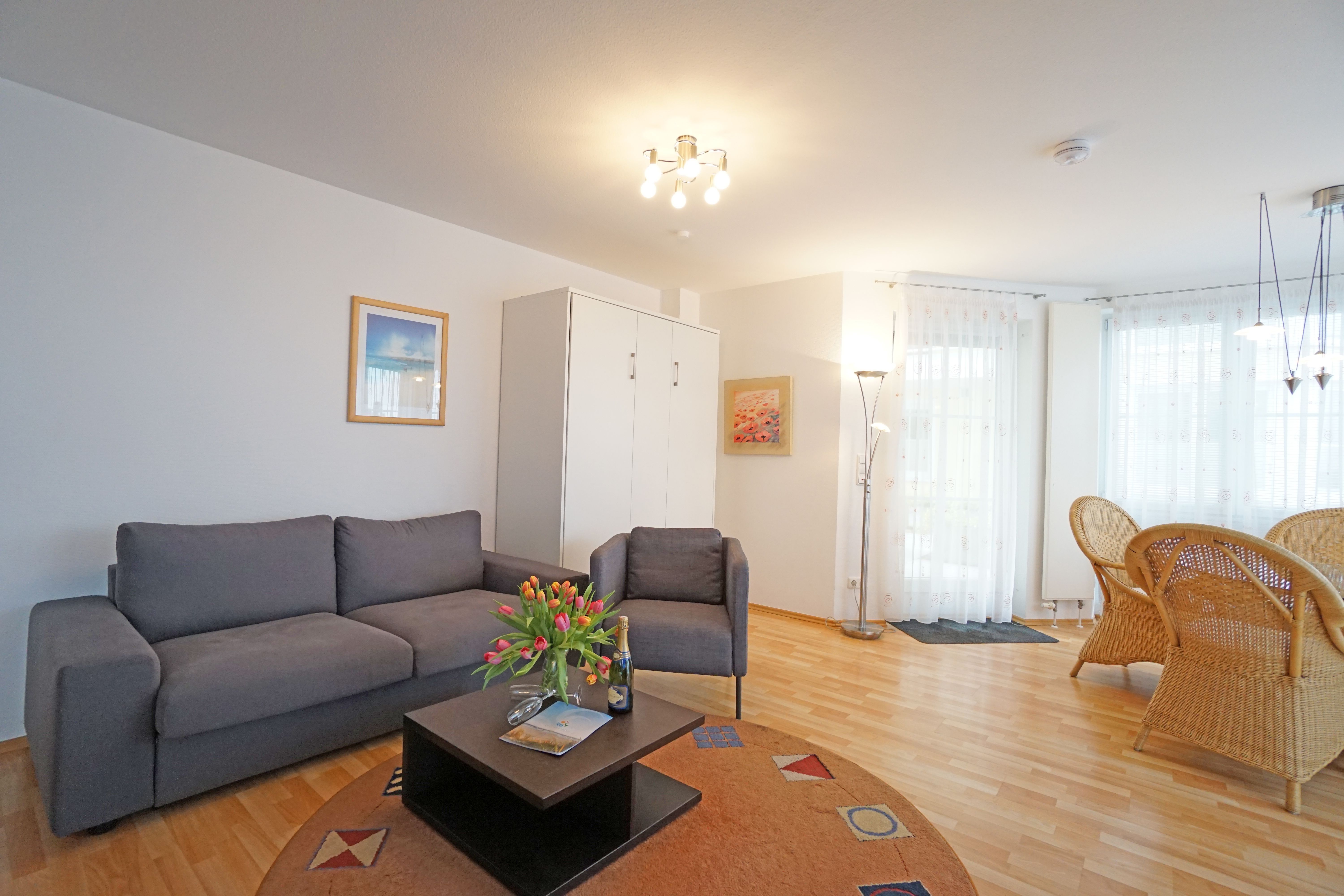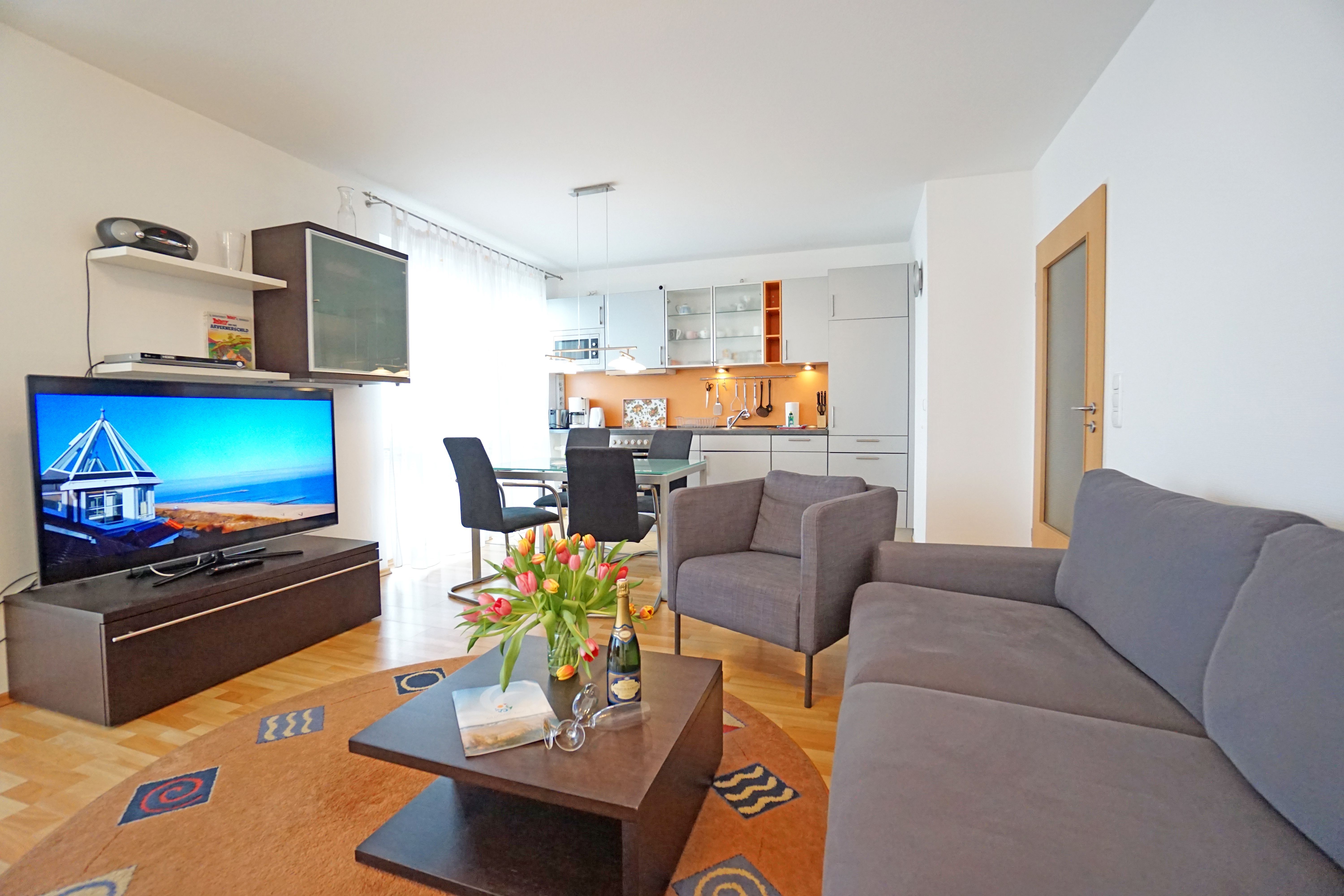 Die modern eingerichtete 2-Zimmerwohnung im Erdgeschoss der Dünenresidenz, lädt mit ihrer großzügigen Terrasse und direktem Meerblick zum Verweilen ein. Ihnen steht ein großes Wohnzimmer mit Schlafcouch für 2 Personen, einem komfortablen Schrankbett zur Verfügung. Im Wohnzimmer befindet sich die offene Küchezeile mit Esstisch. Das Schlafzimmer ist mit einem Doppelbett und einem 2. Fernseher ausgestattet. Außerdem steht Ihnen ein modernes Duschbad zur Verfügung. Zur Wohnung gehört ein kostenfreier Tiefgaragenplatz (Nummer 53).