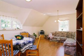 Die Ferienwohnungen befinden sich in den oberen Etagen eines rekonstruierten strohgedeckten Bauernhauses, teilweise mit Blick auf den großen Jasmunder Bodden. Das Ferienhaus befindet sich freistehend auf dem großen Grundstück und verfügt über 2 Terrassen.