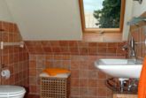 Backofen. Das moderne Bad verfügt über Dusche, WC, Waschbecken und Fenster.
