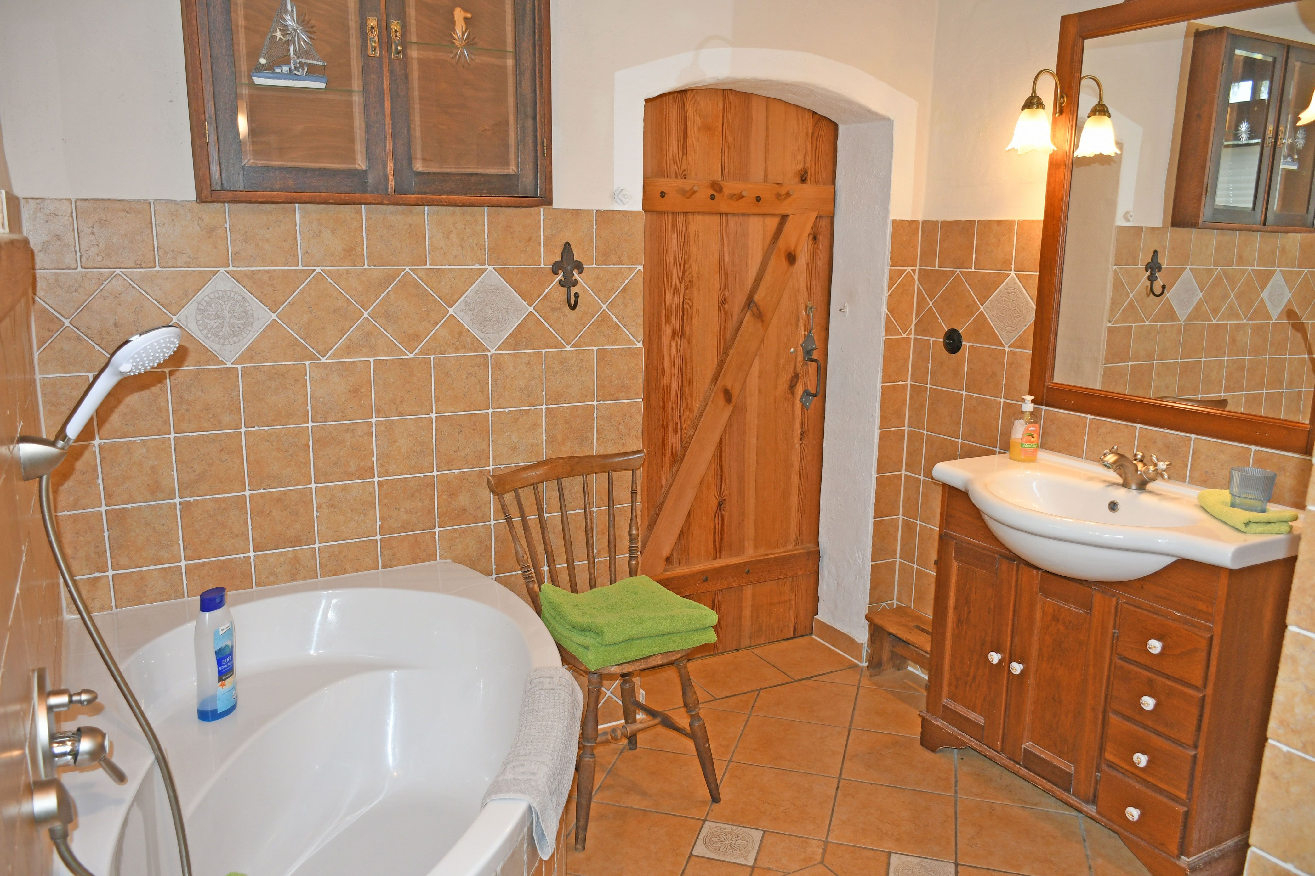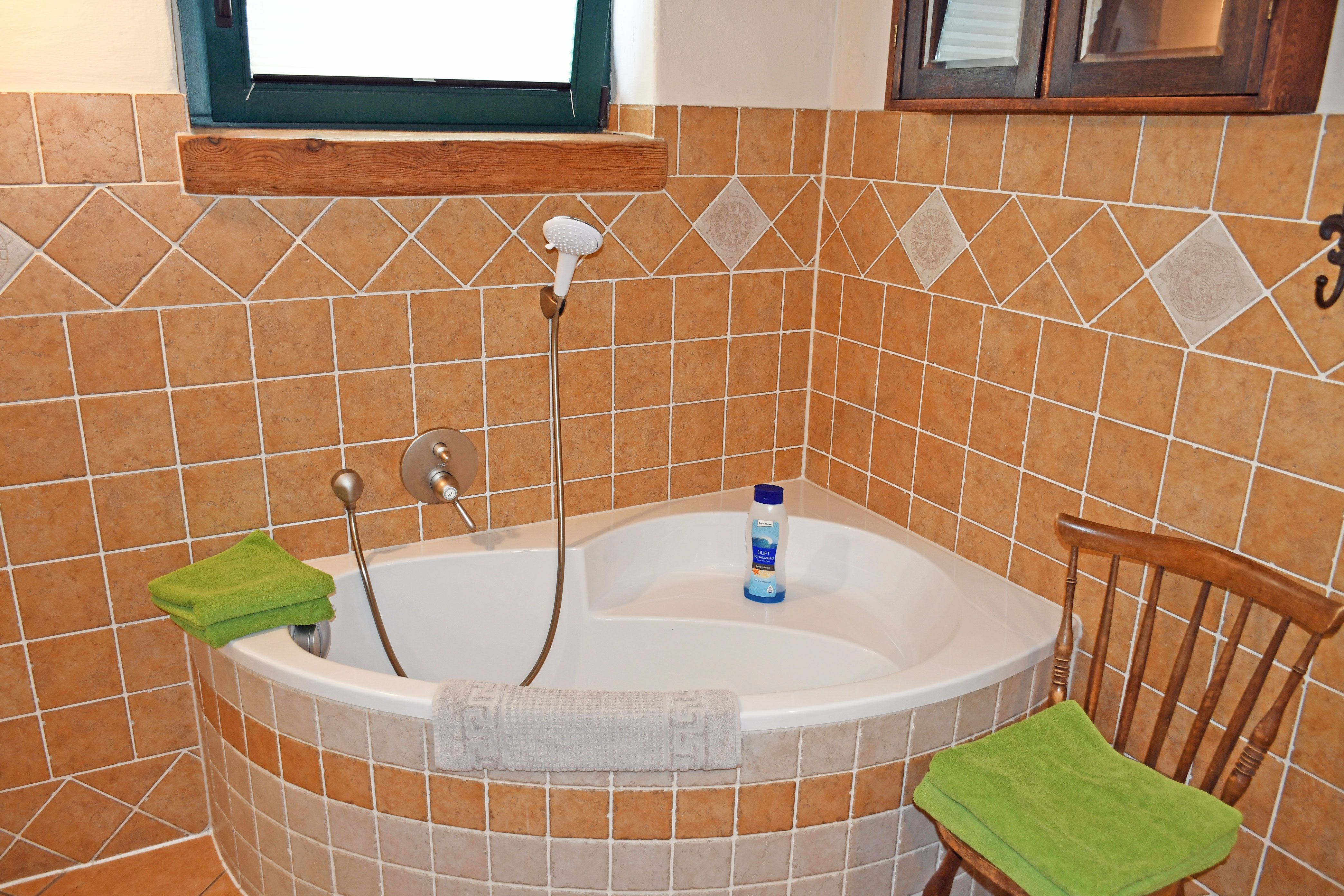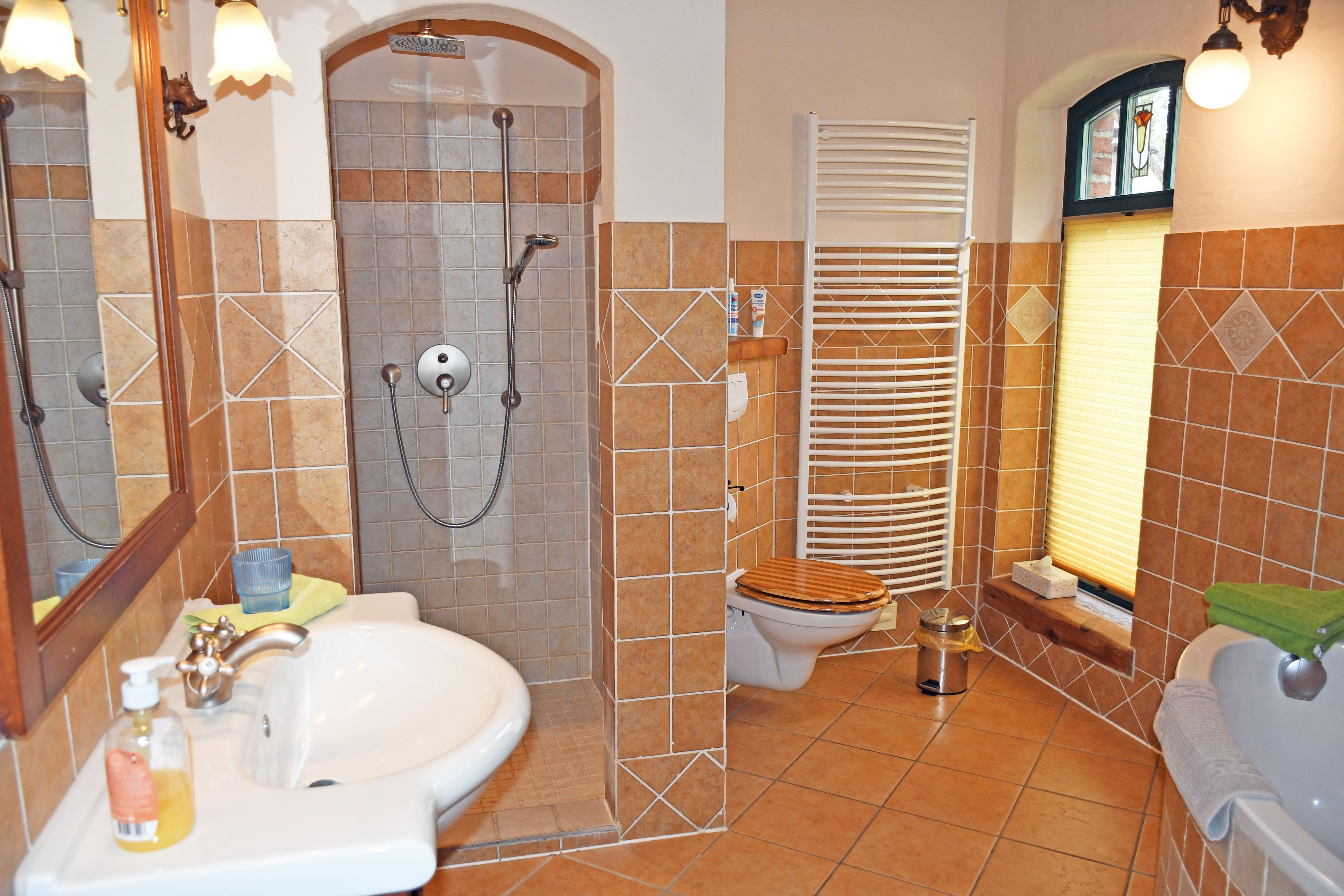 Das Bad verfügt über Fenster, eine Dusche, eine zusätzliche Badewanne, WC und Handtuchtrockner.