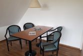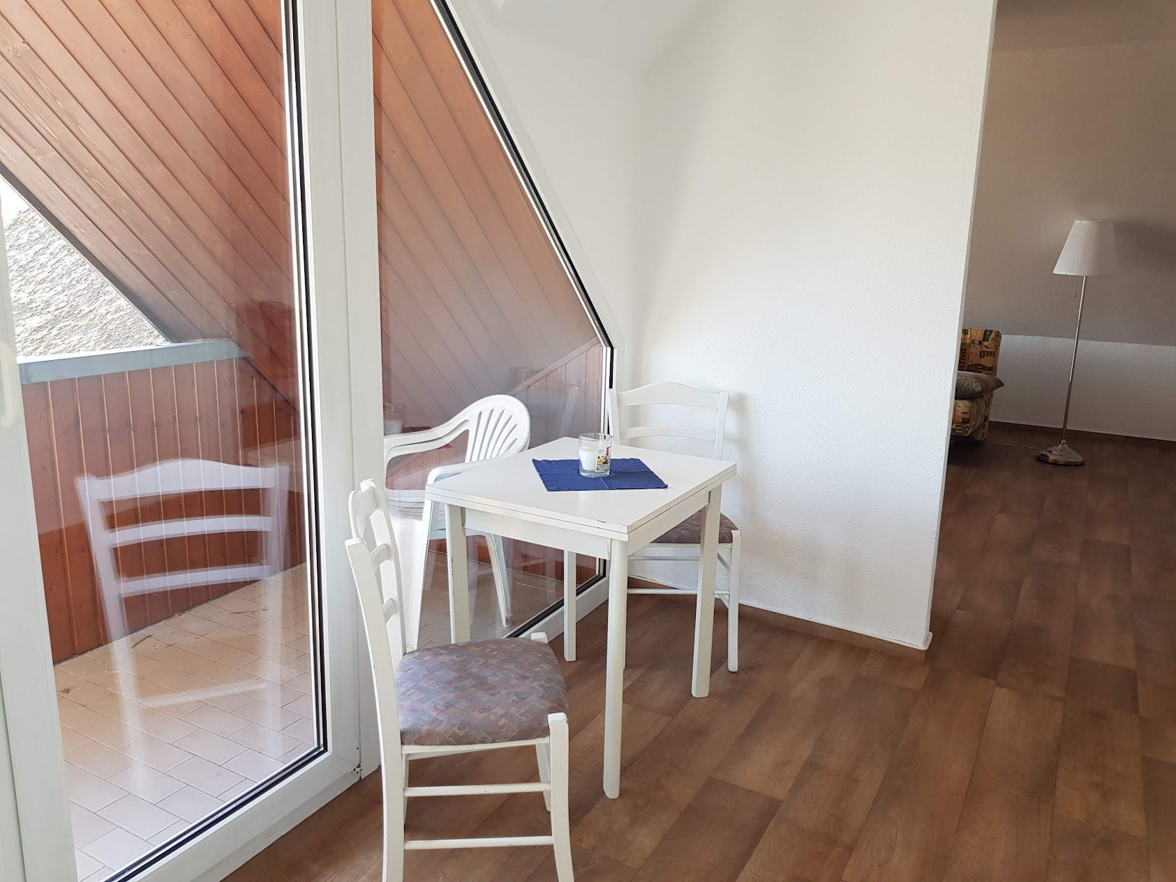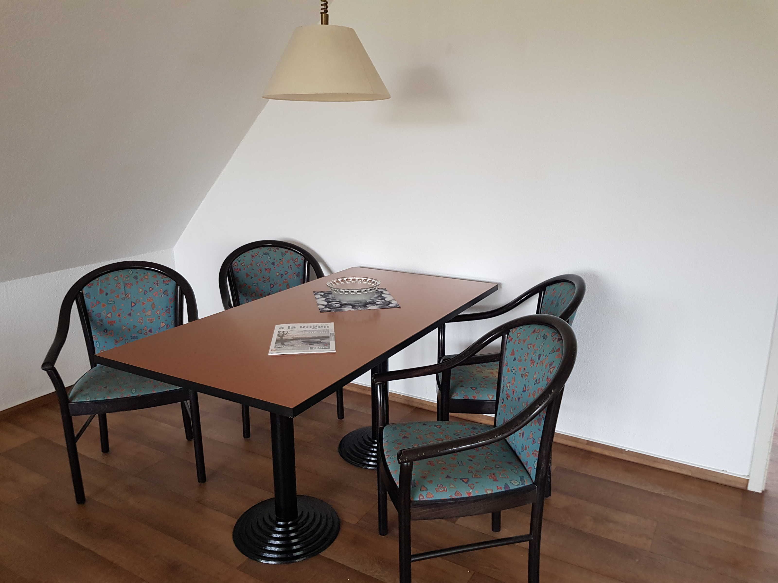 • Wohnzimmer mit ausziehbarer Couch und Esstisch für 4 Personen.