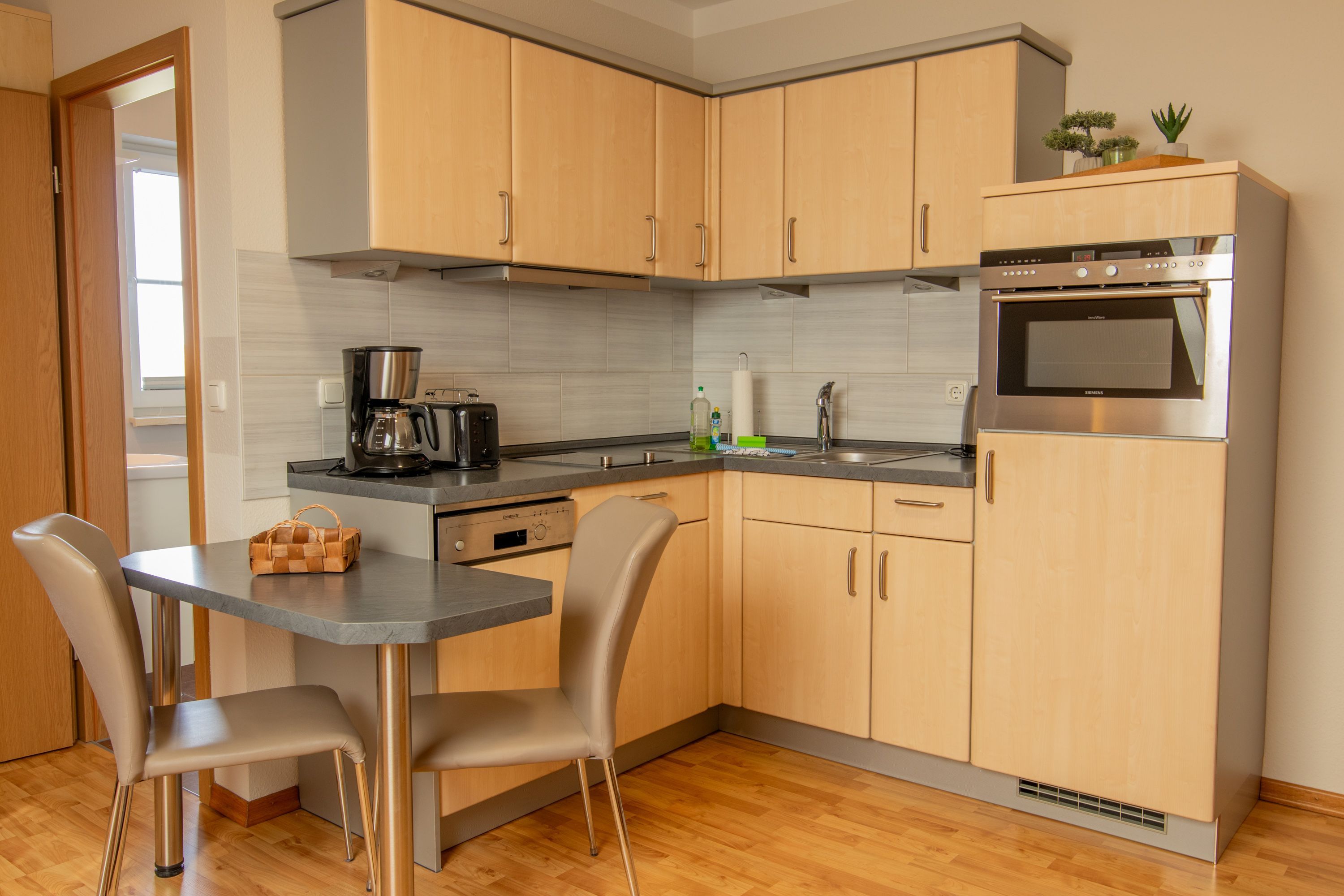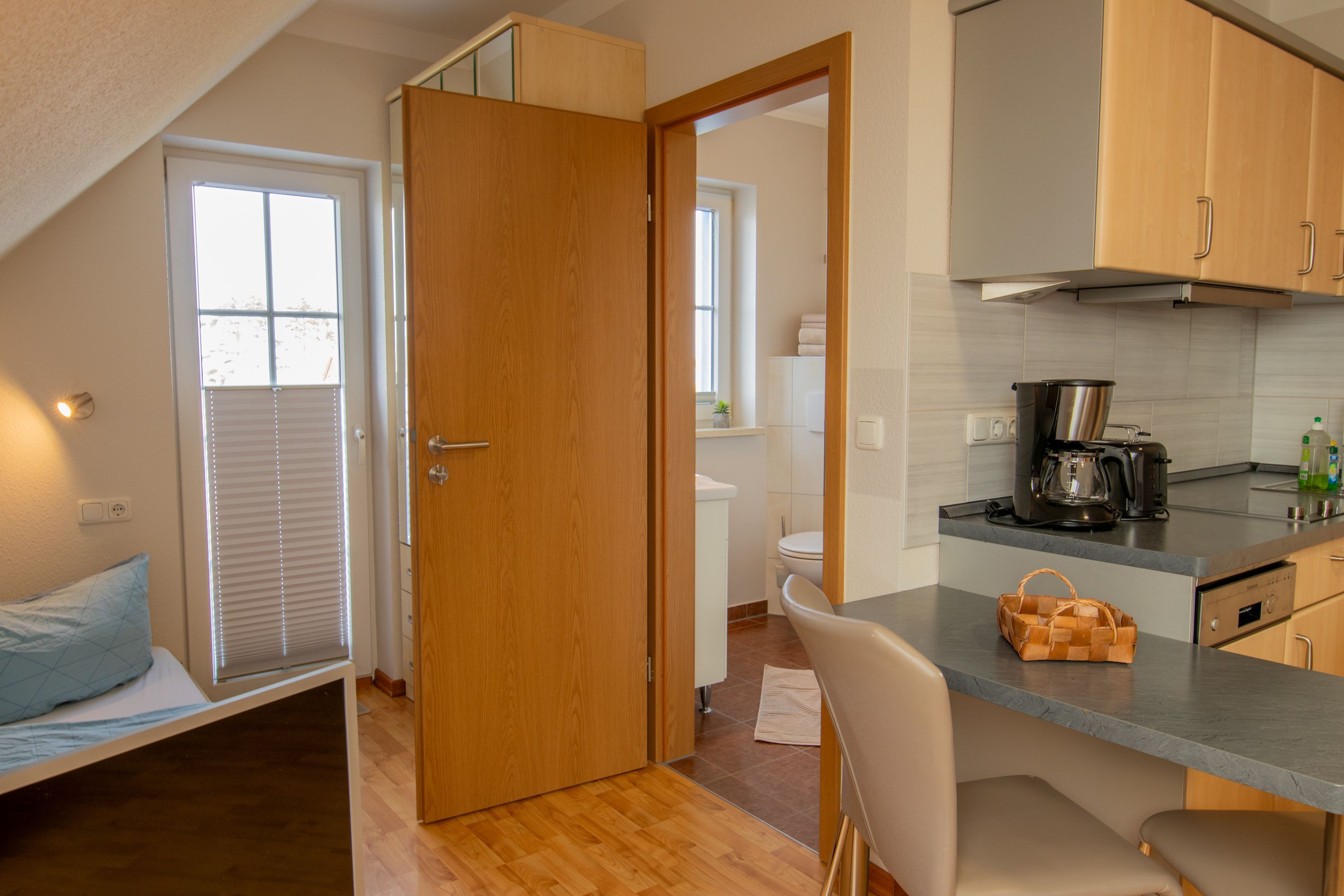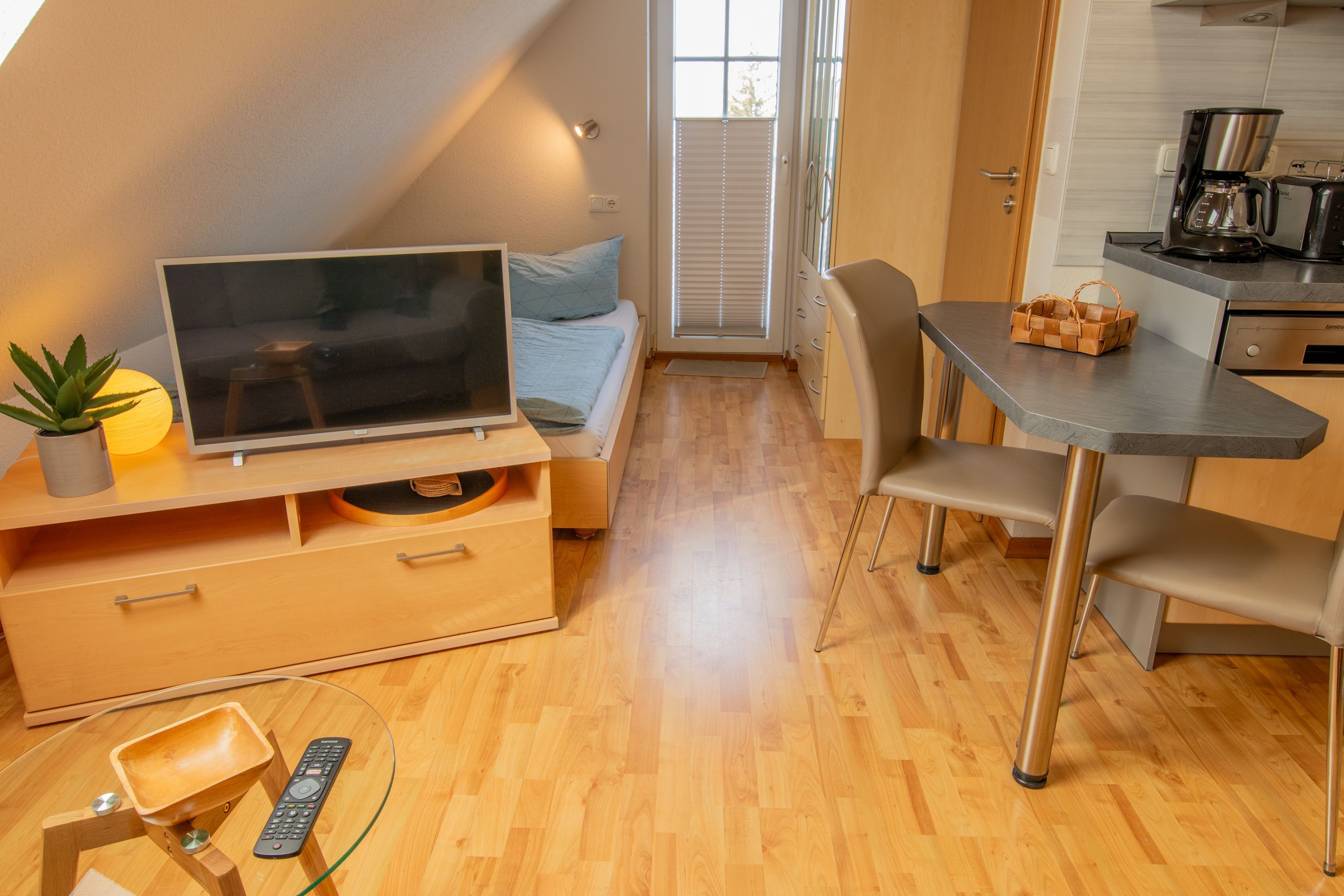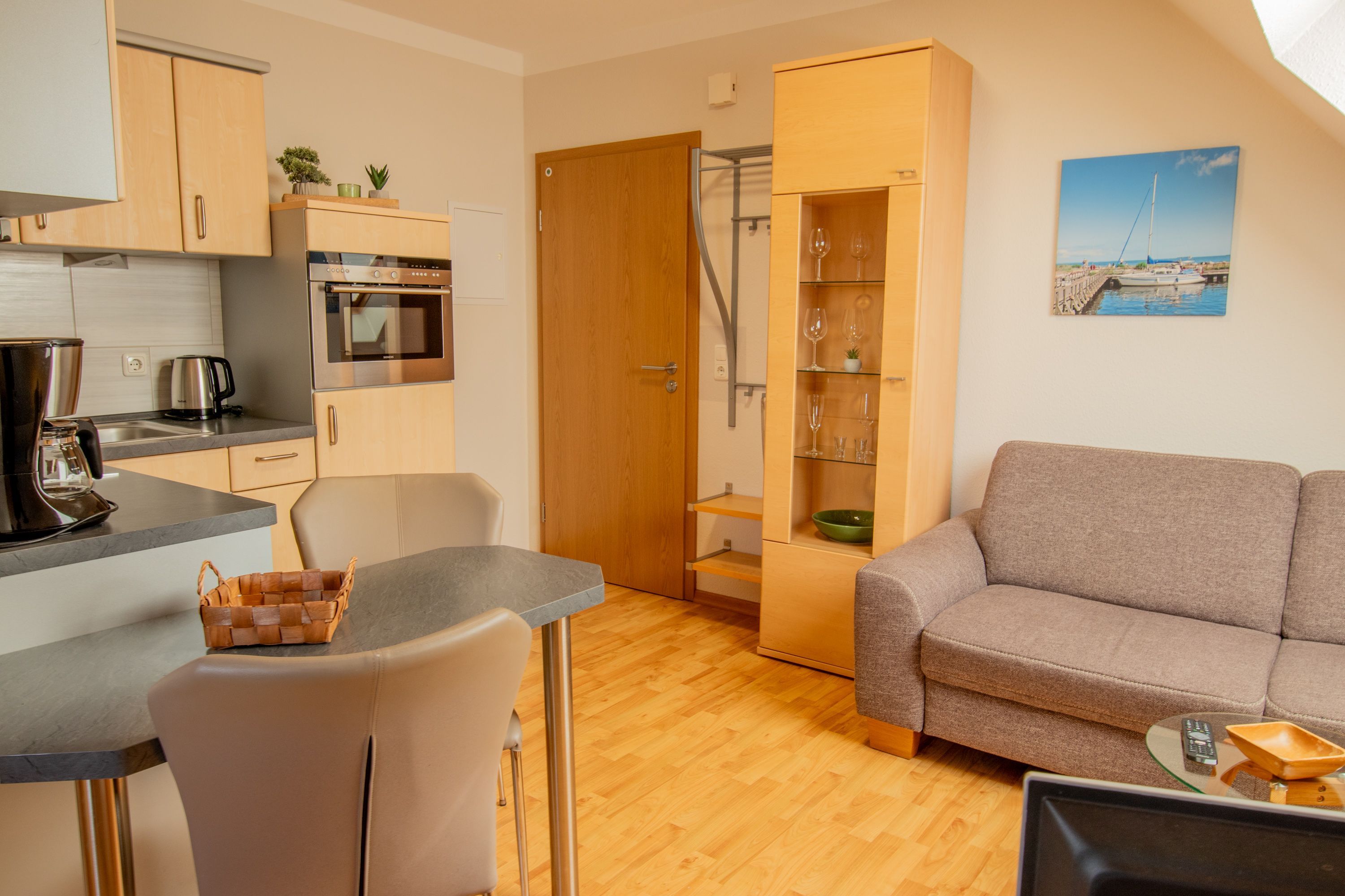 Die Ferienwohnung 3 im Blu Hus in Freest liegt im Dachgeschoss und bietet auf 18 m² einen gemütlichen Rückzugsort für 2 Personen. Sie ist ideal für alle, die es kompakt und praktisch mögen, ohne auf Komfort verzichten zu müssen. Der Wohn- und Schlafbereich ist offen gestaltet und kombiniert ein bequemes Sofa, einen Fernseher sowie ein Doppelbett  (140x200). Ein Kleiderschrank bietet ausreichend Stauraum für deine persönlichen Dinge. Die offene Küche ist mit einem Kombiofen, einem 2-Platten-Kochfeld, einem Geschirrspüler, Kochutensilien und allem Nötigen für die Selbstverpflegung ausgestattet. Besonders schön ist der direkte Zugang zum Balkon mit Blick auf das Wasser, bei klarer Sicht kannst du sogar bis nach Rügen und Usedom schauen. Das Badezimmer verfügt über eine Dusche und ein WC. Im Haus stehen dir außerdem eine Waschmaschine und ein Trockner zur Verfügung, die du gegen Gebühr nutzen kannst. Die Nähe zum Hafen, zum Strand und zur Natur macht diese kleine Wohnung zum idealen Ort für eine entspannte Auszeit an der Ostseeküste.