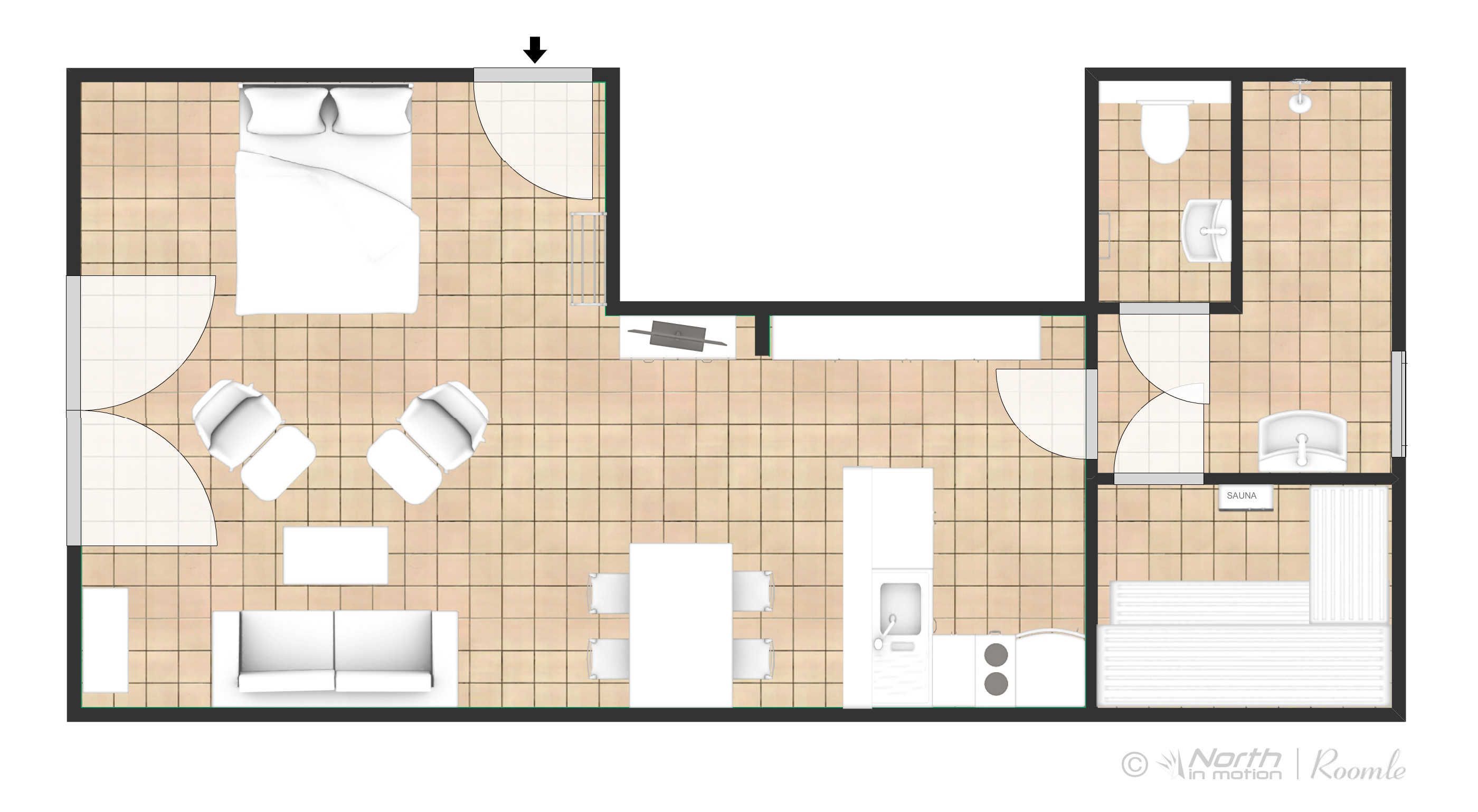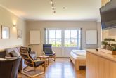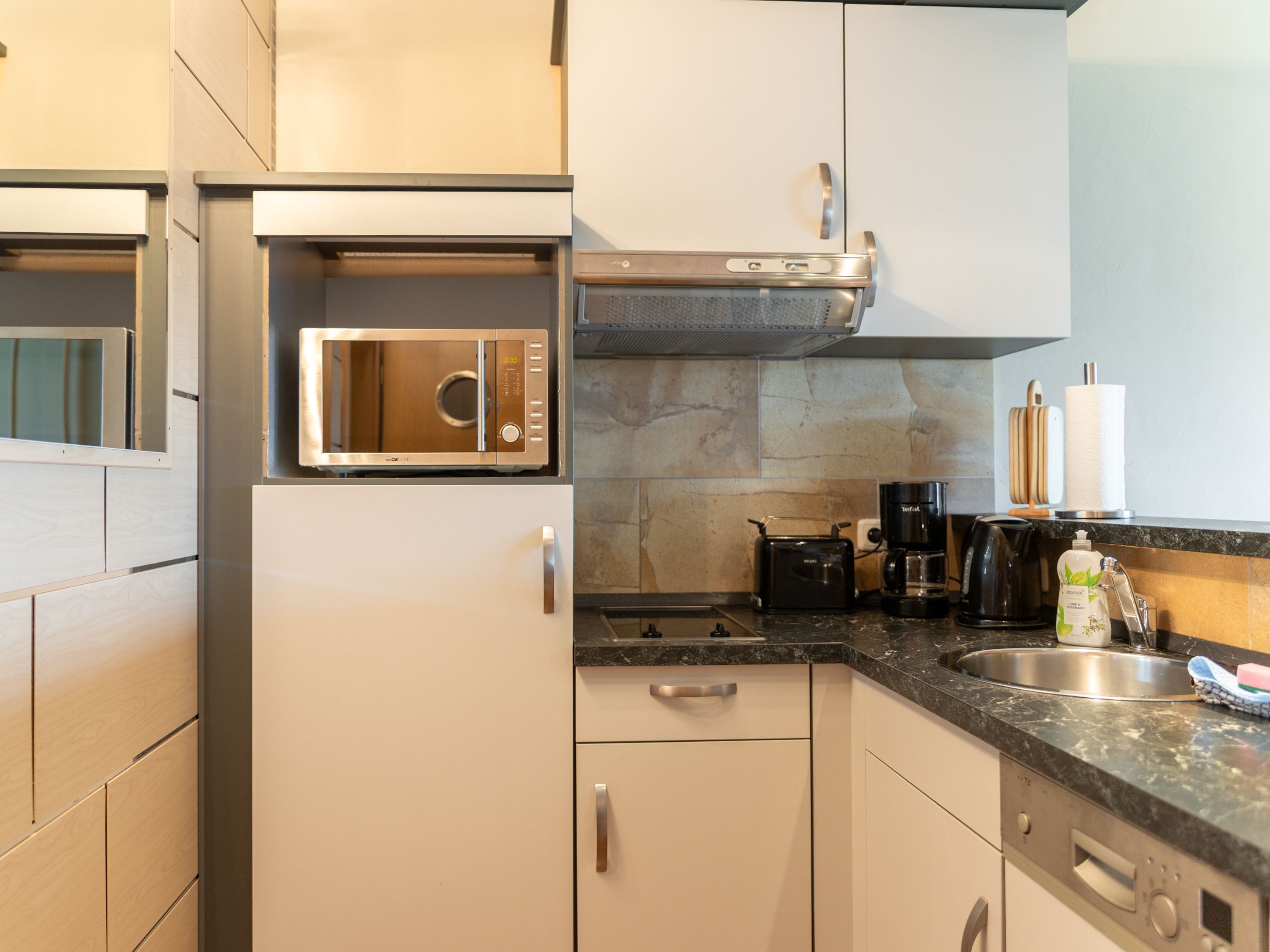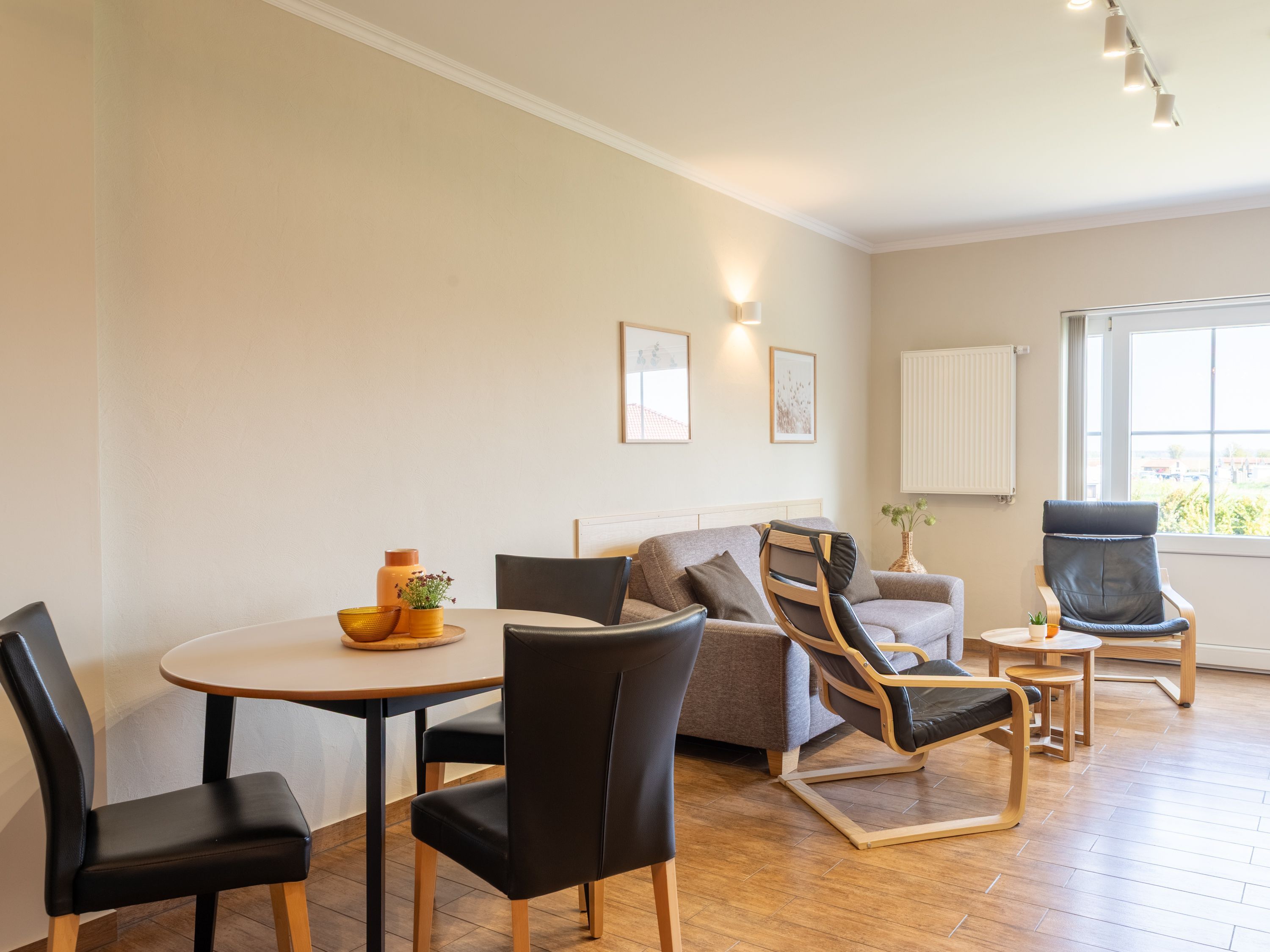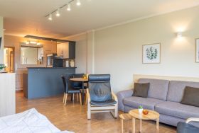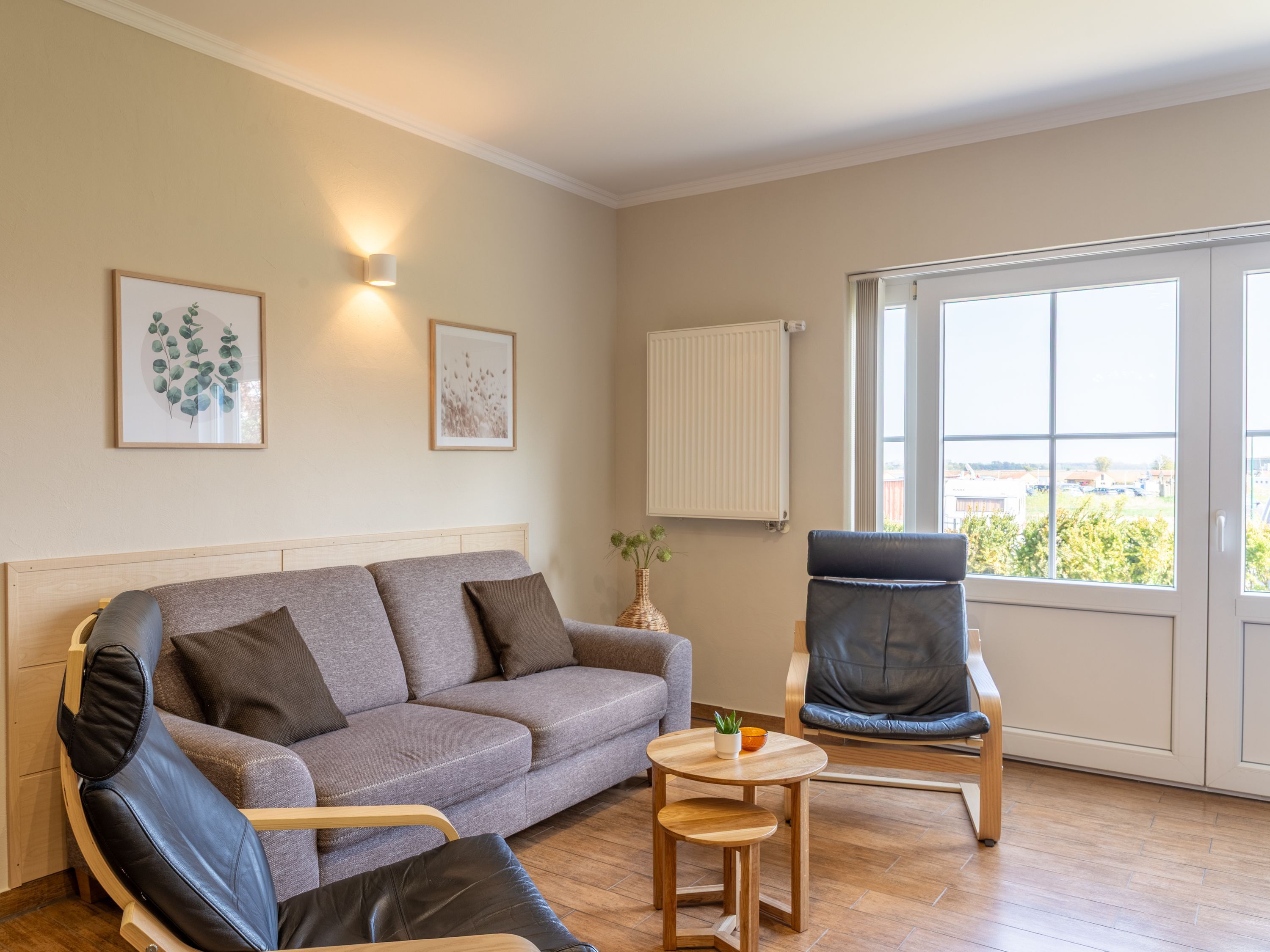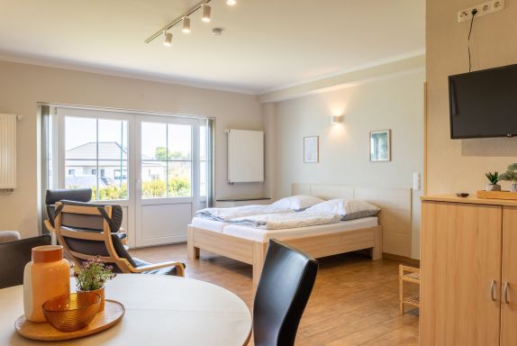 Die Ferienwohnung 4 im Blu Hus in Freest befindet sich im Souterrain und bietet auf 45 m² viel Platz für 2 Personen. Sie ist eine gute Wahl für alle, die eine ruhige Unterkunft mit direktem Zugang ins Grüne suchen. Der kombinierte Wohn- und Schlafbereich ist gemütlich eingerichtet und verfügt über ein bequemes Sofa, einen Fernseher und einen Esstisch. Das Doppelbett (160x200) sorgt für erholsame Nächte. Die offene Küche ist mit Herd, Kühlschrank, Mikrowelle, Geschirrspüler und nützlichen Alltagshelfern ausgestattet, ideal für die Selbstverpflegung im Urlaub. Vom Wohnbereich aus hast du Zugang zu einer kleinen Terrasse mit Sitzgelegenheit und zum Gartenbereich vor dem Haus. Hier kannst du entspannt frühstücken, die frische Luft genießen oder einfach zur Ruhe kommen. Das Badezimmer verfügt über eine ebenerdige Dusche, das WC ist separat zugänglich. Ein besonderes Extra ist die eigene Sauna, die dir gegen Gebühr zur Verfügung steht - perfekt für eine entspannte Auszeit nach einem Tag am Meer oder in der Natur. Im Haus findest du außerdem eine Waschmaschine und einen Trockner, die ebenfalls gegen Gebühr genutzt werden können. Die ruhige Lage und die Nähe zum Hafen machen diese Wohnung zu einem angenehmen Rückzugsort mit allem, was man für einen entspannten Aufenthalt an der Ostseeküste braucht.