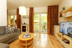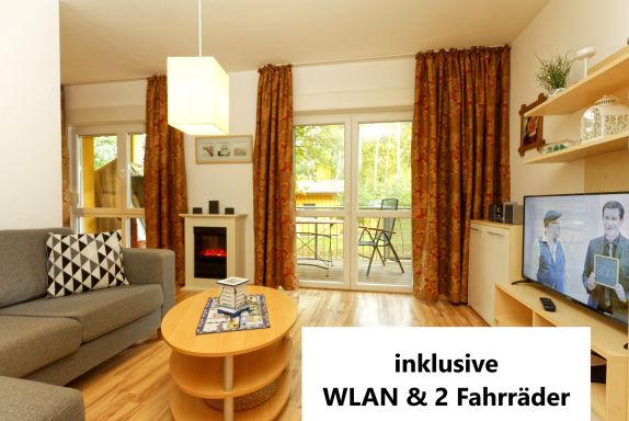 Gemütlich und modern eingerichtete Ferienwohnung mit Elektrokamin und großem Balkon.