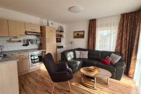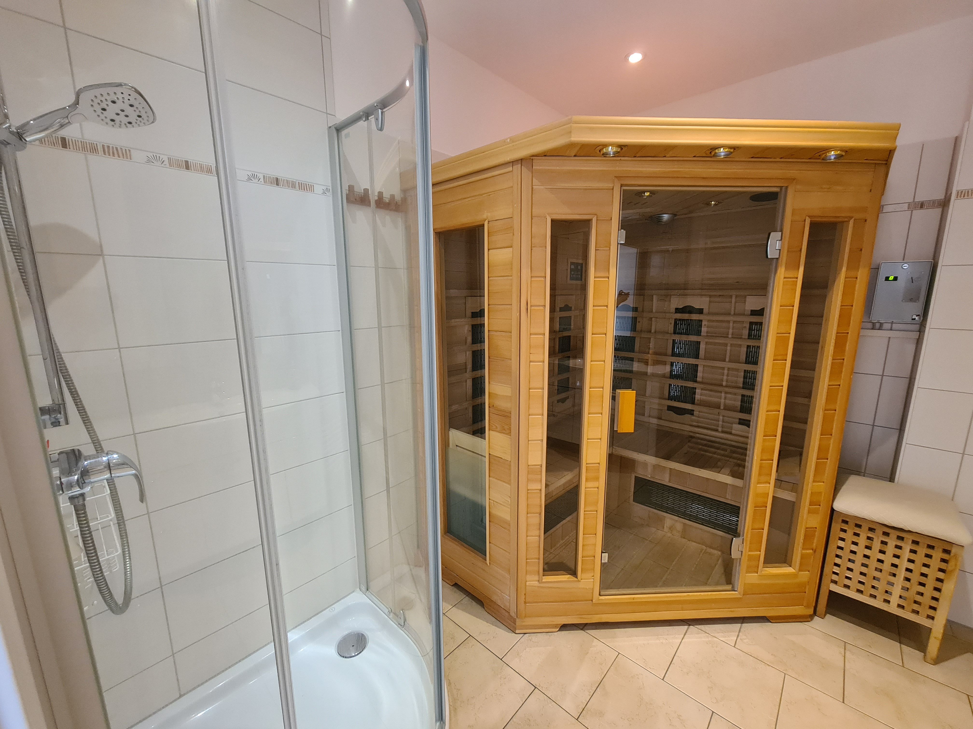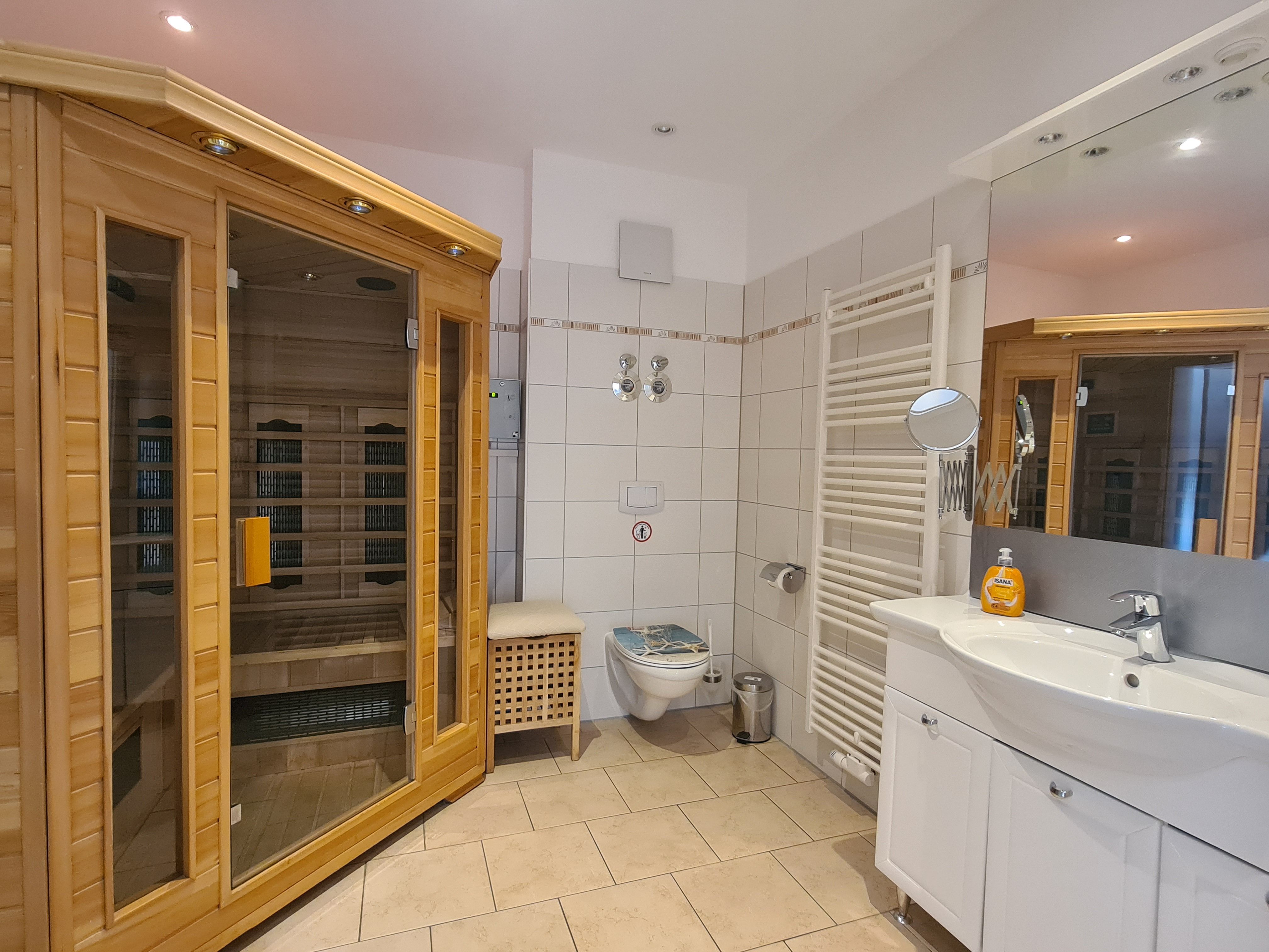 Fußbodenheizung, Infrarotsauna, Elektrokamin, TV, DVD-Player, Radio mit CD/MP3-Player, Balkonmöbel, sehr gut ausgestattete Küche mit Ceranherd, Backofen, Kühlschrank, Tiefkühlfach, Kaffeemaschine, Toaster, Mikrowelle, Wasserkocher, Gläser, Geschirr, Besteck