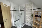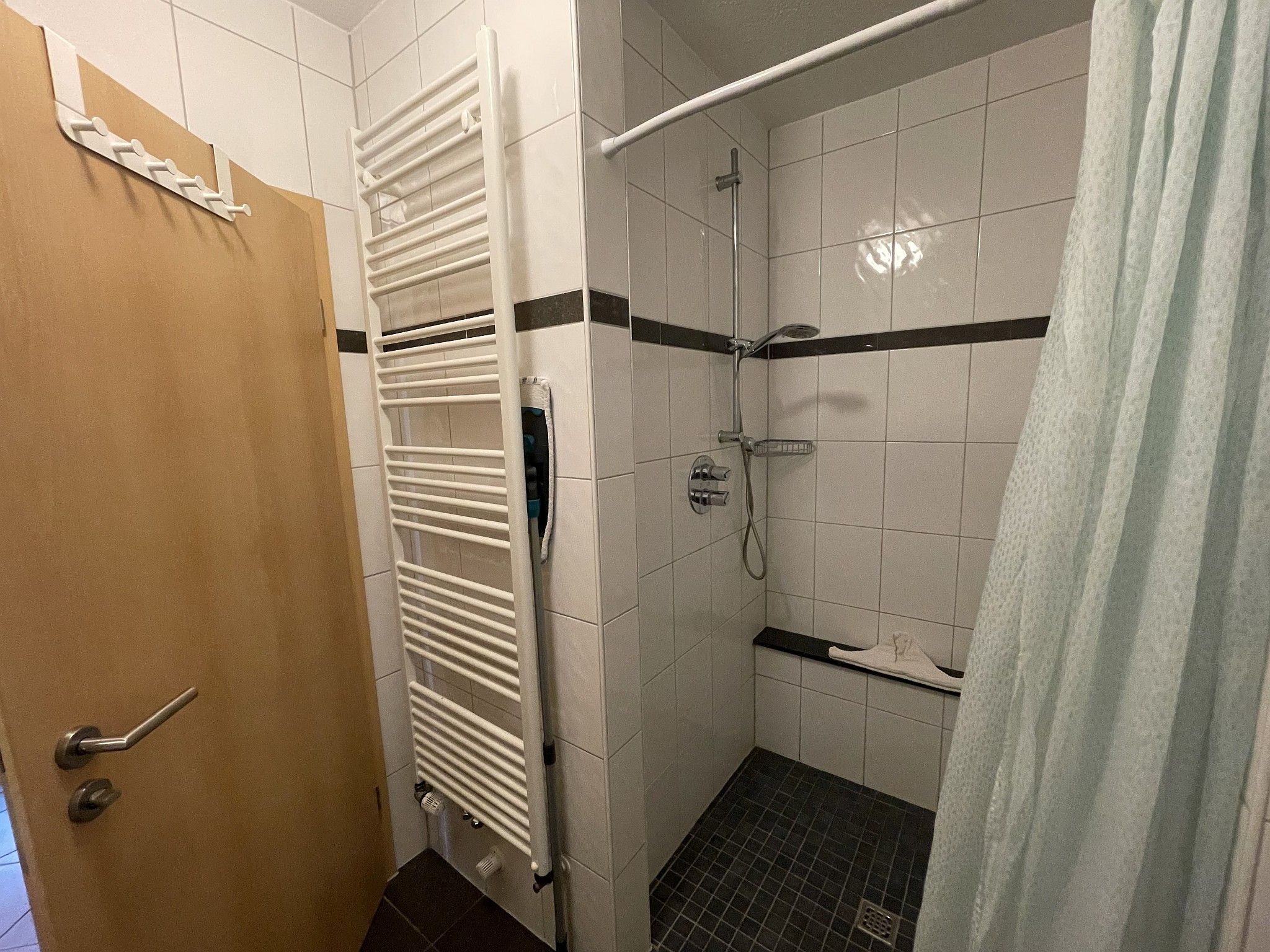 Direkt am Wohnzimmer liegt der Balkon. Im Wohnzimmer befinden sich ein großes Sofa, eine Essecke sowie eine Pantryküche. Das Badezimmer ist mit Dusche und Handtuchheizkörper ausgestattet.