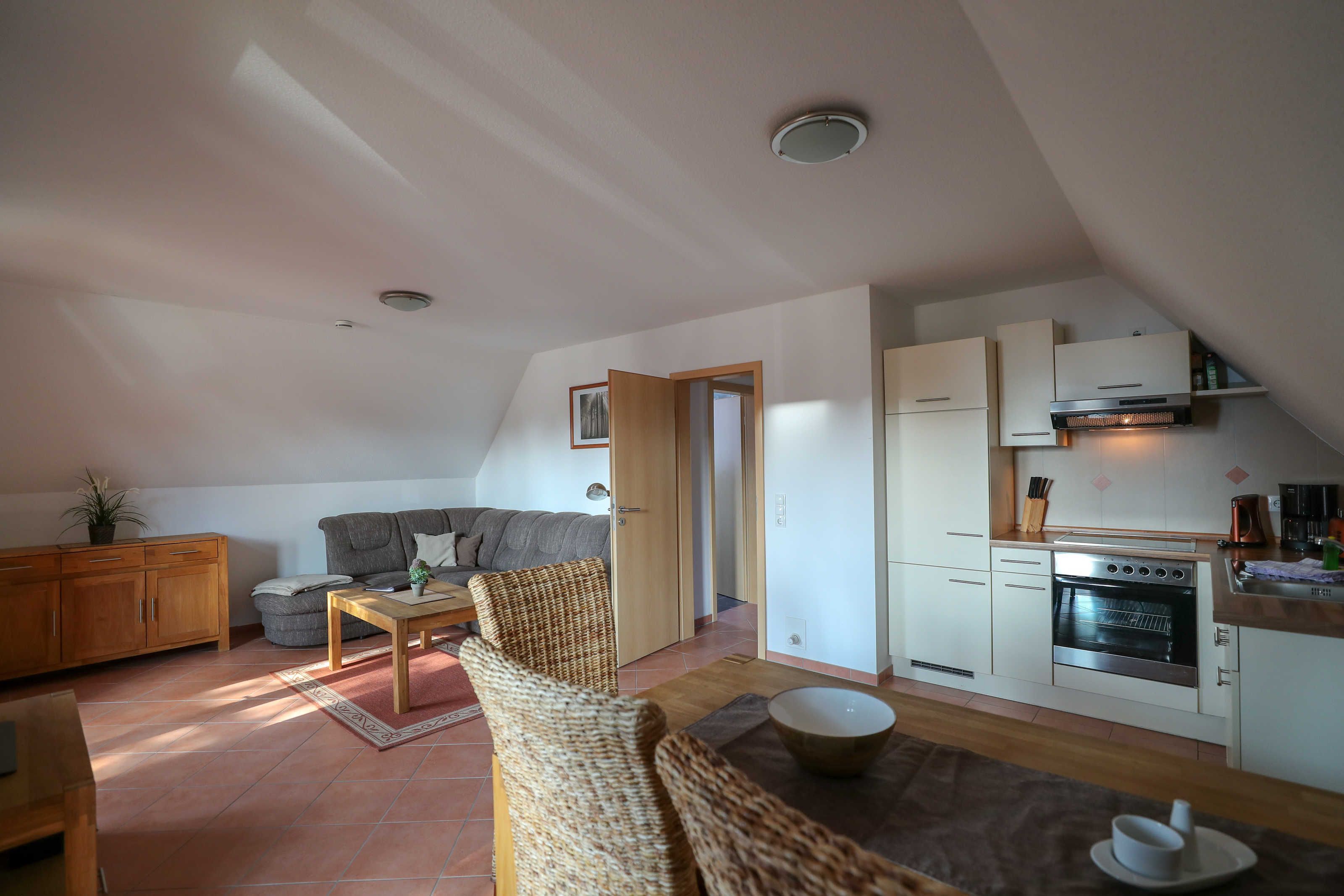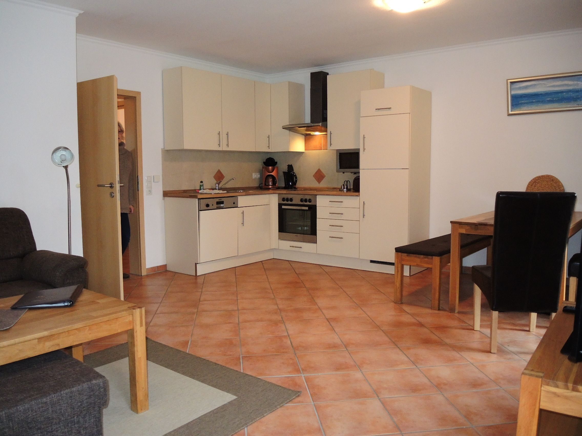 Die offen gestaltete Küche ist in den Wohn- und Essbereich integriert. Von dort aus gelangen Sie direkt auf den Balkon, der zum Entspannen in der Abendsonne einlädt.