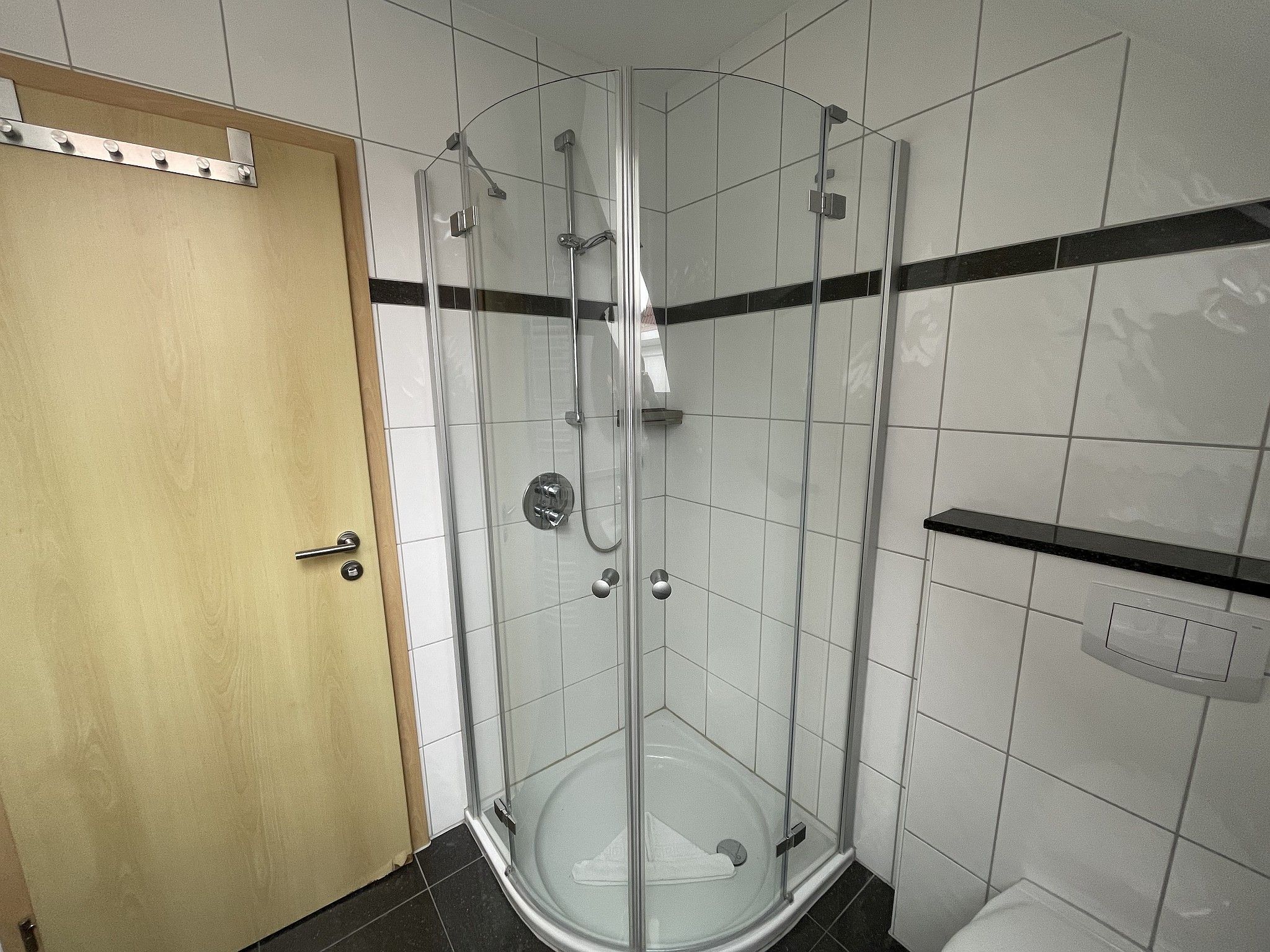 Direkt am Wohnzimmer ist der Balkon. Im Wohnzimmer befindet sich ein großes Sofa, eine Ess-Ecke sowie eine Pantryküche. Das Bad ist mit Dusche und einem Handtuch-Heizkörper ausgestattet.