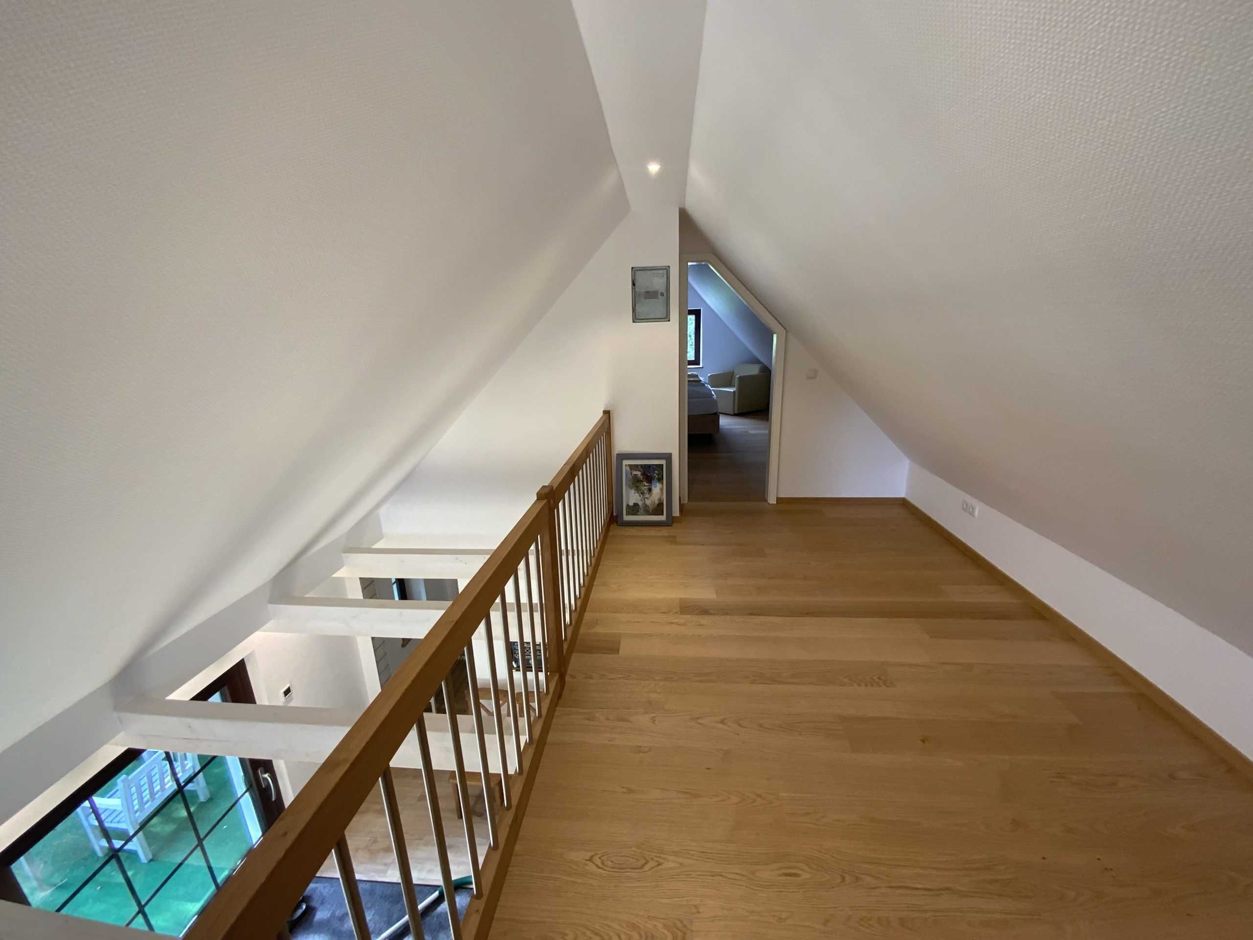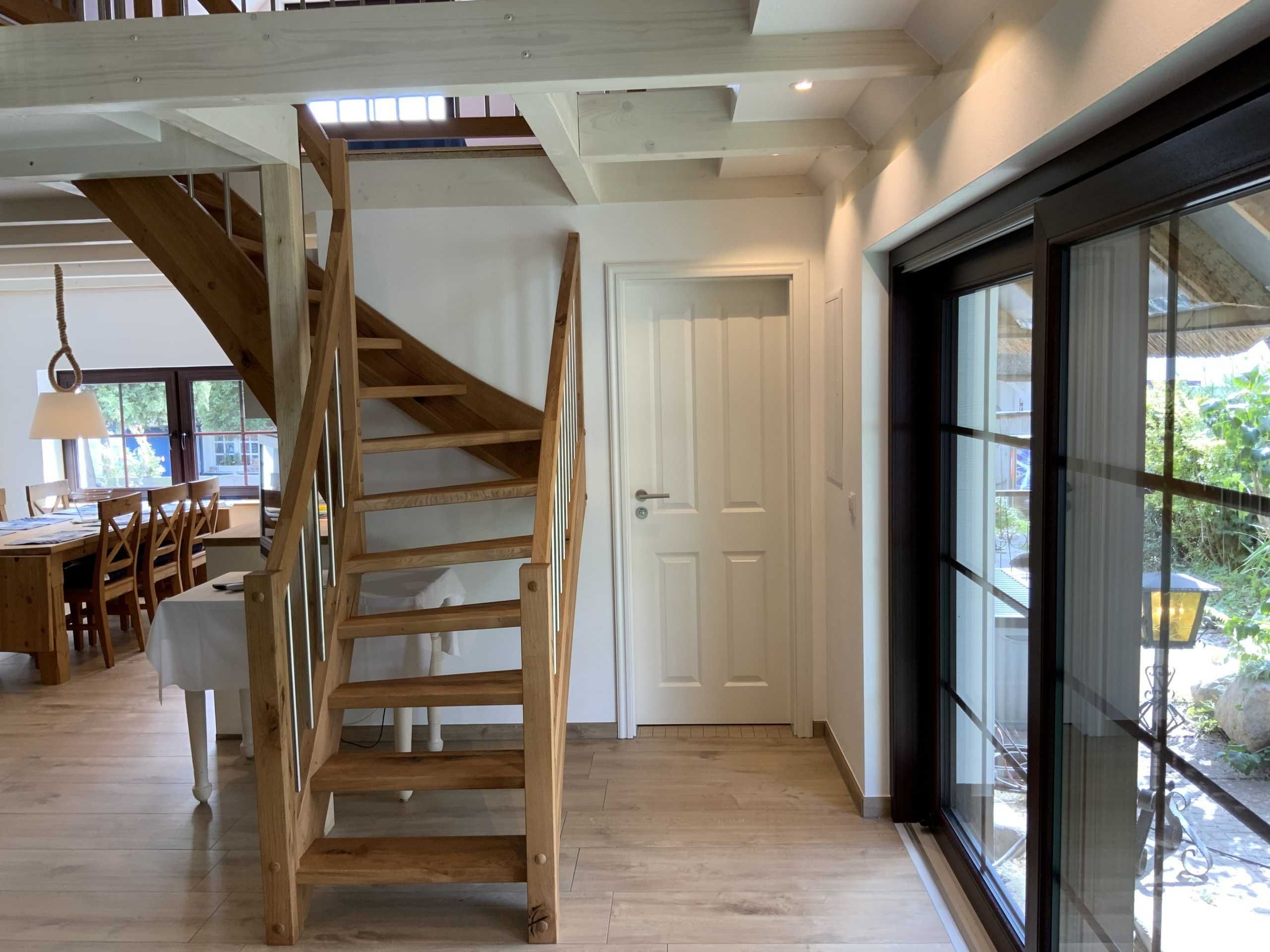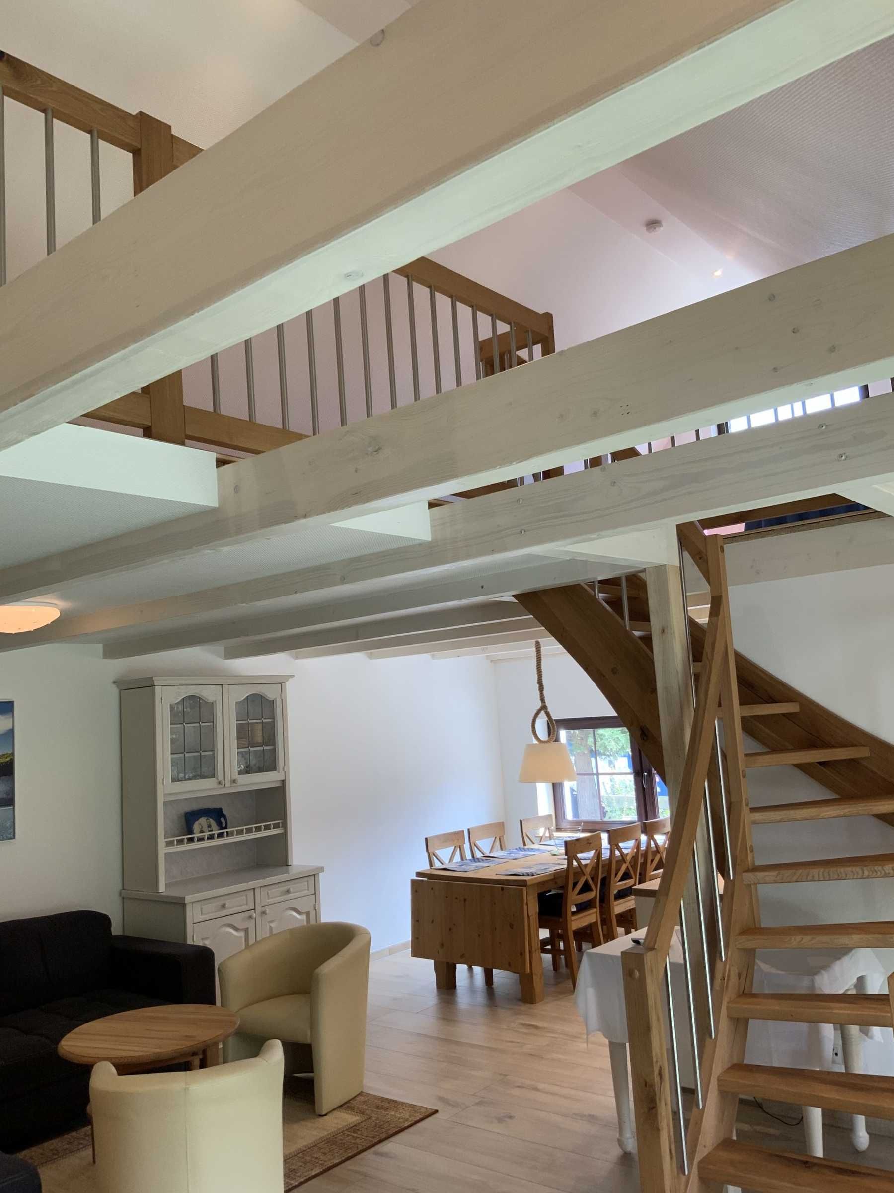 Das Ferienhaus besteht in der unteren Etage aus dem großzügigen Wohnbereich mit der offenen Küche und dem Essplatz, einem Schlafzimmer mit Doppelbett sowie den beiden Duschbädern. In der oberen Etage finden Sie ein Galeriezimmer mit Blick auf den Bodden und das zweite separate Schlafzimmer. Die Aufbettungsmöglichkeit besteht im Galeriezimmer auf dem Schlafsofa (200x150 cm). Eine große Terrasse, mit der Möglichkeit zum Grillen, läd zu gemütlichen Abenden ein.