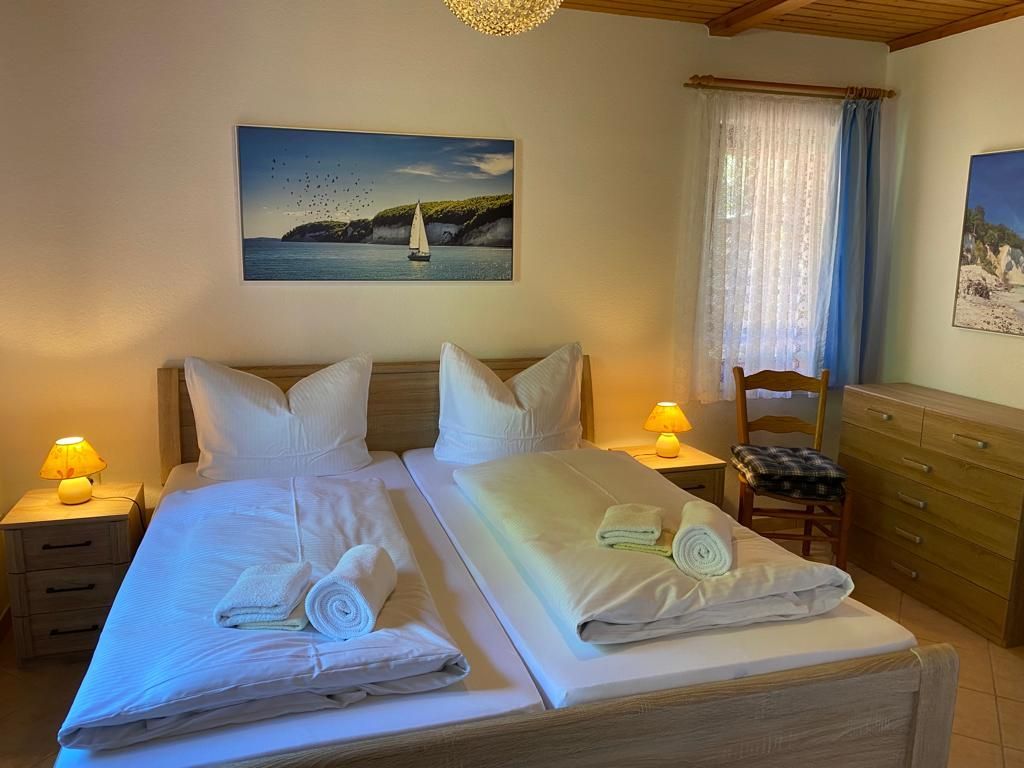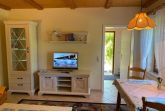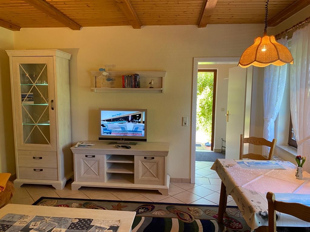 Die Ferienwohnung befindet sich im Erdgeschoß und besteht aus einem Wohnraum mit Sitzgruppe und TV sowie einem Schlafraum mit einem Doppelbett. Die Ferienwohnung verfügt zudem über ein Duschbad und eine moderne Einbauküche im separaten Raum. Auf dem großen Grundstück steht Ihnen eine Liege und Spielwiese sowie ein Grillplatz zur Verfügung..