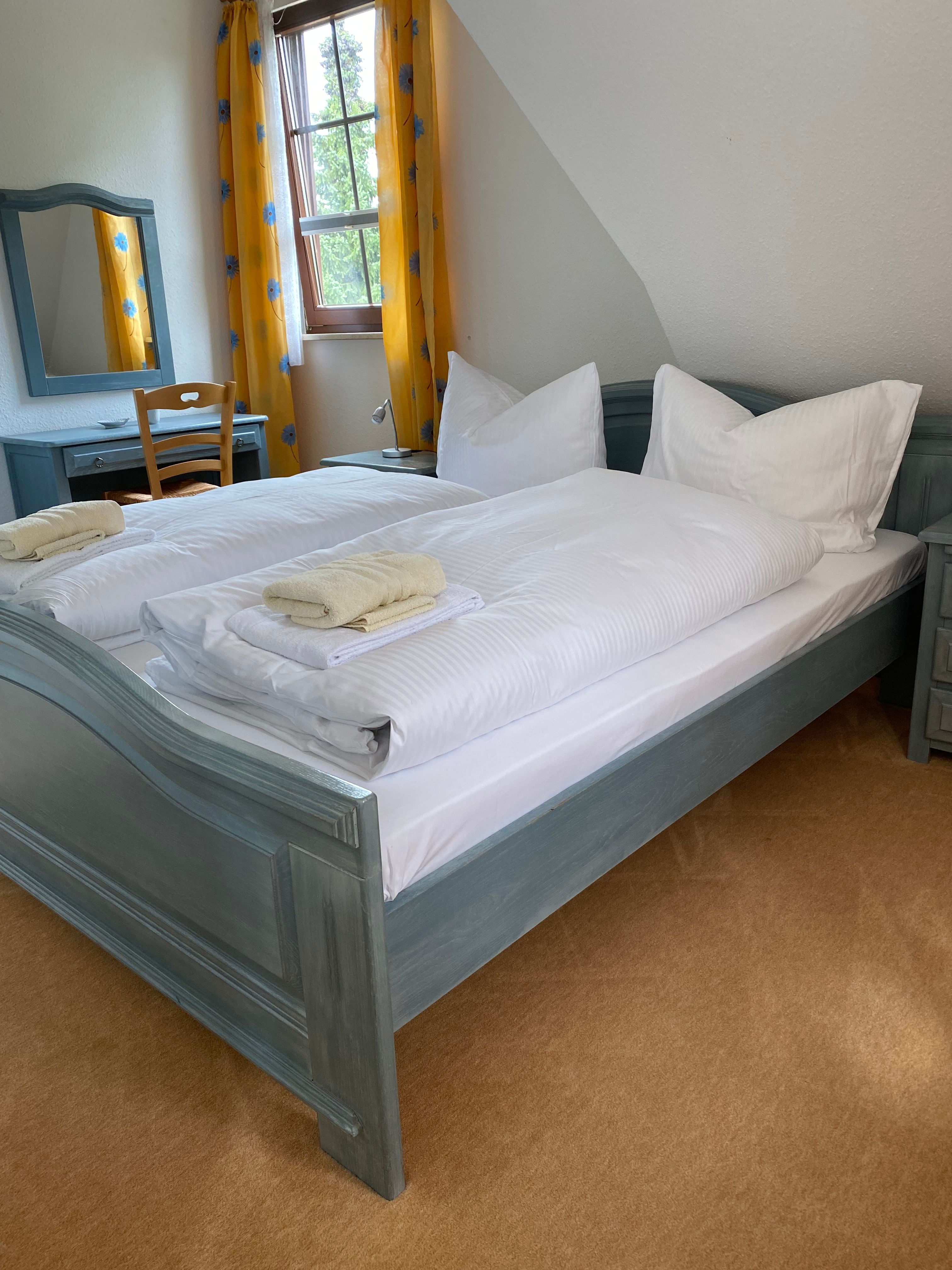 Die Ferienwohnung befindet sich im Obergeschoß und besteht aus einem Wohnraum mit Sitzgruppe und TV sowie einem Schlafraum mit einem Doppelbett. Die Ferienwohnung verfügt zudem über ein Duschbad und eine moderne Küchenzeile. Auf dem großen Grundstück steht Ihnen eine Liege und Spielwiese sowie ein Grillplatz zur Verfügung.