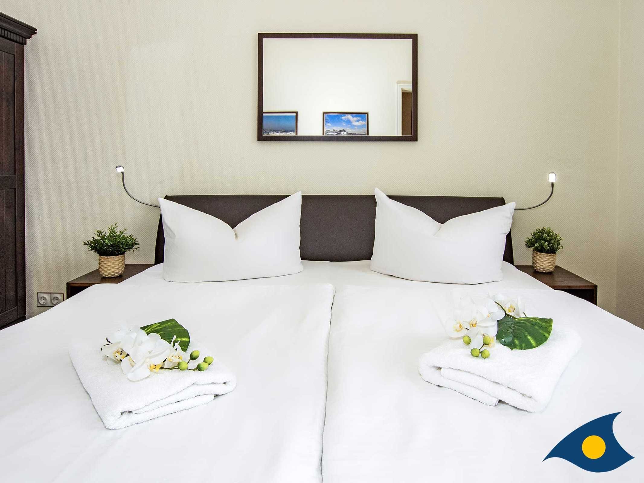 Im Schlafzimmer steht Ihnen u. a. ein Polster-Doppelbett (Liegefläche ca. 1,80 m × 2,00 m) mit hochwertigen Matratzen, Toppern und höhenverstellbaren Lattenrosten für eine behagliche und entspannende Nachtruhe zur Verfügung.