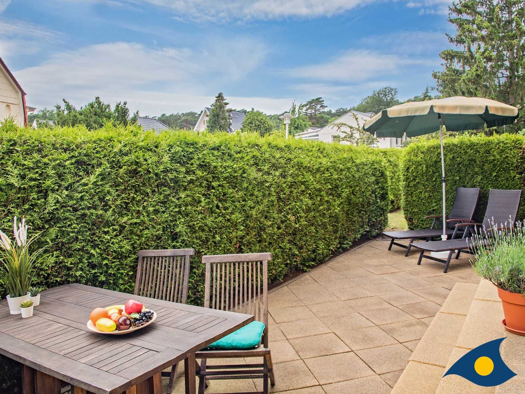 Hervorzuheben ist die von einer blickdichten Hecke umschlossene Terrasse auf der Südseite der Wohnung mit einer Größe von ca. 24 m², auf der Sie ab ca. 11.30 Uhr bis in die Abendstunden die Sonne genießen können.