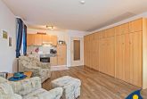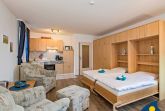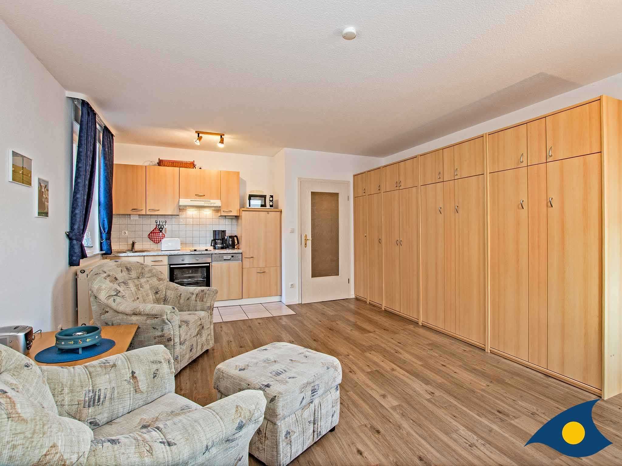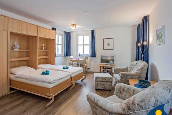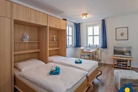 Zu diesem freundlich eingerichteten ***Einraumappartement gehört ein Südwestbalkon, auf dem Sie die Nachmittagssonne und den Blick auf den herrlichen Buchenwald wunderbar genießen können. Das moderne Schrankbett mit 2 bequemen Einzelbetten verschwindet am Tag ganz einfach und nimmt Ihnen so keinen Platz weg.