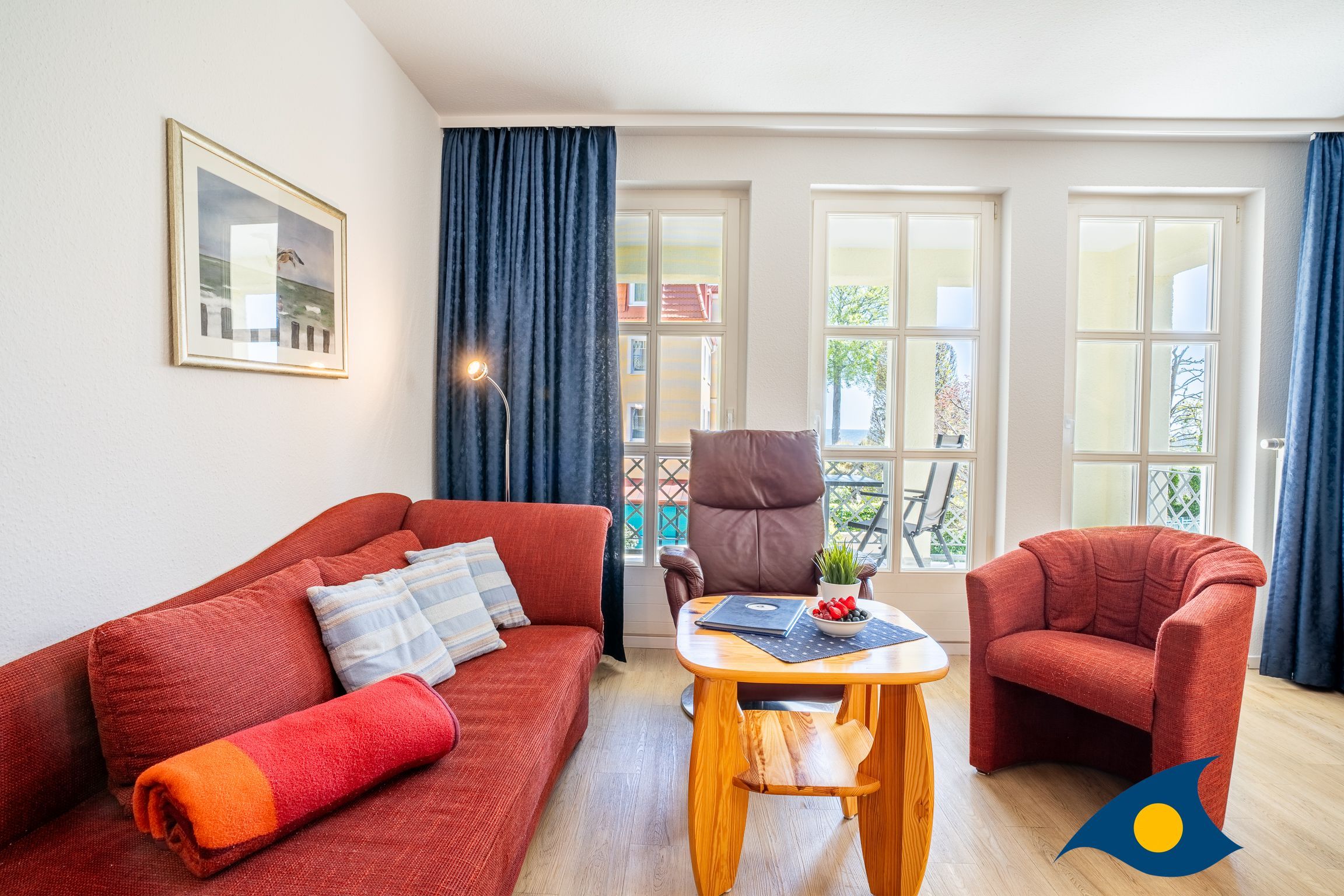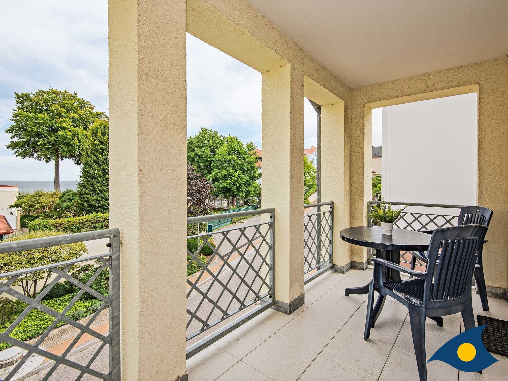 Das Appartement verfügt über einen großen Balkon mit Blick auf Ostsee, Strand und Seebrücke. Das gemütliche Schlafsofa im Wohnzimmer steht als Schlafplatz für die 3. Person zu Verfügung.