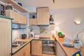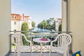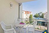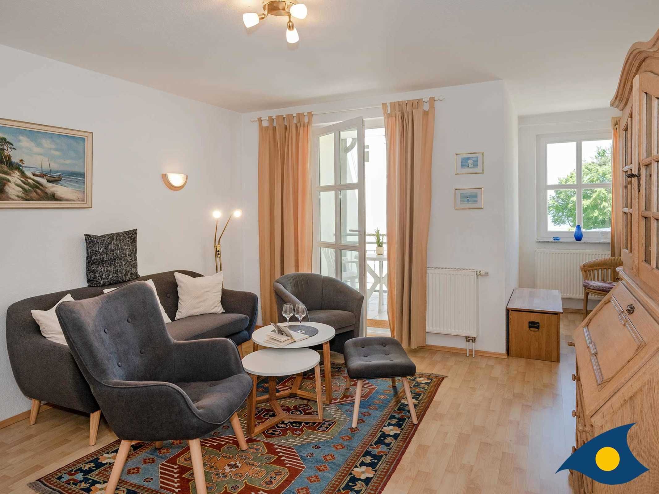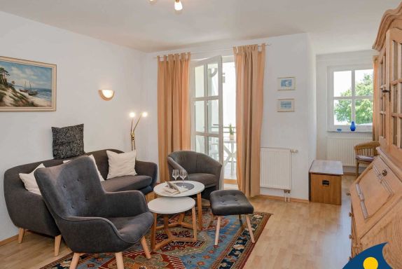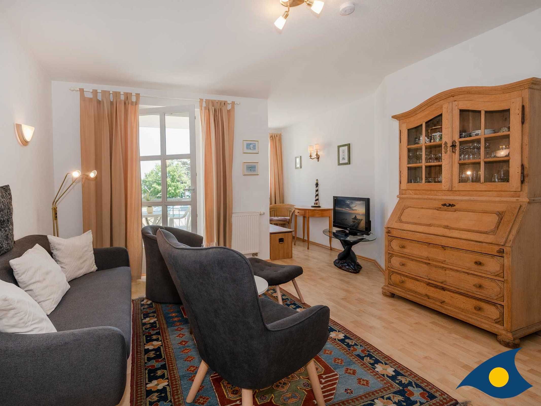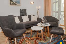 Zu diesem schönen Zweiraumappartement gehört ein 8 qm großer Balkon mit eingeschränktem Meerblick. Der kleine Tresen trennt den Küchenbereich vom Wohnzimmer. Ein bunter Stilmix und verschiedene Teppiche sorgen für eine gemütliche Atmosphäre. Vom Balkon aus kann man das Leben auf der bekannten Bansiner Bergstraße und die Aussicht bis zum Ostseestrand wunderbar genießen. Das bequeme Doppelbett sorgt für genügend Platz am Tag und einen erholsamen Schlaf in der Nacht.