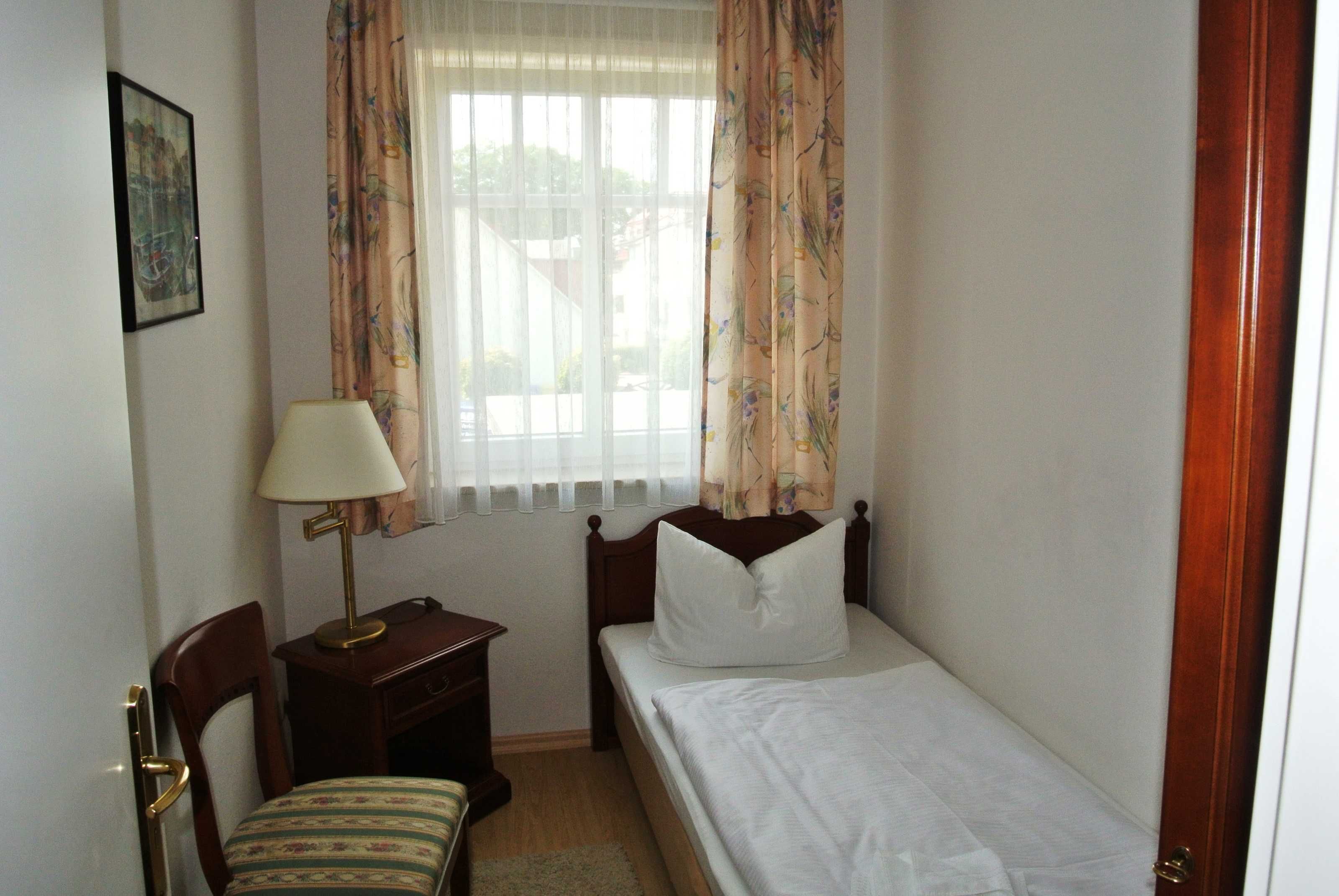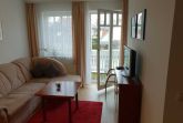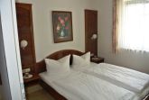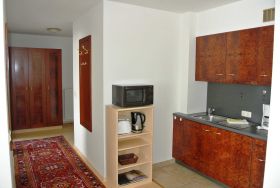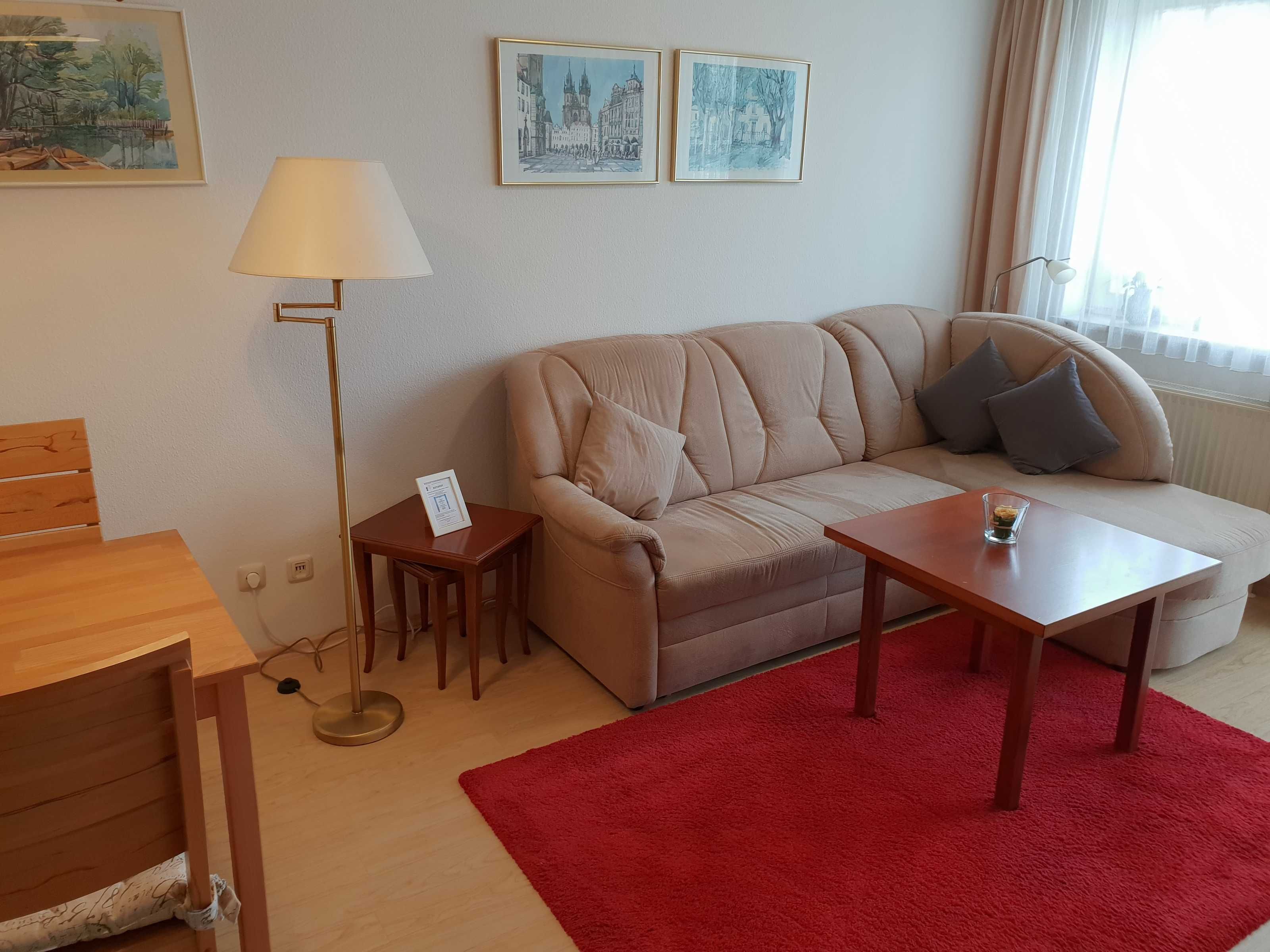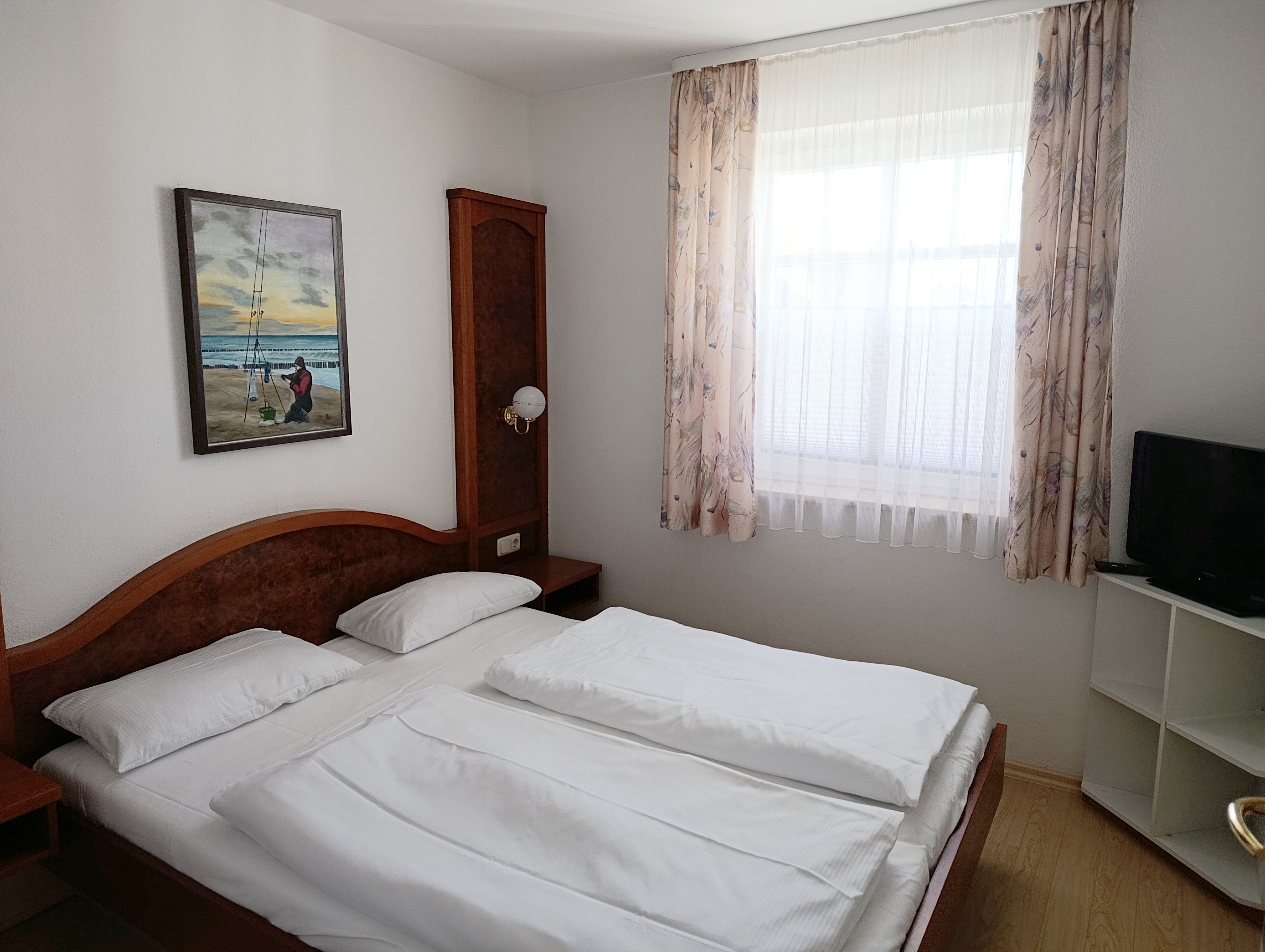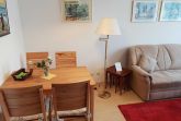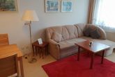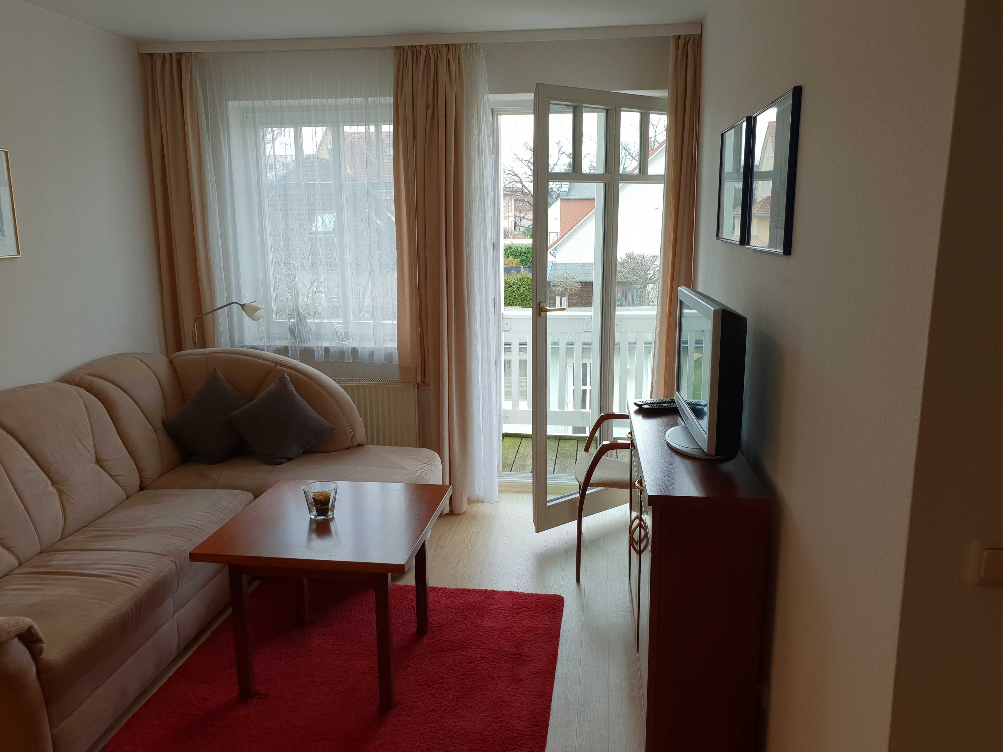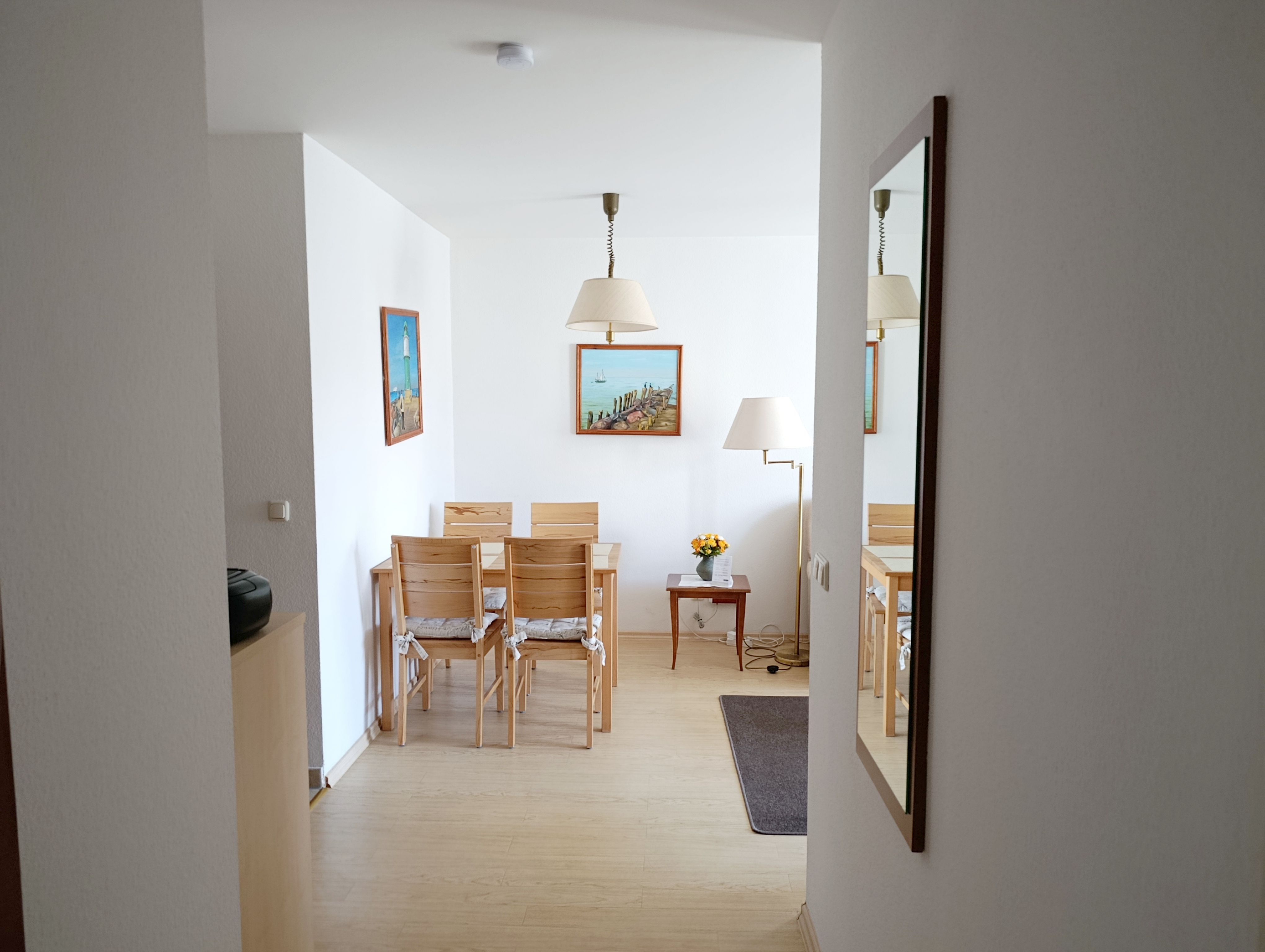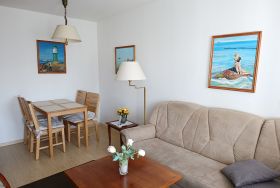 Nur 150 m vom Strand wohnen Sie in einer 3-Raum-Ferienwohnung. Die 42 qm große Wohnung liegt in der ersten Etage und ist mit Fahrstuhl erreichbar. Das Wohnzimmer ist mit einer Couch, Couchtisch, Sessel, Anrichte, mit Kabel-TV (Flachbildschirm), Radio, Essbereich (Tisch und Stühle) und Küchenzeile ausgestattet. Der Balkon mit Tisch und Stühle geht zur Westseite. Im Schlafzimmer stehen ein Doppelbett und eine kleine Anrichte. Im Gästezimmer stehen ein Bett, Nachtschrank und ein kleiner  Kleiderschrank. Im Flur steht ein Kleiderschrank und eine Garderobe mit Spiegel. Die Küchenzeile wurde ausgestattet mit Mikrowelle, Kühlschrank, Kaffeemaschine, Zwei-Platten-Kochfeld, Toaster und Wasserkocher. Das Bad mit Dusche und WC komplettiert die Wohnung.