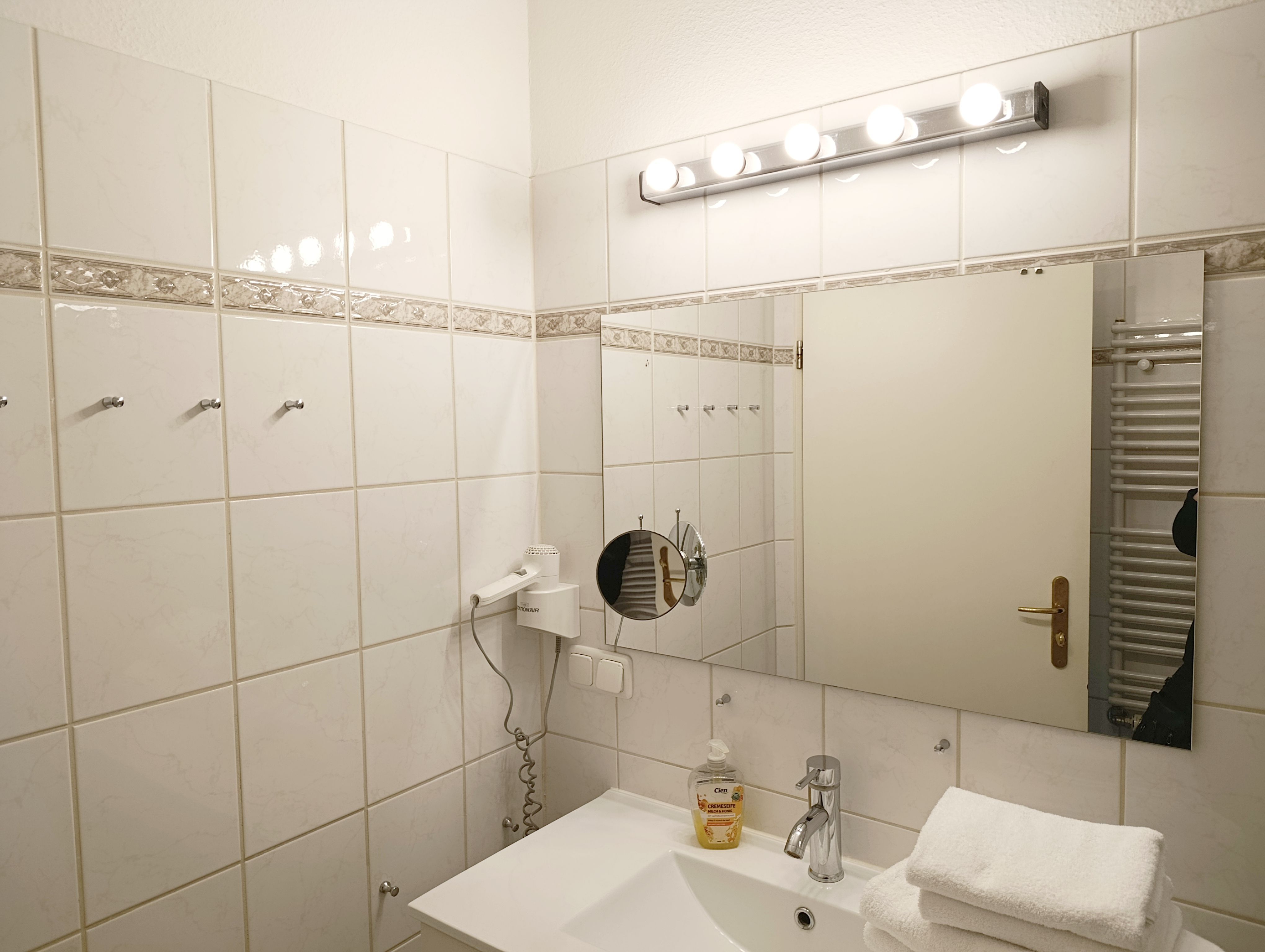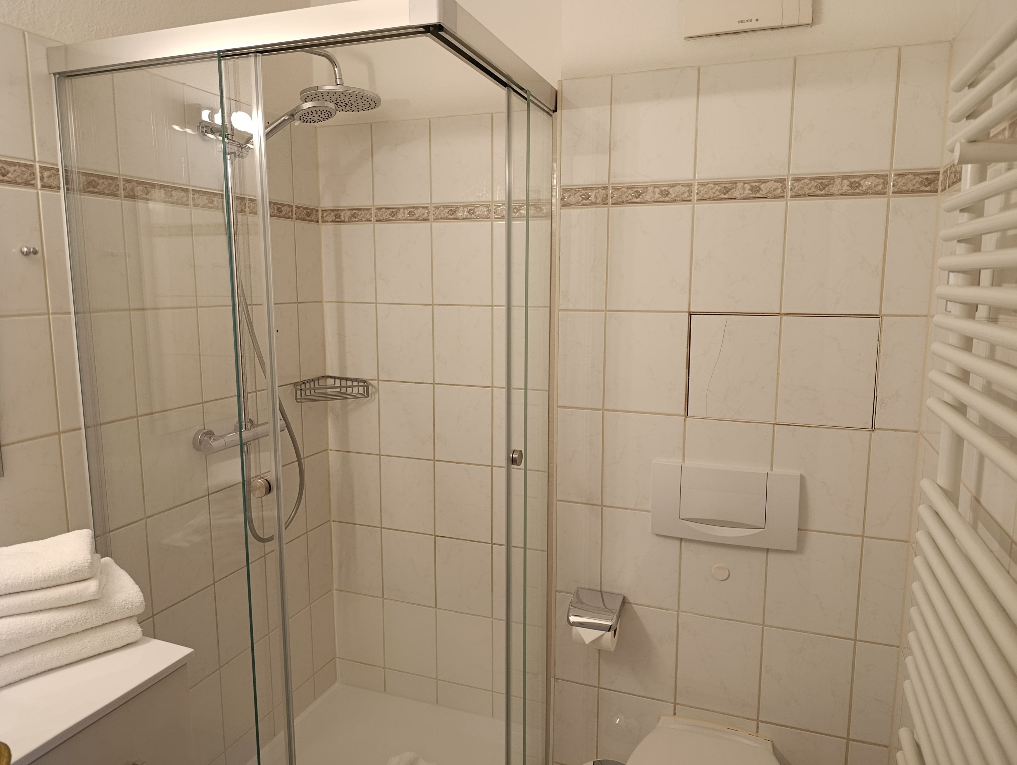 Ein Bad mit Dusche, Waschbecken und WC komplettieren den guten Gesamteindruck der Wohnung.