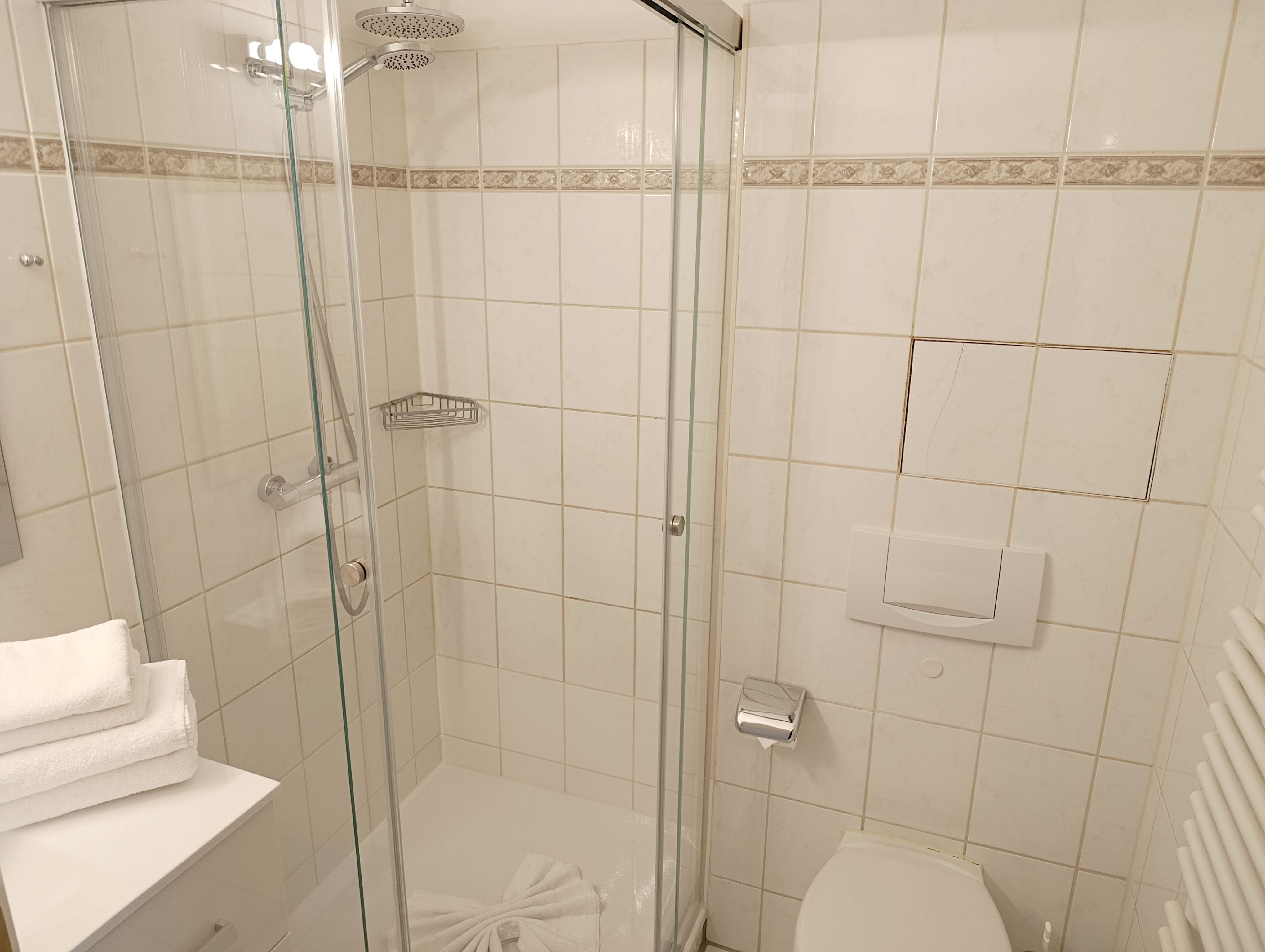 Badezimmer mit Dusche, WC und Waschbecken. Balkon geht zur Westseite.