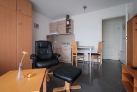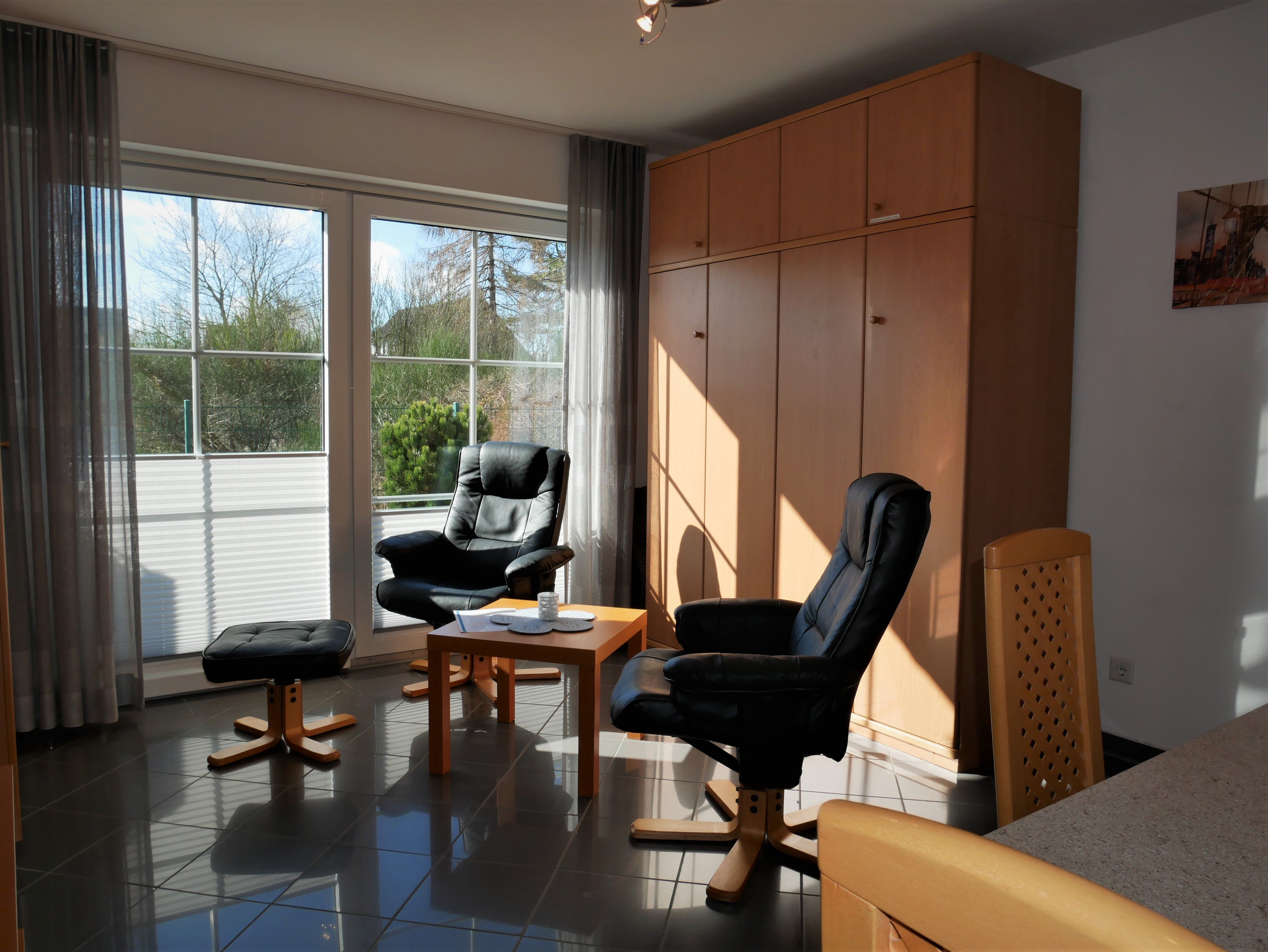 Das exklusiv eingerichtete Erdgeschossappartement ist ca. 25 m² (einschließlich Terrasse) groß und besteht aus einem kombinierten Wohn/Schlafraum (Schrankbett), kompletter Miniküche (Pantryküche mit Cerankochfeld sowie Kühlschrank), Bad mit Dusche und WC, sowie einer Terrasse. Fliesenfußboden, sowie Fußbodenheizung im Wohnraum und Bad, Die zur Südseite gelegene gepflasterte Terrasse ist mit Gartenmöbeln und Sonnenschirm ausgestattet. Grill kann zur Verfügung gestellt werden. Der Terrassenbereich ist aus dem Wohnbereich zugänglich. Die Erstaustattung Bettwäsche sowie 1 Geschirrtuch sind inklusive. Handtücher können entweder mitgebracht oder vor Ort gegen Gebühr ausgeliehen werden (bitte beim Schlüsselverwalter Herrn Käding vorbestellen). Den Gästen stehtkostenfrei ein DSL-Internetzugang über W-LAN zur Nutzung zur Verfügung (keine zugesicherte Eigenschaft falls mal der Router ausfällt). Haustiere sind nicht erlaubt, Nichtraucherwohnung.