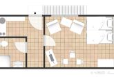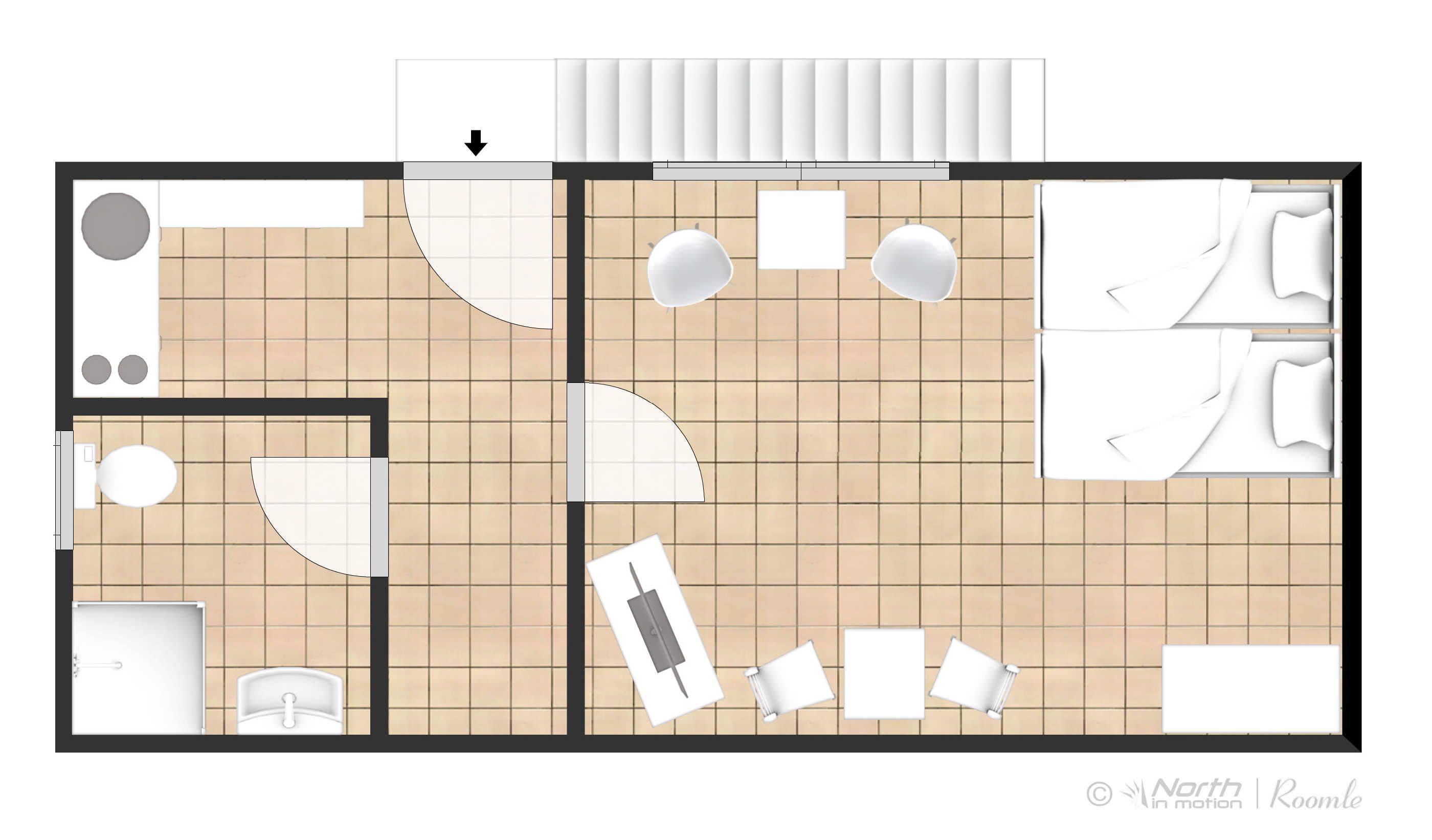 Den Gästen stehen im Wohn-/Schlafraum 2 Einzelbetten (90x200auch als Doppelbett stellbar), eine gemütliche Sitzecke, ein Essplatz, Sat/TV und Radio sowie WLAN zur Verfügung. Die separate Küchenzeile befindet sich im Vorraum und ist mit zwei Kochplatten, Kühlschrank mit Gefrierfach, Kaffeemaschine, Wasserkocher, Toaster ausgestattet. Selbstverständlich gibt es auch Dusche, WC, Fön und Heizung. Die Aufbettung für eine dritte Person besteht aus einem Zustellbett (90x190), welches anstelle der Sessel und des Tisches aufgestellt wird.