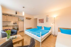 Unser Ferienzimmer IV befindet sich im zweiten Obergeschoss, ist ca. 30 qm groß und maritim eingerichtet. Es verfügt über einen kleinen Vorraum mit Esstisch, ein komfortabel, mediteran eingerichetes Wohn- und Schlafzimmer mit einem zwei Meter breiten Bett und einem Einzelbett (0,90 x 2 m), einer kleiner Küchenzeile sowie ein sehr schönes, größeres Bad mit Badewanne, WC und Fön.