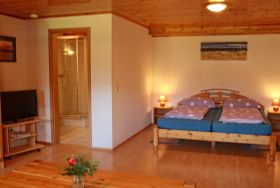 Das Studio liegt ebenerdig und besteht aus einem Wohn-Schlafraum mit einem Doppelbett und einer Sitzecke, einer Küchenzeile sowie einer Essecke und einem Duschbad. Es gibt eine möblierte Terrasse und einen PkW-Stellplatz.