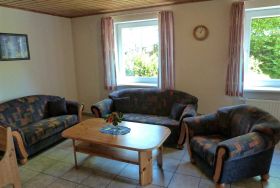 Gemütliche Ferienwohnung (75 qm) im Erdgeschoss, bestehend aus einem Schlafzimmer mit Doppelbett, einem Schlafzimmer mit Einzelbett, einer große Wohnküche mit Sitz- und Essecke, einem Duschbad, einem Flur sowie einem Abstellraum. Die Wohnung hat eine möblierte Terrasse.