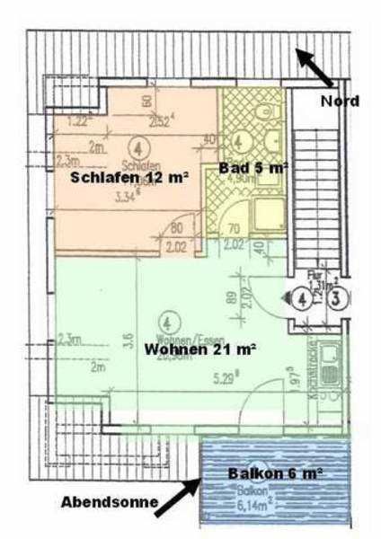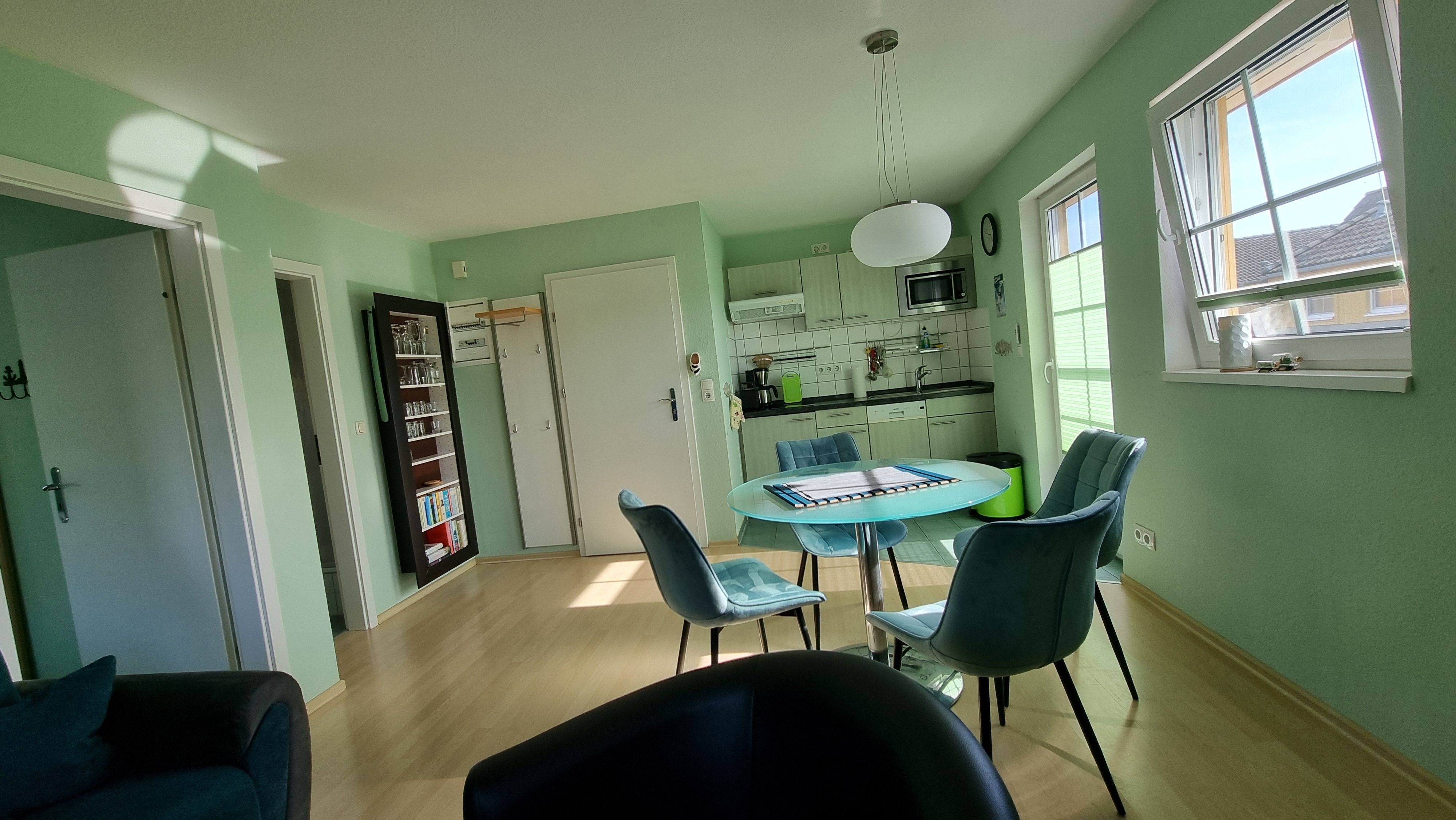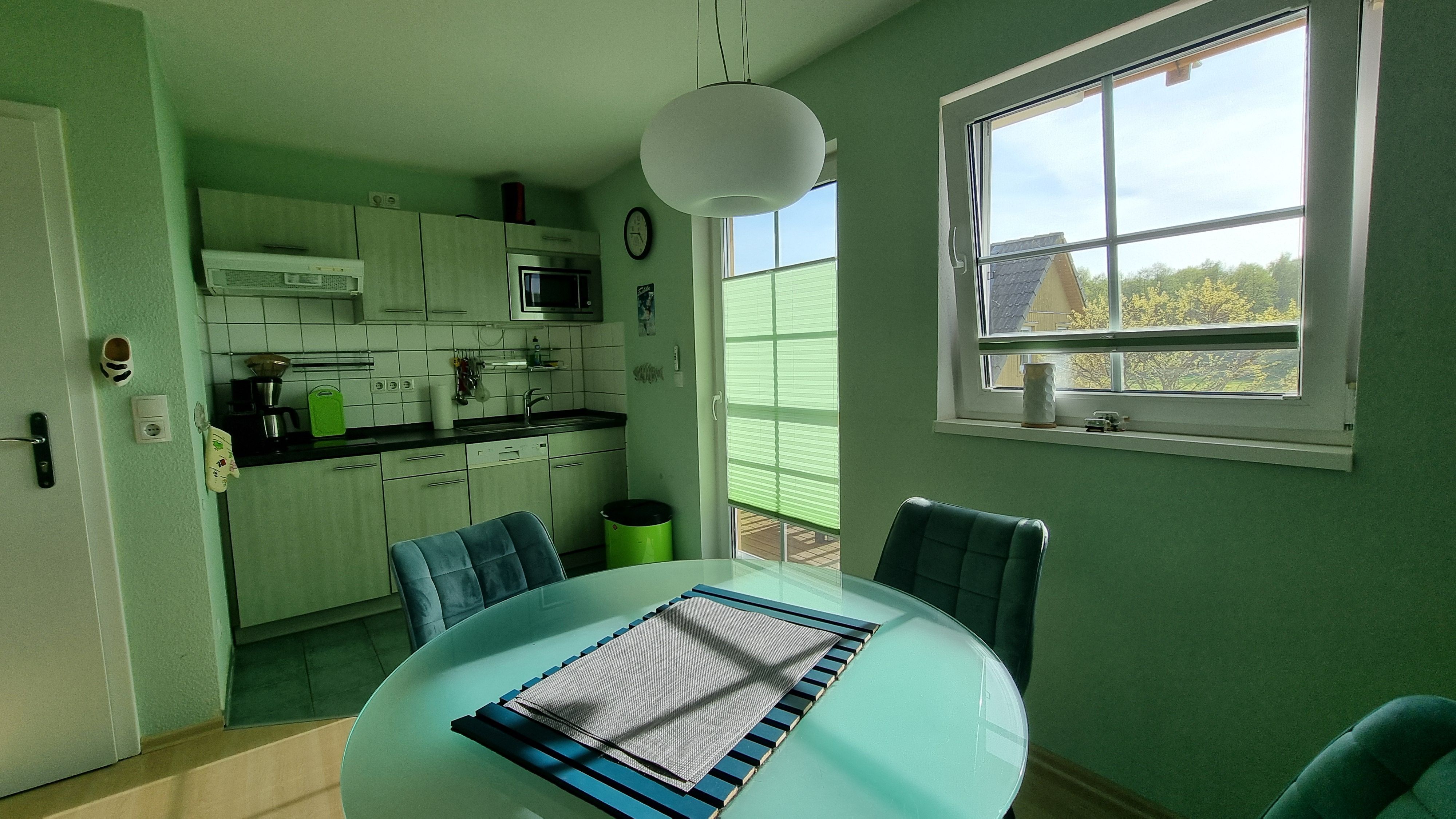 Die Ferienwohnung liegt im Obergeschoß des Ferienhauses rechts. Sie besteht aus Wohnzimmer, kompl. ausgestatteter Küche, Balkon mit Holzsitzmöbeln, Schlafzimmer und Tageslichtbad. Neben dem Schlafzimmer mit Doppelbett steht im Wohnzimmer noch ein Schlafsofa zur Verfügung. Die Ausstattung der apfelgrünen Einbauküche ist neuwertig funktional und qualitativ hochwertig unter anderem mit Toaster, Kaffeemaschine, Mikrowelle mit Grill, 4-Platten-Cerankochfeld, Geschirrspüler, Gefrierfach. Großer süd-west-Balkon mit unverbautem Blick auf den Sonnenuntergang.