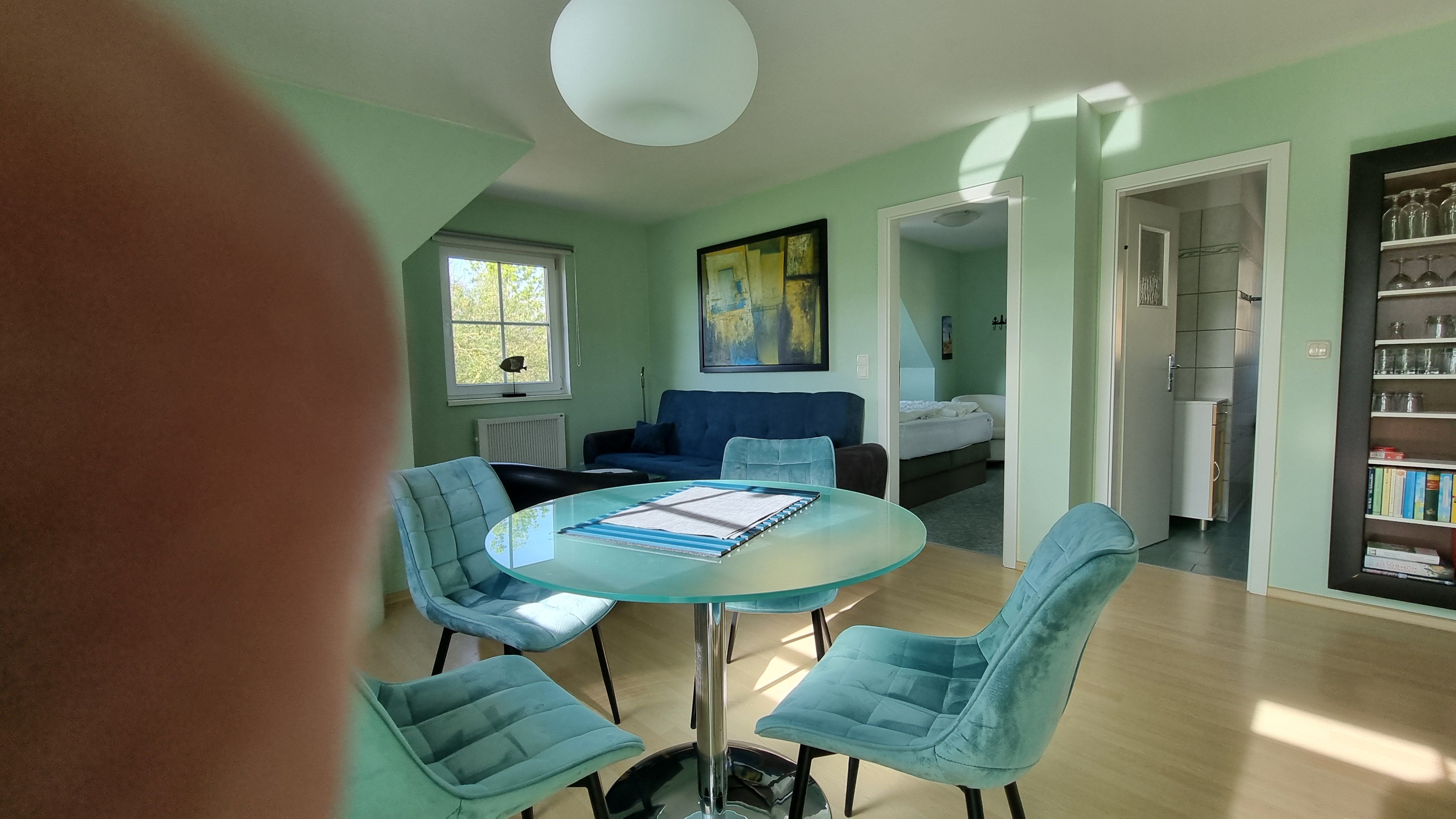 Alle Möbel und Einrichtungsgegenstände zeigen sich in einer geschmackvoll aufeinander abgestimmten Komposition und unterstreichen die Ruhe und Behaglichkeit ausstrahlende Gesamteinrichtung. Ein Elektrokachelofenkamin im großen Wohnzimmer sorgt für auch an kälteren Tagen für ein hohes Wohlfühlgefühl, so dass Sie sich schon nach kurzer Zeit wie zu Haus fühlen werden.