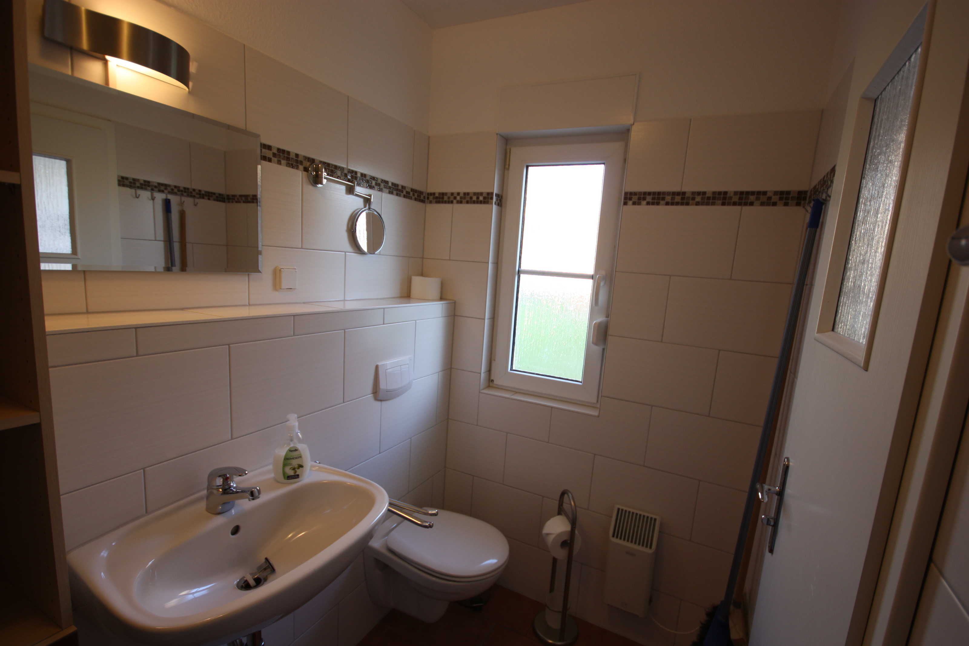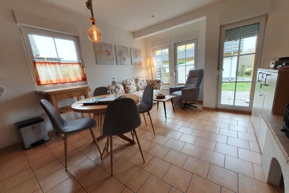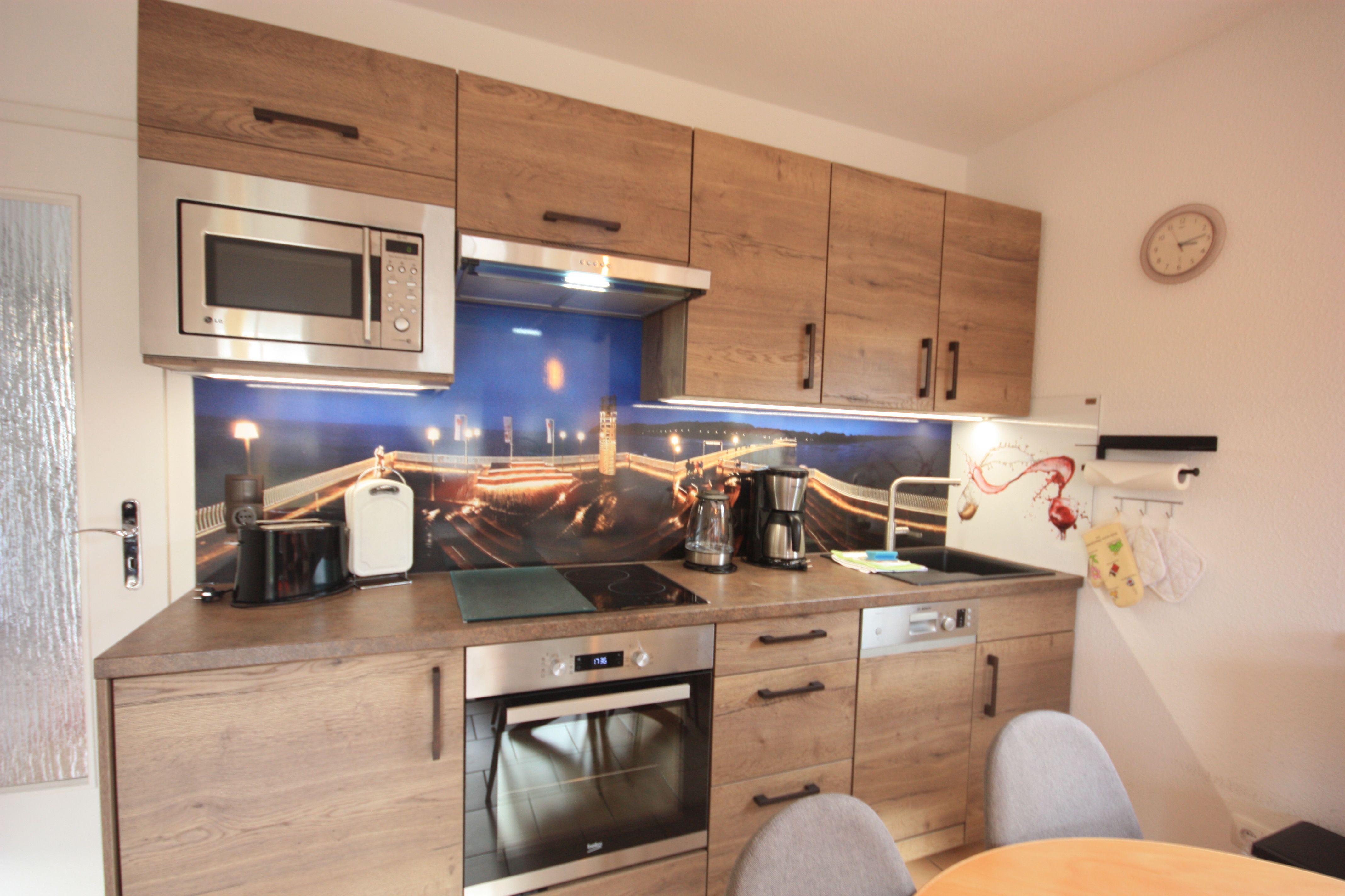 Die Ferienwohnung liegt im Erdgeschoß des Ferienhauses links. Sie besteht aus Wohnzimmer, kompl. ausgestatteter Küche, Balkon mit Sitzmöbeln, Schlafzimmer und Tageslichtbad. Die Ausstattung der bordeauxfarbenen Einbauküche ist neuwertig funktional und qualitativ hochwertig unter anderem mit Toaster, Kaffeemaschine, Mikrowelle mit Grill, Ceran-Kochfeld, Geschirrspüler, Gefrierfach. Große Süd-West-Terrasse mit Blick auf den Wald und den Sonnenuntergang, Grill.