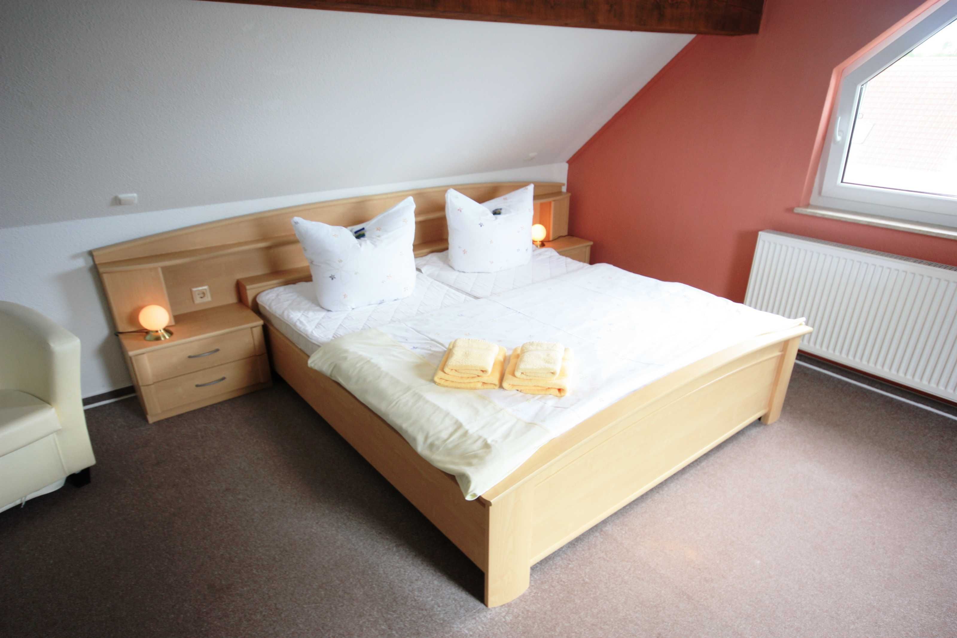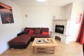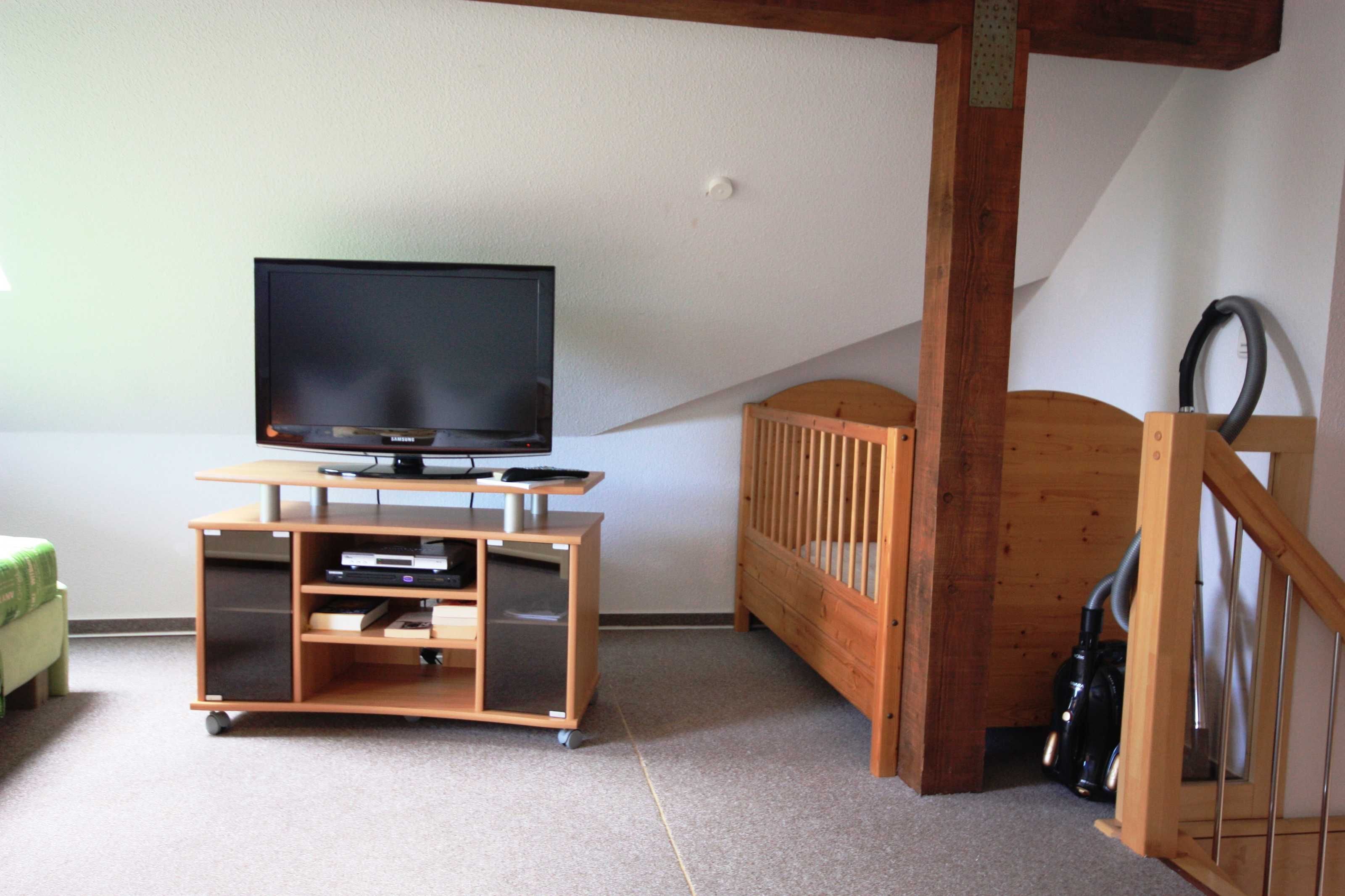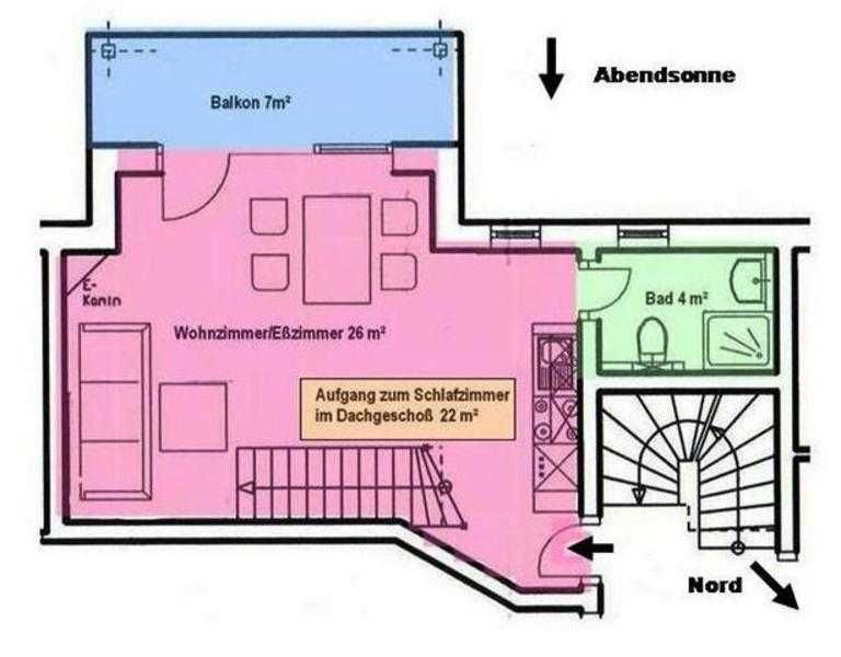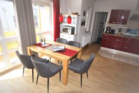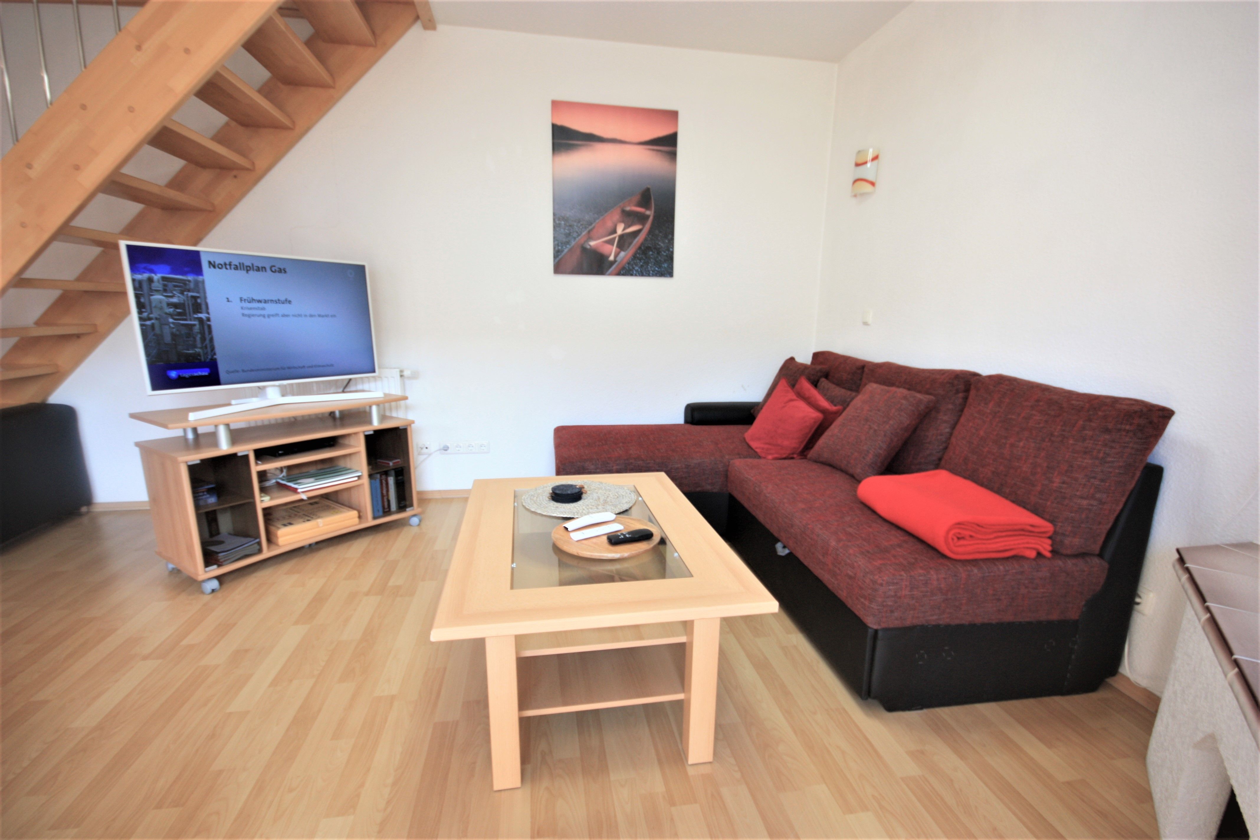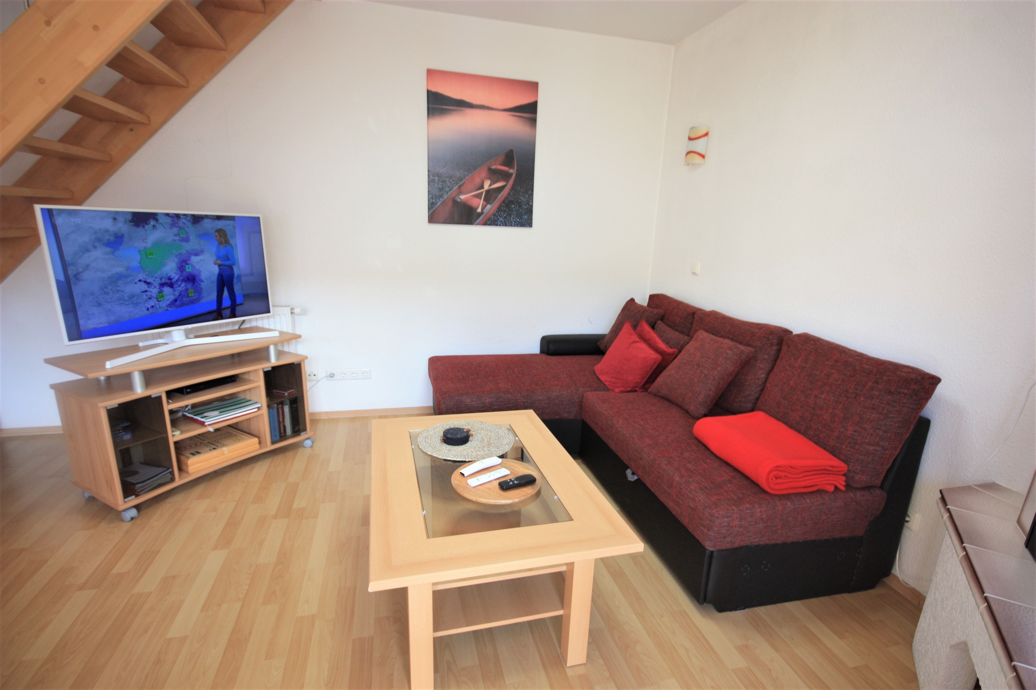 Die Ferienwohnung liegt im Obergeschoß des Ferienhauses links. Sie besteht aus Wohnzimmer, kompl. ausgestatteter Küche, Balkon mit Sitzmöbeln, Schlafzimmer und Tageslichtbad. Neben dem Maisonette-Schlafzimmer mit Doppelbett und einem separaten Bett steht im Wohnzimmer noch ein Schlafsofa zur Verfügung.