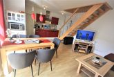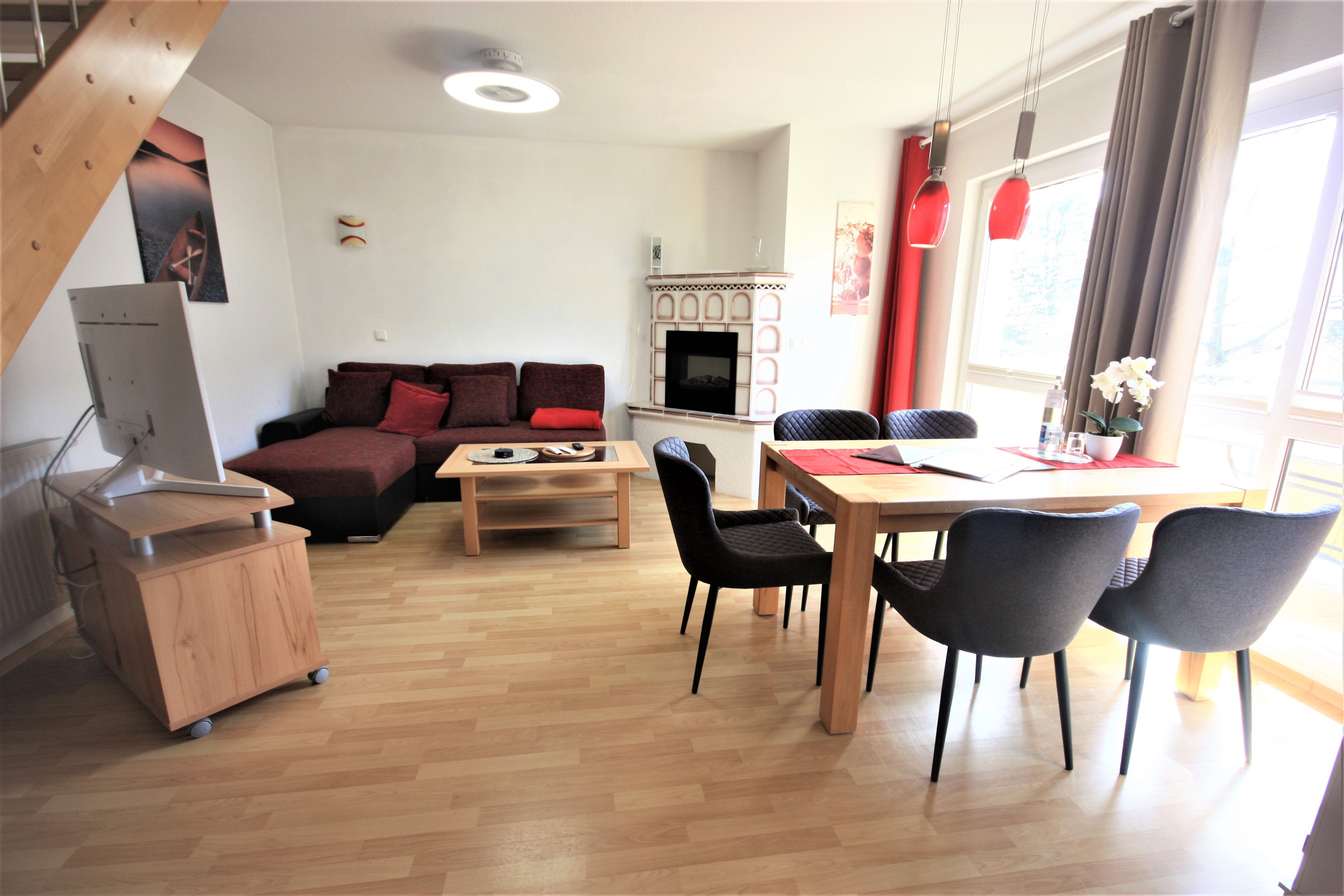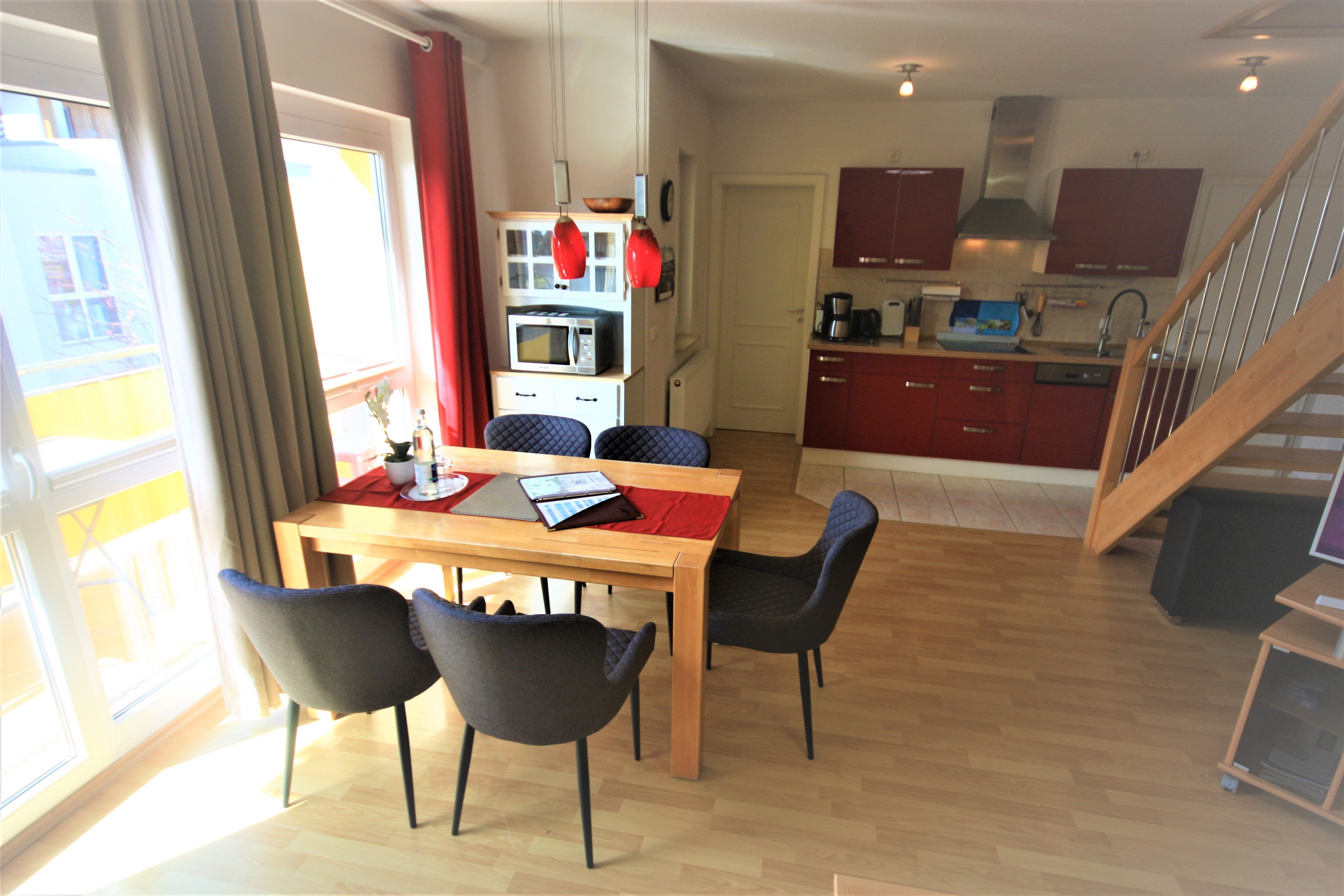Die Wohnung ist im modernen Stil gehalten. Es überwiegen rote und weiße Farben. Die Boden- und Wandbeläge, Möbel und Einrichtungsgegenstände sind aufeinander abgestimmt und geben der Wohnung den typisch maritimen Flair. Ein Elektrokachelofenkamin im Wohnzimmer sowie die Dachschrägen im Maisonette-Schlafzimmer sorgen auch an kälteren Tagen für ein hohes Wohlfühlgefühl. Die Wohnung ist für Paare und kleine Familien gleicherweise geeignet. Durch das große Wohnzimmer und die hellen Räume ist diese Wohnung auch ideal für die Winterzeit.
