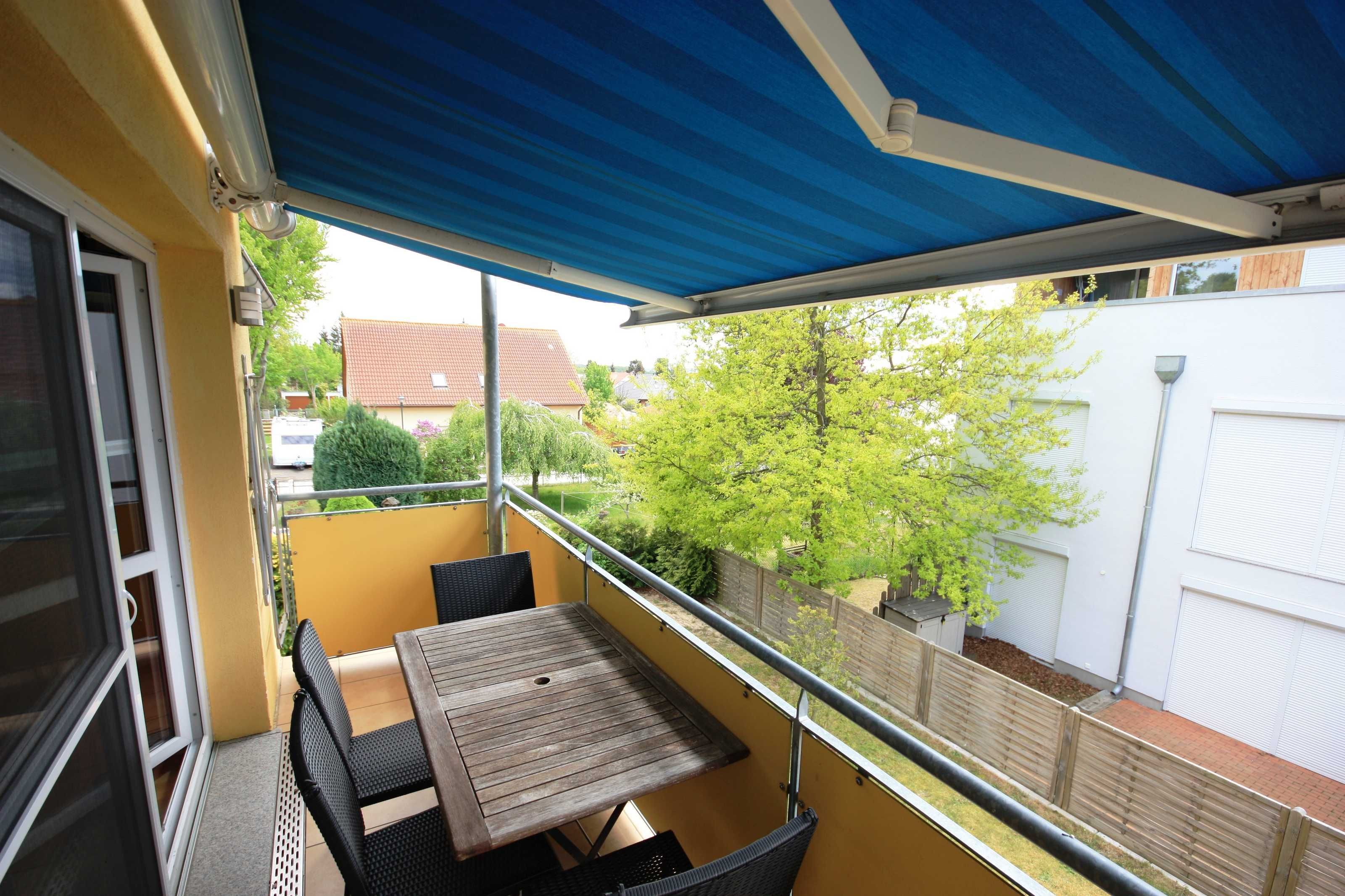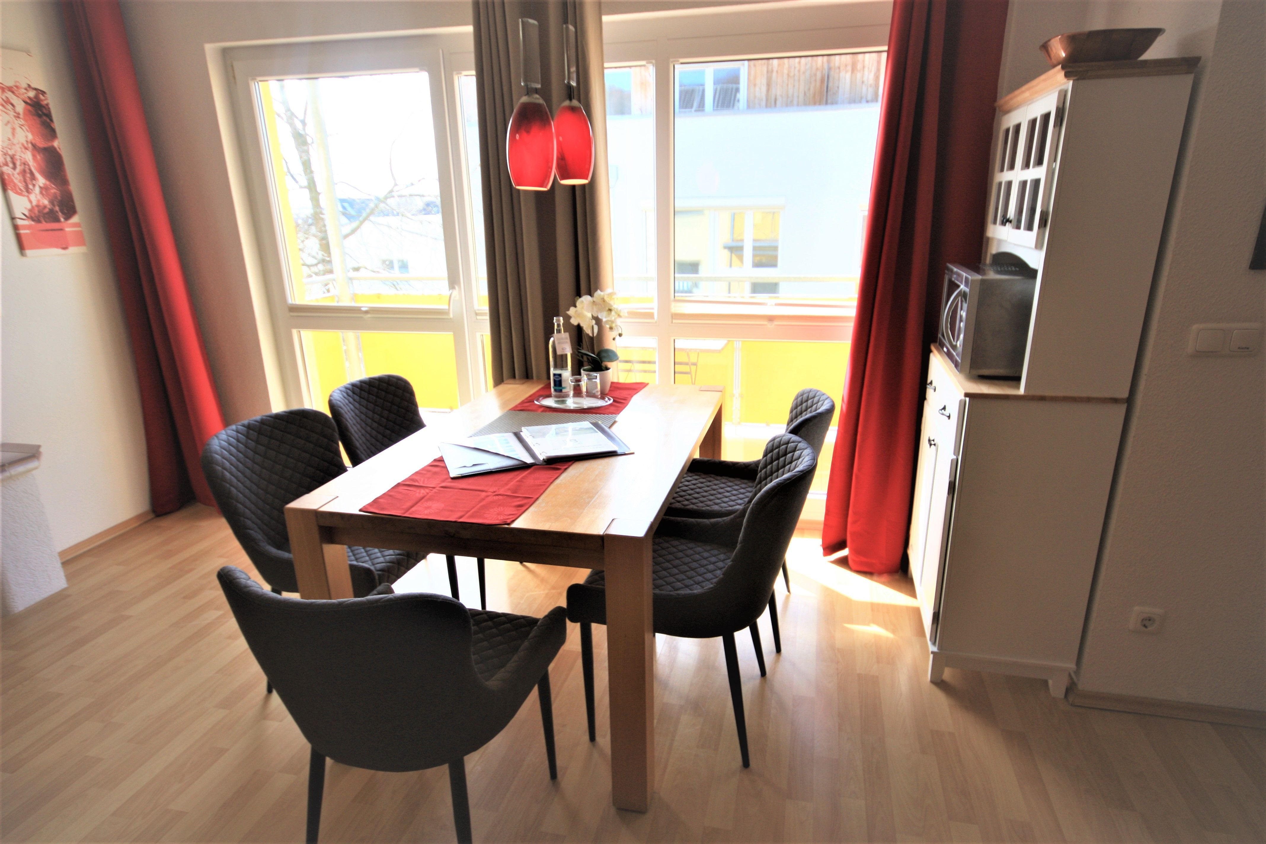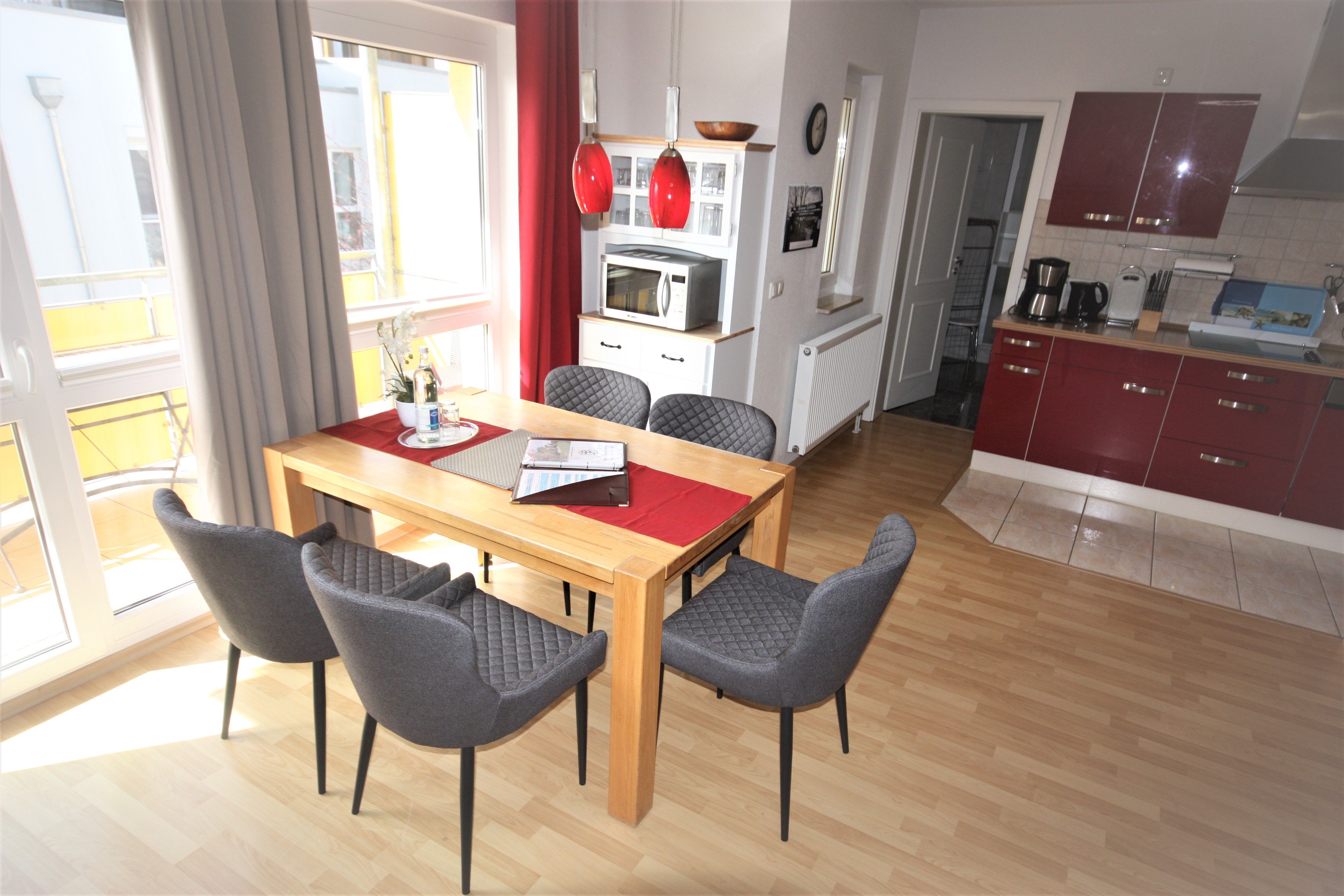 Die Ausstattung der rubinroten Hochglanzeinbauküche ist neuwertig funktional und qualitativ hochwertig unter anderem mit Toaster, Kaffeemaschine, Mikrowelle mit Grill, Ceran-Kochfeld, Geschirrspüler, Gefrierfach. Großer Süd-West-Balkon mit unverbautem Blick auf den Sonnenuntergang und das Achterwasser, Grill.