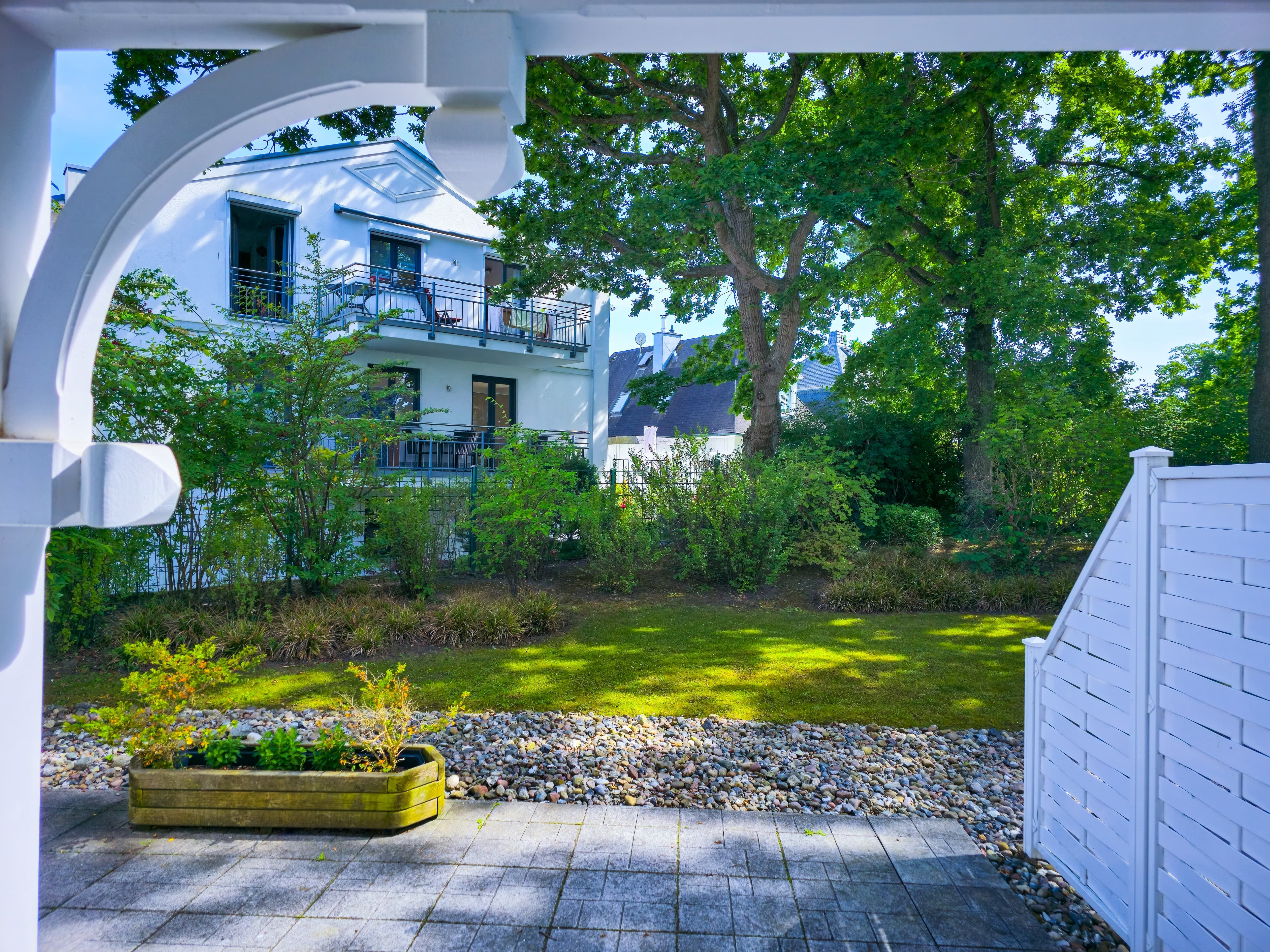 Die Ferienwohnungen liegen in einem kleinen Park mit altem Baumbestand und einem Gartenteich mit Springbrunnen. Bänke und überdachte Freisitze in den gepflegten Gartenanlagen laden zum Verweilen ein.