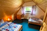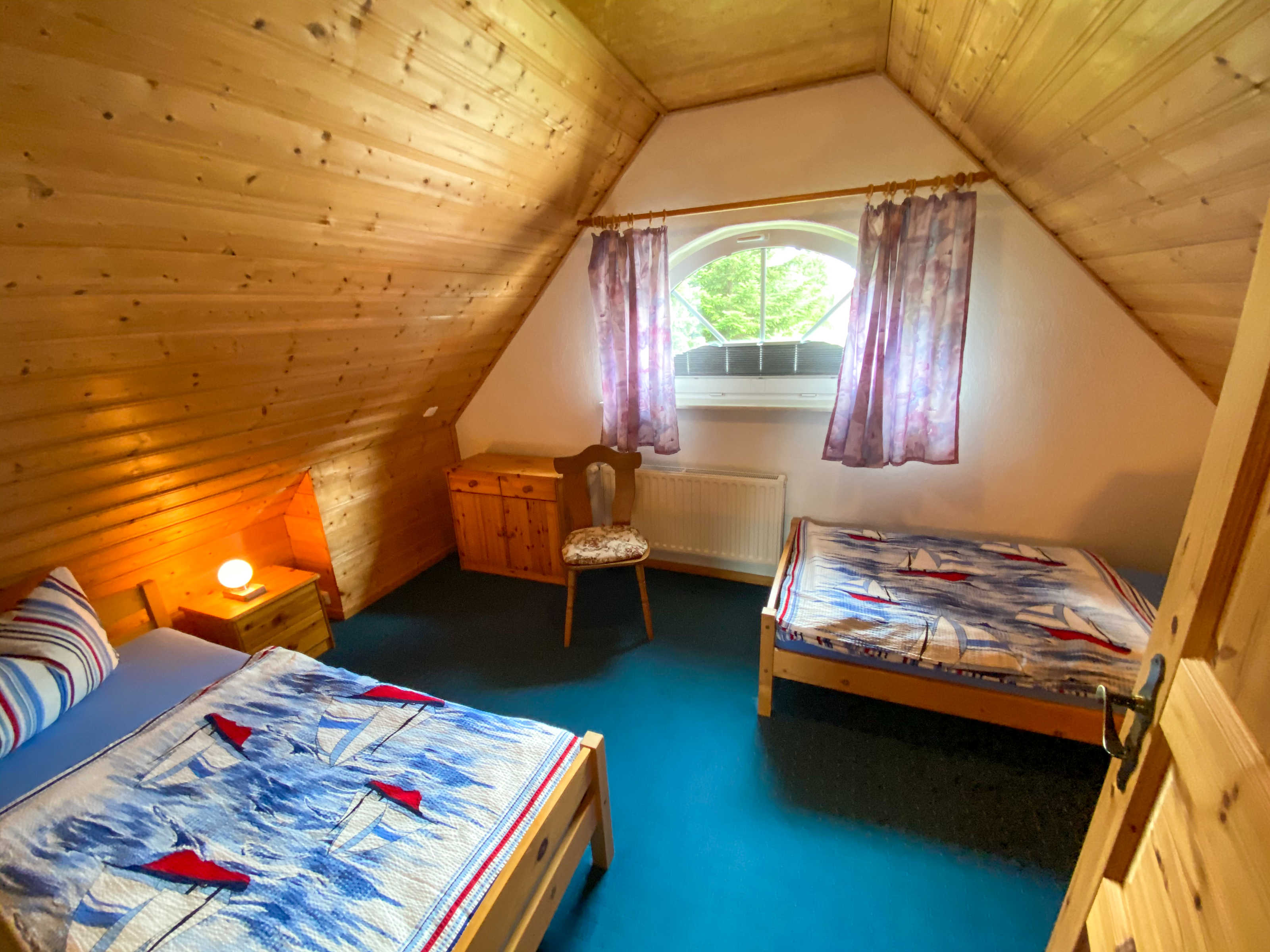 Im Obergeschoss des Ferienhauses befinden sich zwei Schlafzimmer, eines mit einem Doppelbett und Blick auf den Grabower Bodden, und eines mit zwei getrennt stehenden Betten.