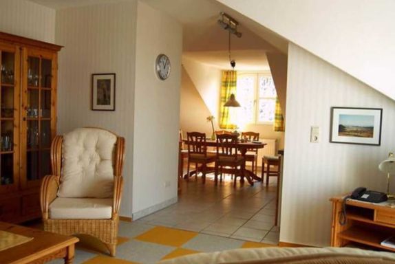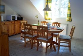 Unsere Wohnung Nr. 19 befindet sich in der 3.Etage direkt am Wald und ist ca. 85qm groß. Sie verfügt über ein geräumiges Wohnzimmer mit TV, Radio und CD-Player sowie Telefon und Internetzugang und ist offen zur Küche,welche ausgestattet ist mit allen elektrischen Haushaltsgeräten, wie Spülmaschine,Kühlschrank, Herd, Backofen, Mikrowelle,Toaster, Wasserkocher,Mixer, Pürierstab, Kaffeemachine und Senseo Kaffeeautomat.Es gibt 2 Schlafzimmer: das eine verfügt über ein Doppelbett und ein Kinderbett, das andere über ein Doppelbett, 2 Einzelbetten sowie eine gemütliche Sitzgruppe mit TV und DVD-Player. Im Badezimmer mit WC finden Sie Dusche, Badewanne, Fön,Waschmaschine und Trockner.Selbstverständlich gibt es auch ein Bügeleisen samt Bügeltisch, eine Wickelauflage, einen Hochstuhl und unterhaltsame Spiele und Bücher.Vom - wenn auch zur Größe der Wohnung kleinen - Balkon können Sie fast den ganzen Tag den Sonnenschein und eine herrliche Aussicht auf den Selliner See und das ferne Jagdschloß Granitz genießen.