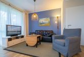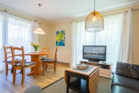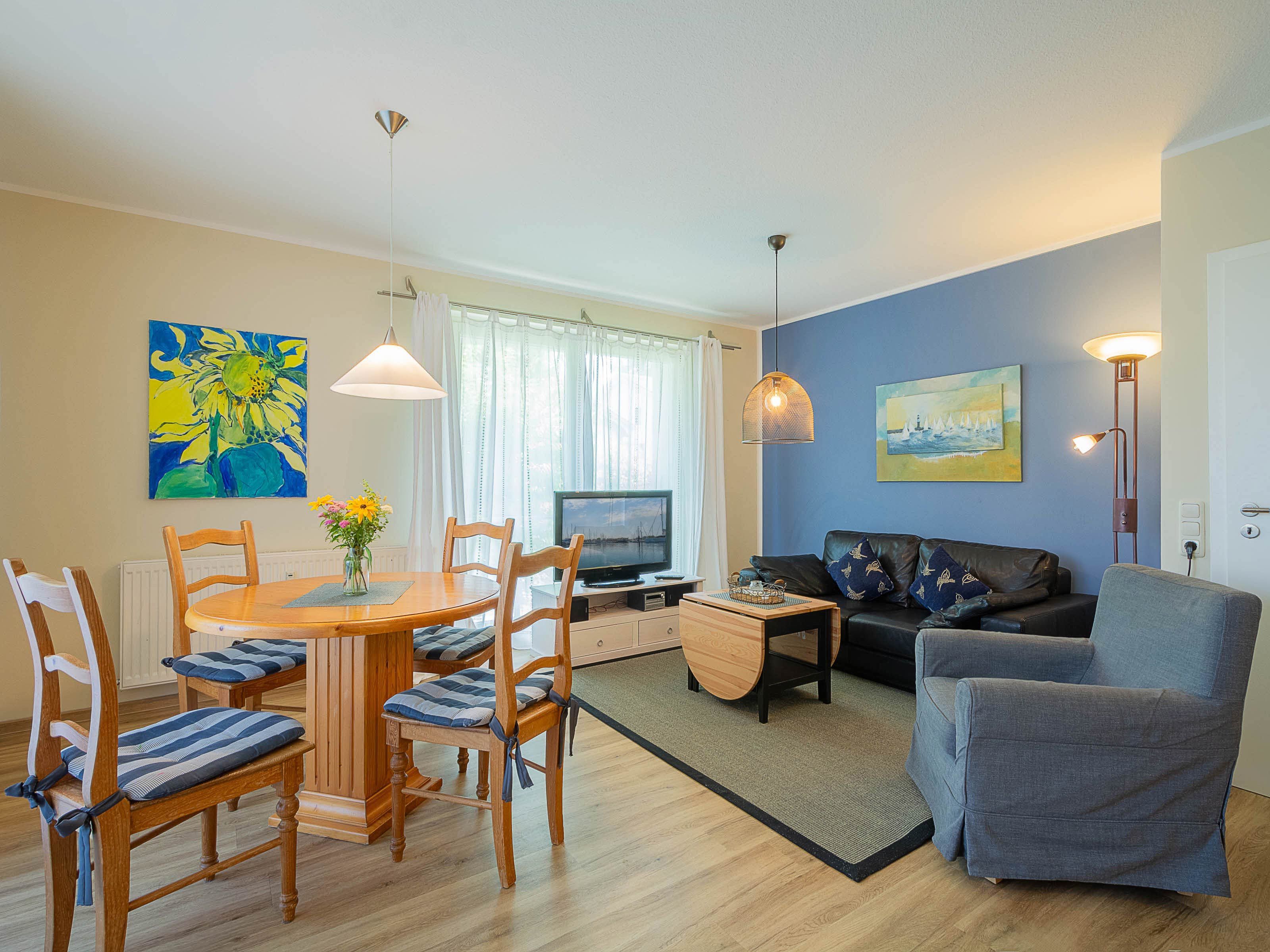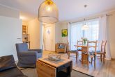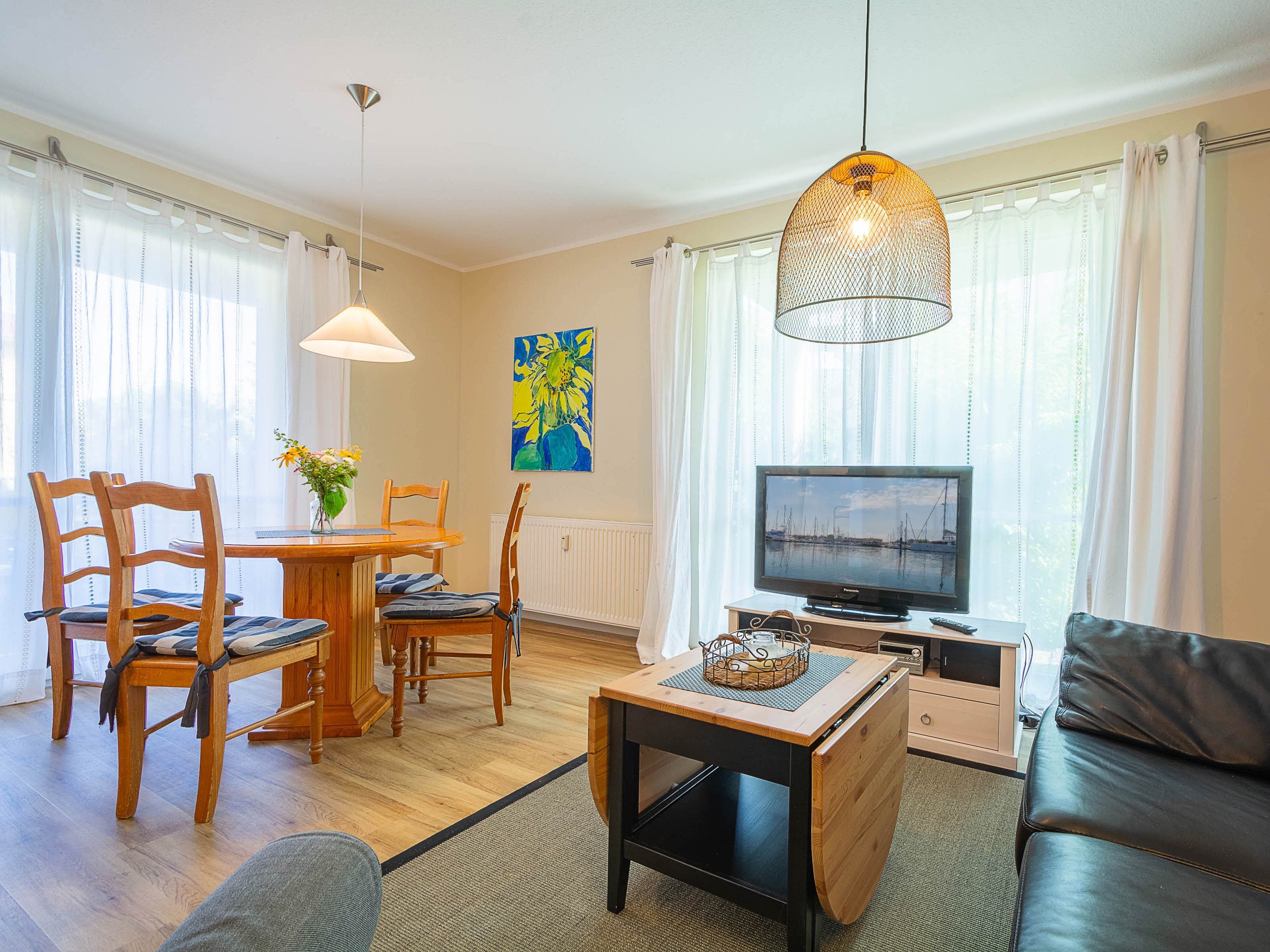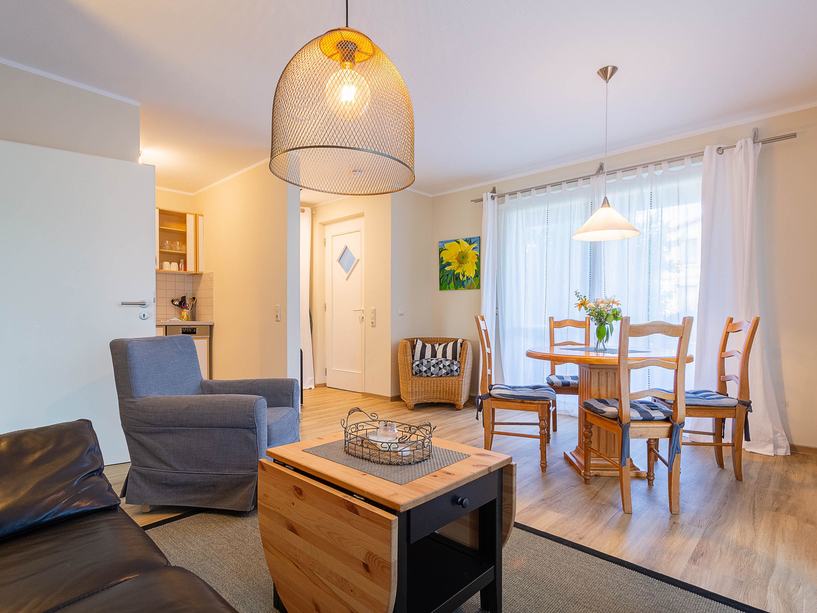 Ankommen und Wohlfühlen: Die gemütlich eingerichtete 3-Raum-Ferienwohnung von 62qm Größe befindet sich im Erdgeschoss und empfängt Sie mit einem gemütlichen offenen Wohnbereich. Hier finden Sie eine bequeme Couchgarnitur vor sowie einen 37-Zoll-Flatscreen-TV. Ein gemütlicher Esstisch mit 4 Stühlen lädt zum langen Frühstück und schönen gemeinschaftlichen Mahlzeiten ein. Von hier können Sie die möblierte West-Terrasse betreten, welche im Sommer die warme Abendsonne für Sie einfängt.