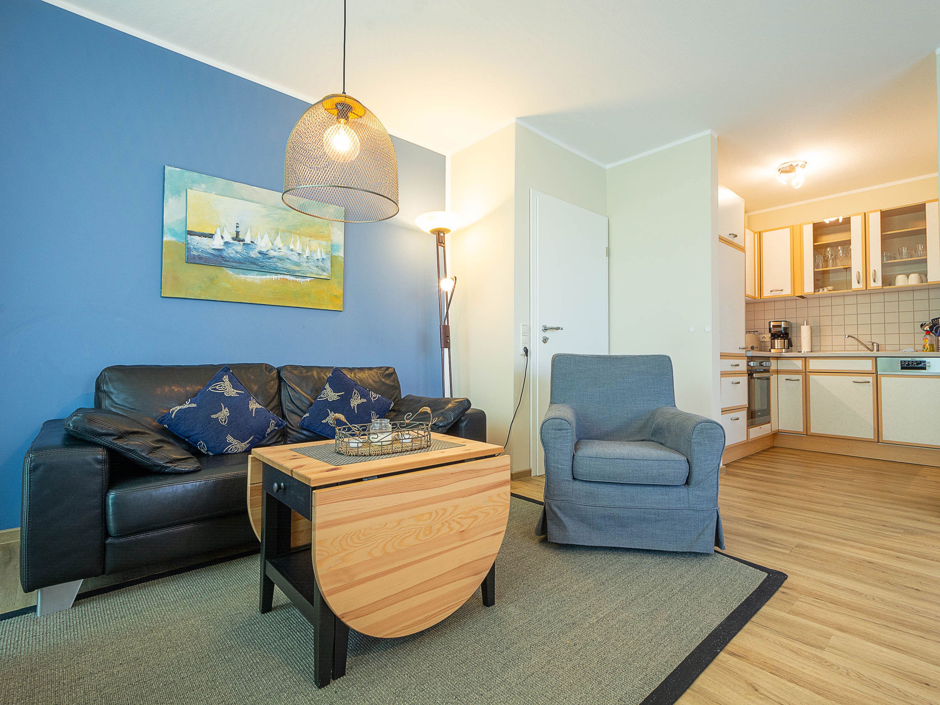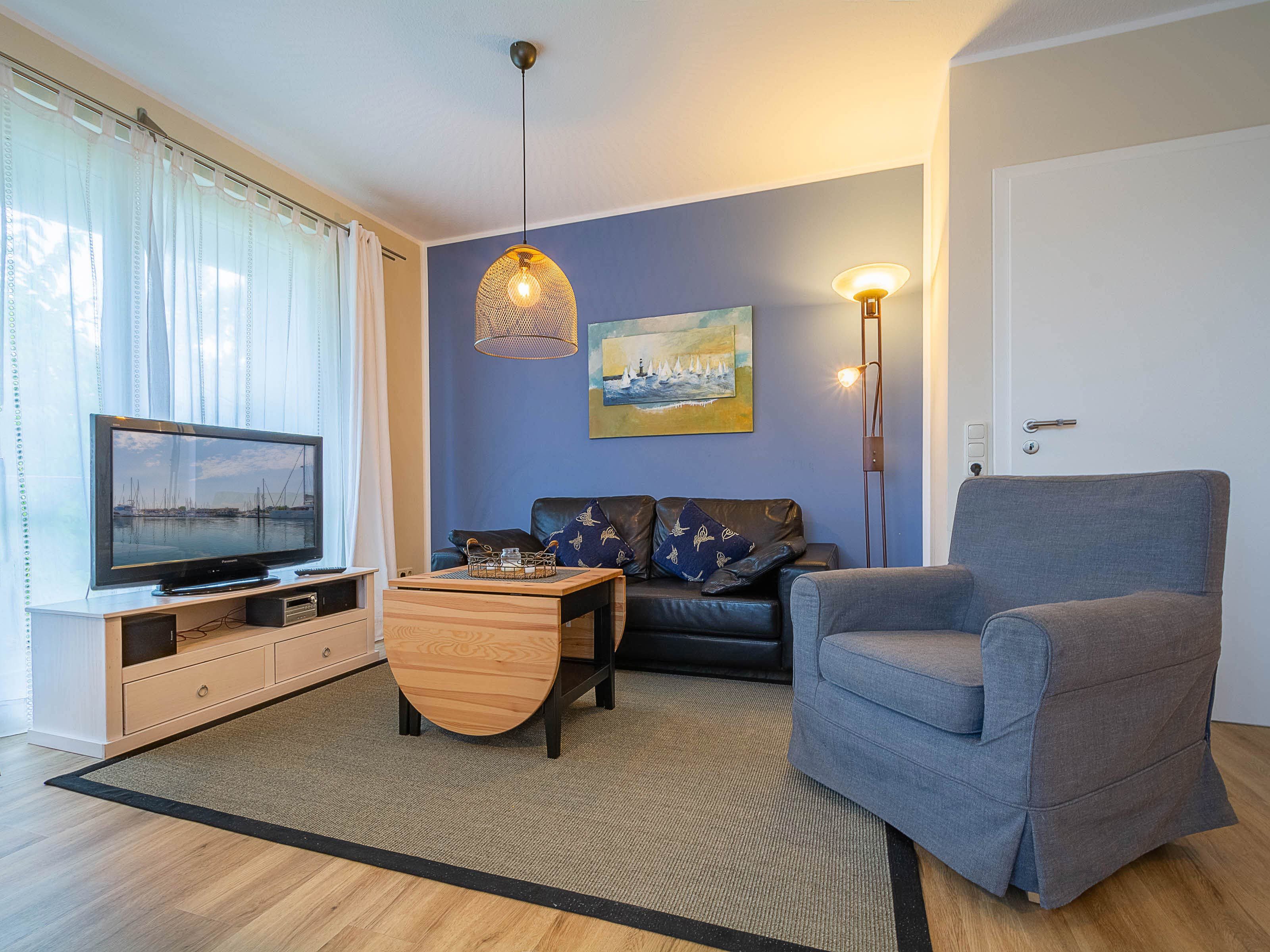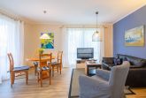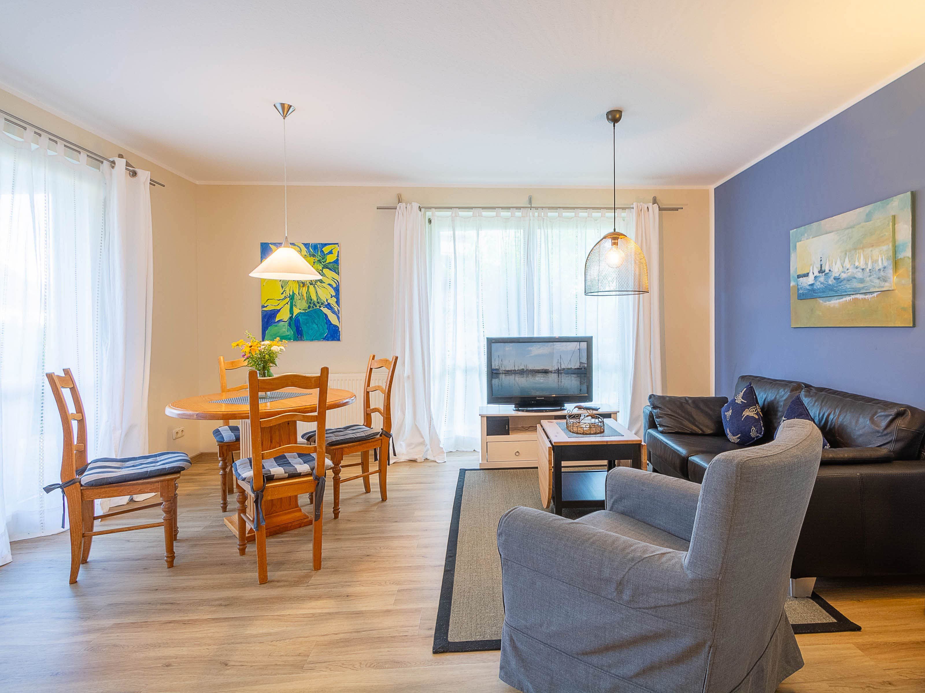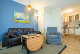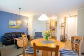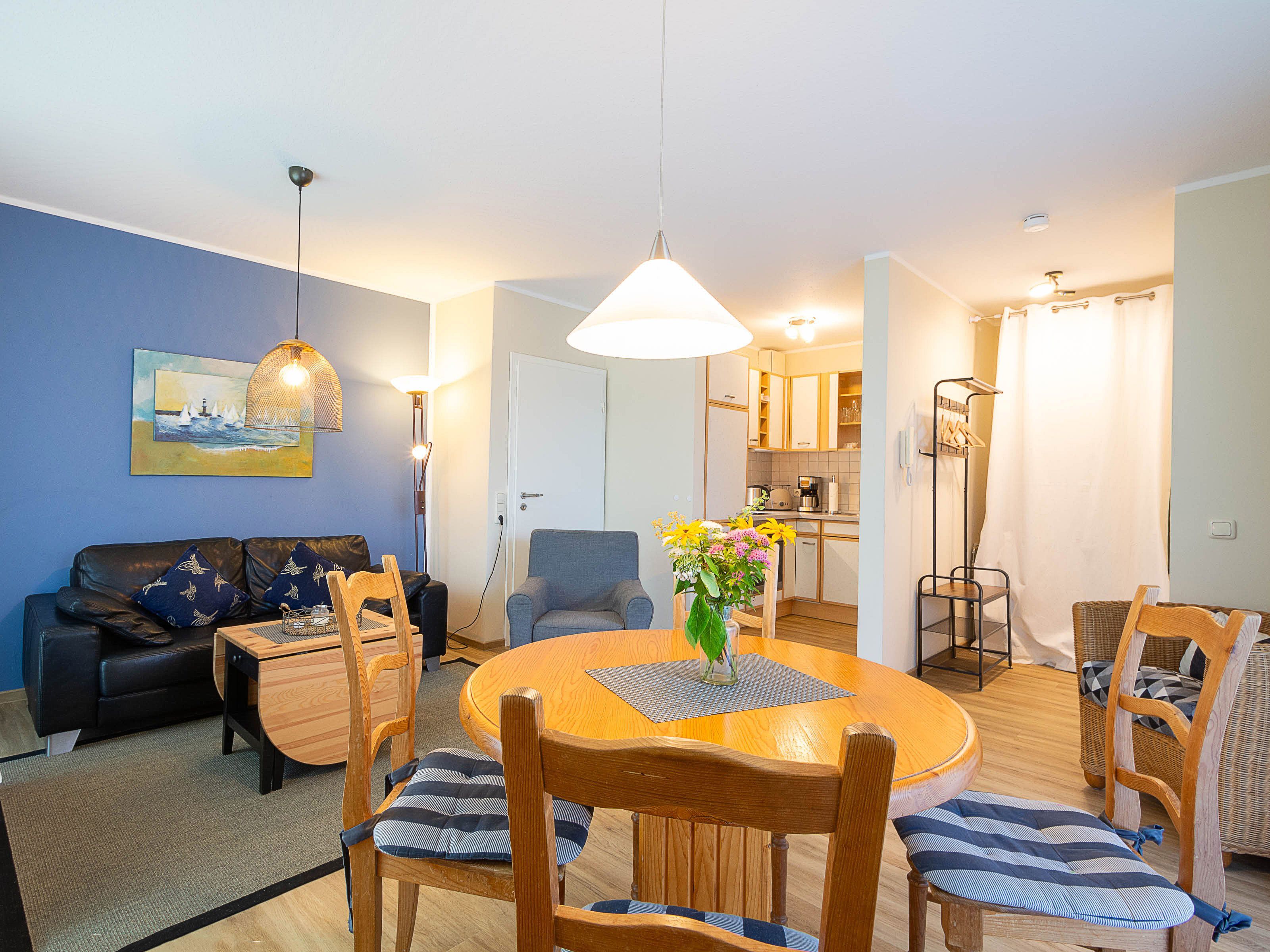 Ankommen und Wohlfühlen: Die gemütlich eingerichtete 3-Raum-Ferienwohnung von 62qm Größe befindet sich im Erdgeschoss und empfängt Sie mit einem gemütlichen offenen Wohnbereich. Hier finden Sie eine bequeme Couchgarnitur vor sowie einen 37-Zoll-Flatscreen-TV. Ein gemütlicher Esstisch mit 4 Stühlen lädt zum langen Frühstück und schönen gemeinschaftlichen Mahlzeiten ein. Von hier können Sie die möblierte West-Terrasse betreten, welche im Sommer die warme Abendsonne für Sie einfängt.