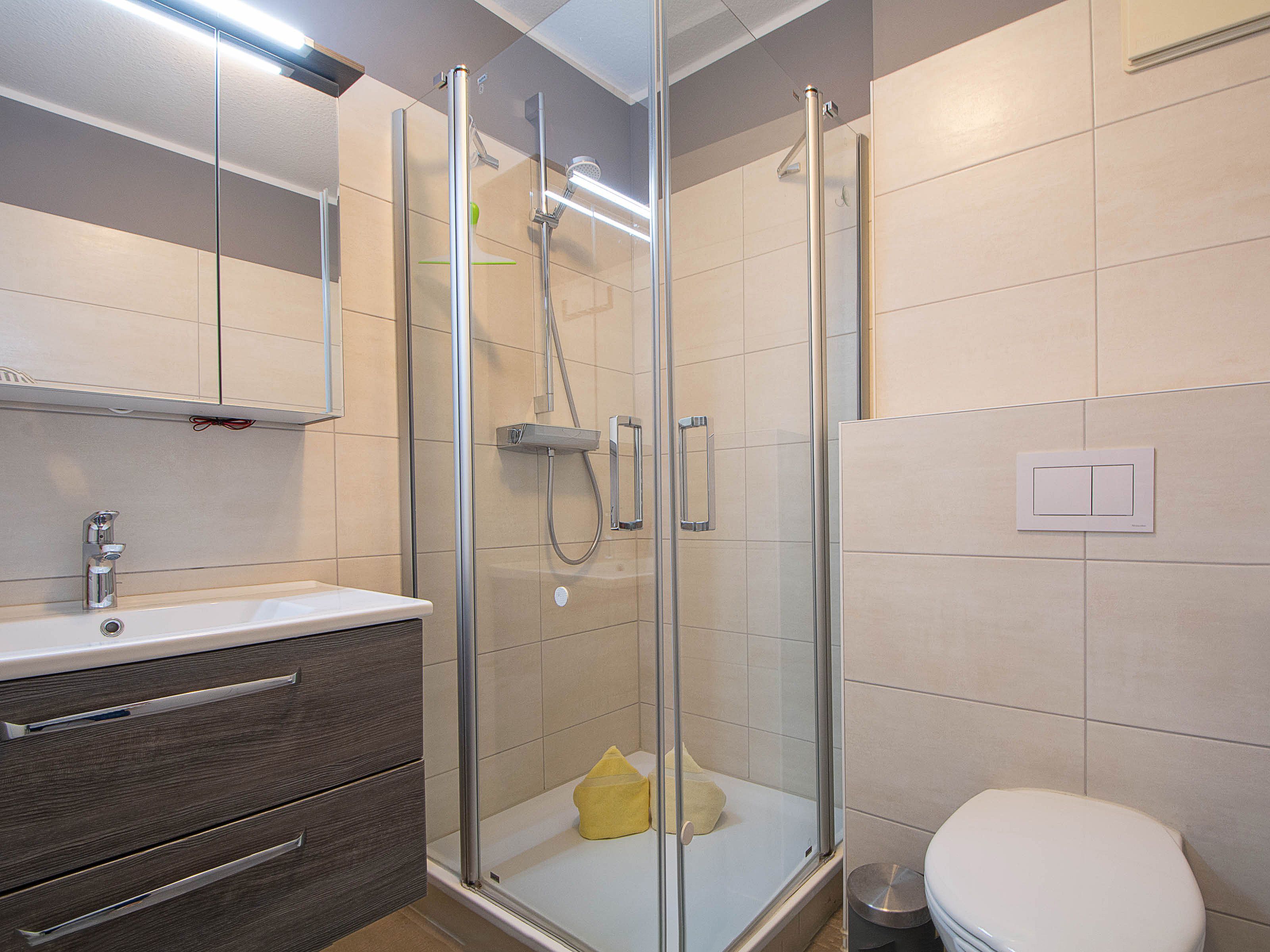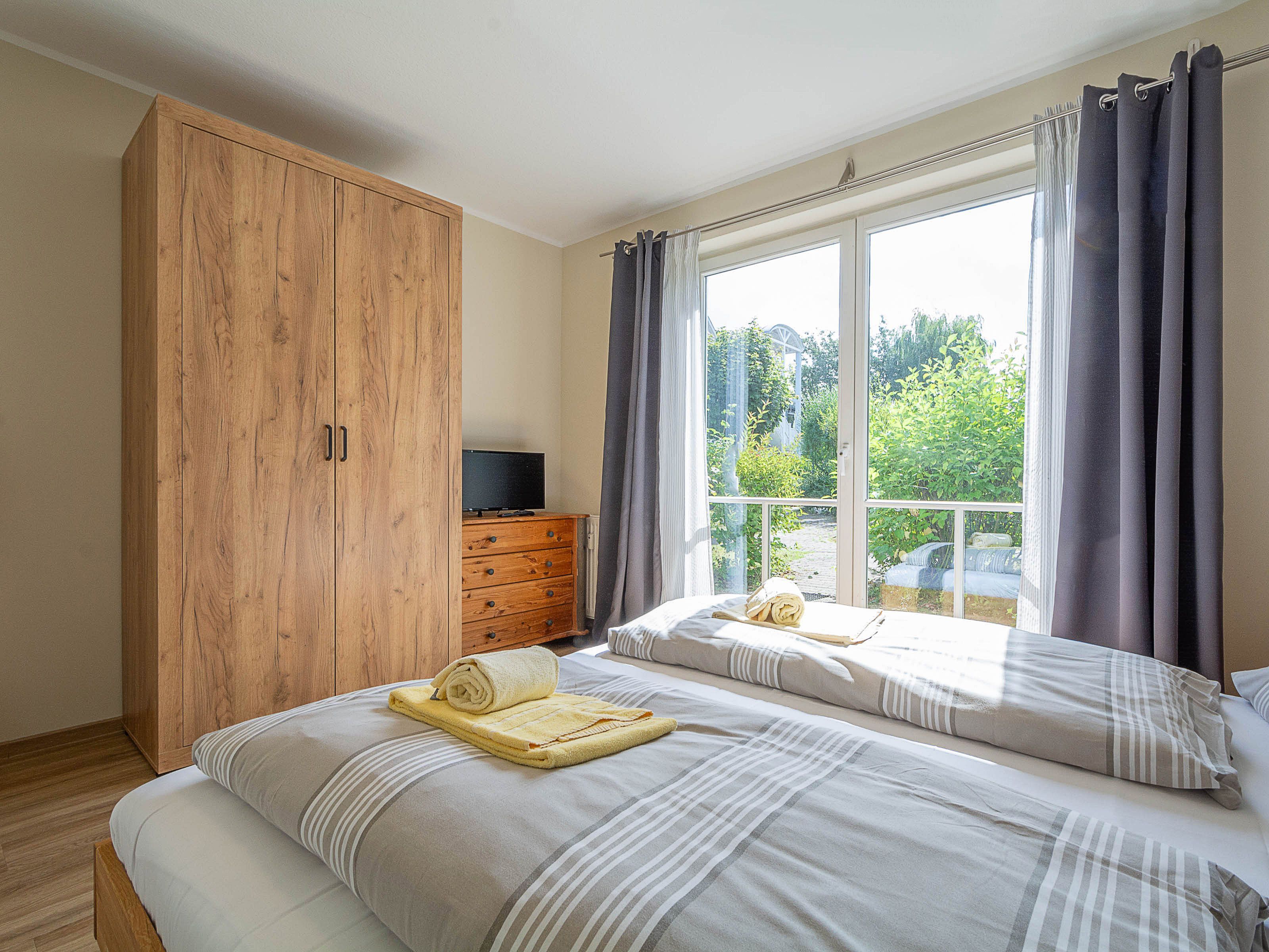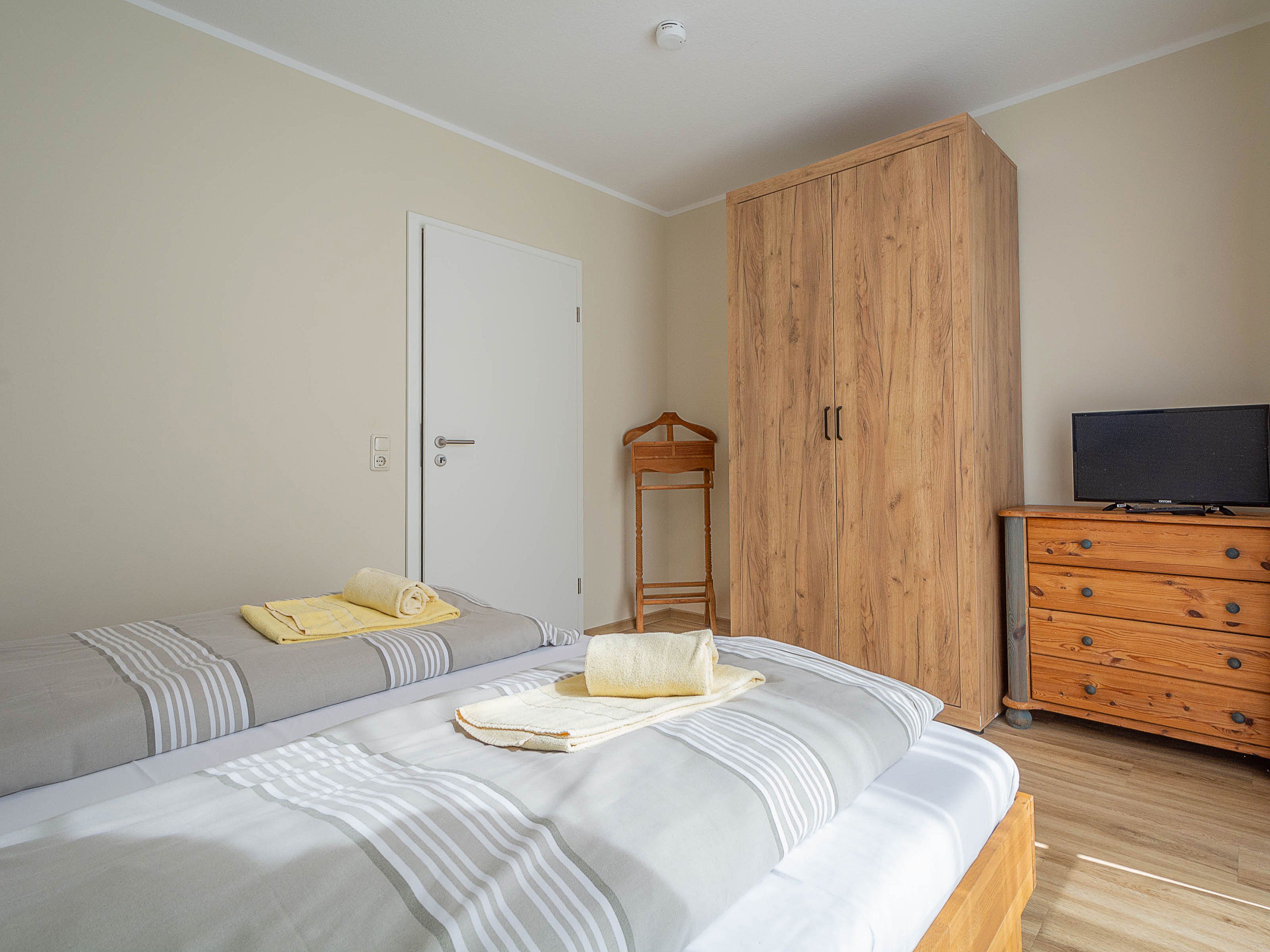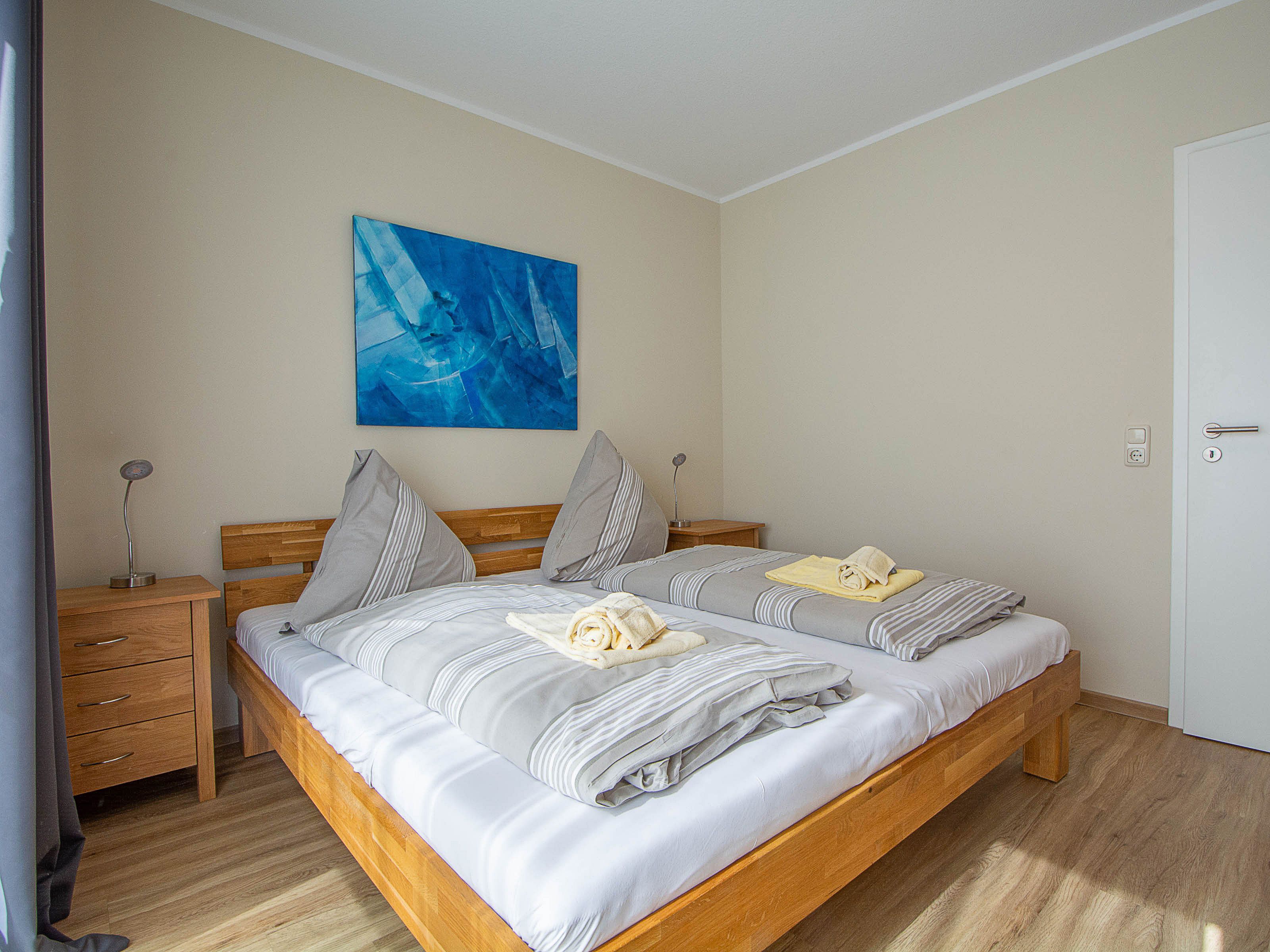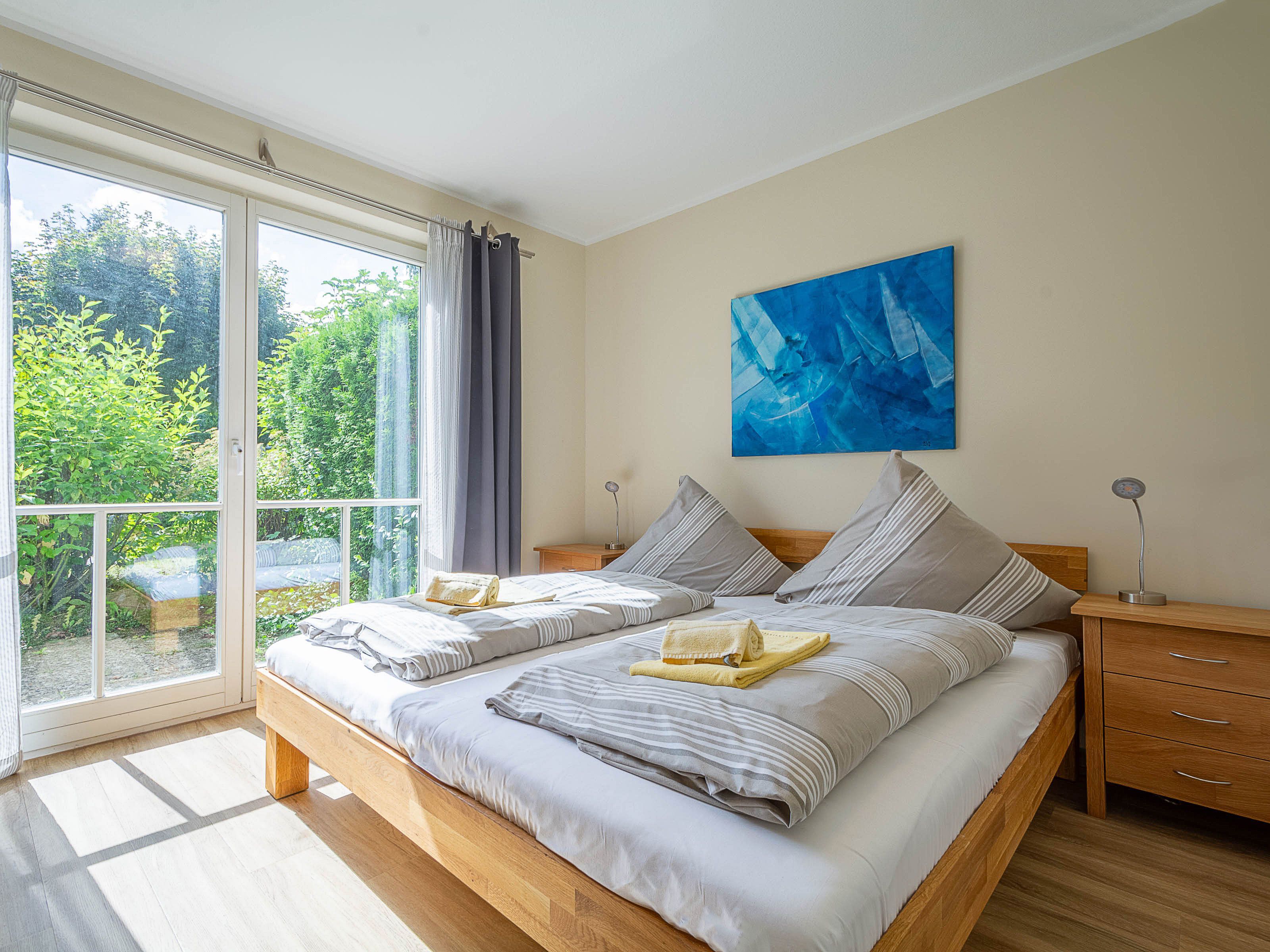 Das große Schlafzimmer mit Doppelbett (2 x 90cm x 200cm) und geräumigen Kleiderschrank bietet Ihnen den Zugang zur möblierten Ost-Terrasse, auf der Sie Ihr Frühstück in der Morgensonne genießen können. Im kleinen Schlafzimmer direkt nebenan befinden sich ein ausziehbares Kojenbett (80x200m / ausgezogen 160x200m) und ein Kleiderschrank. Das Bad ist ausgestattet mit Dusche und WC.