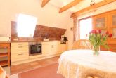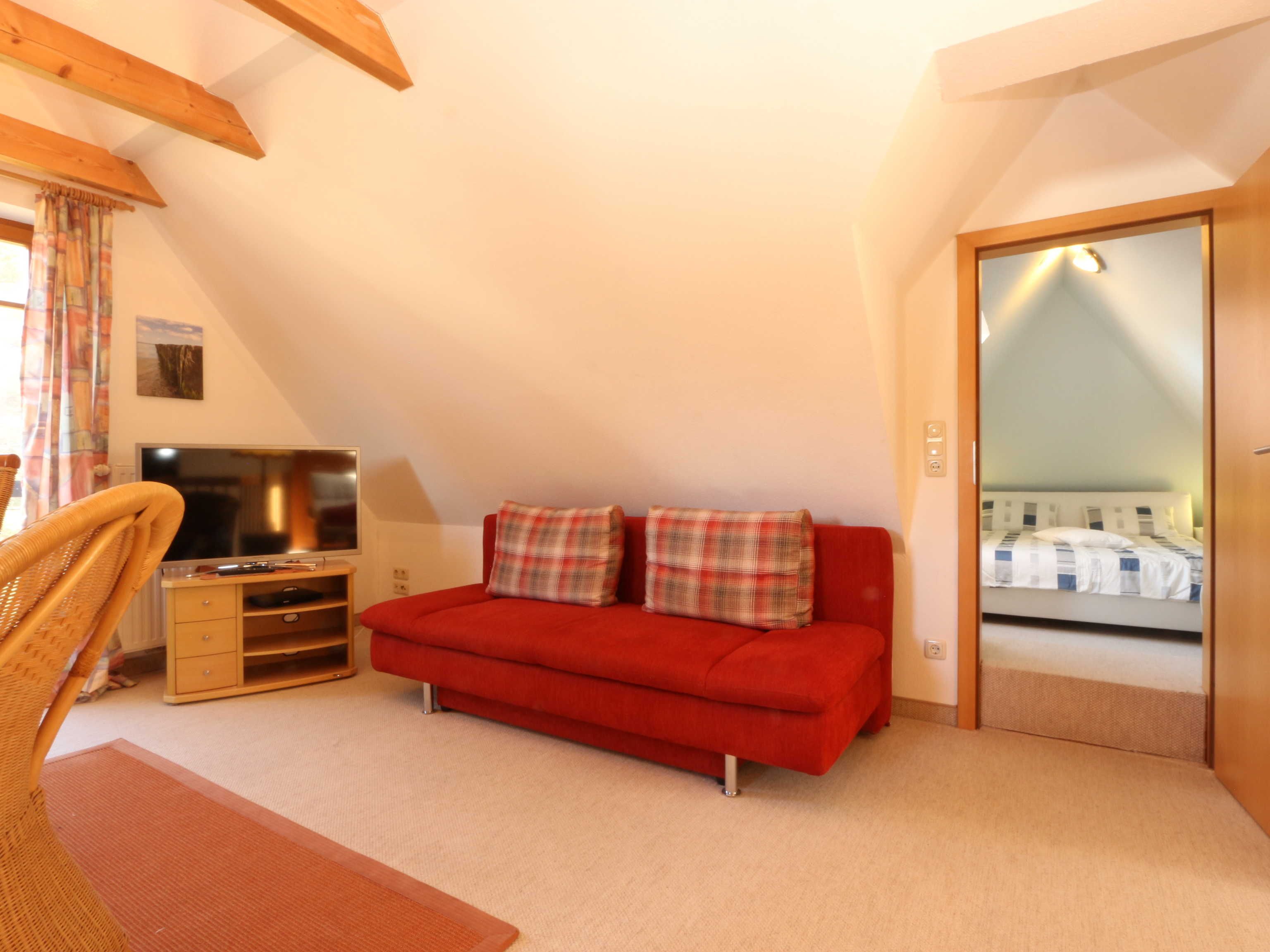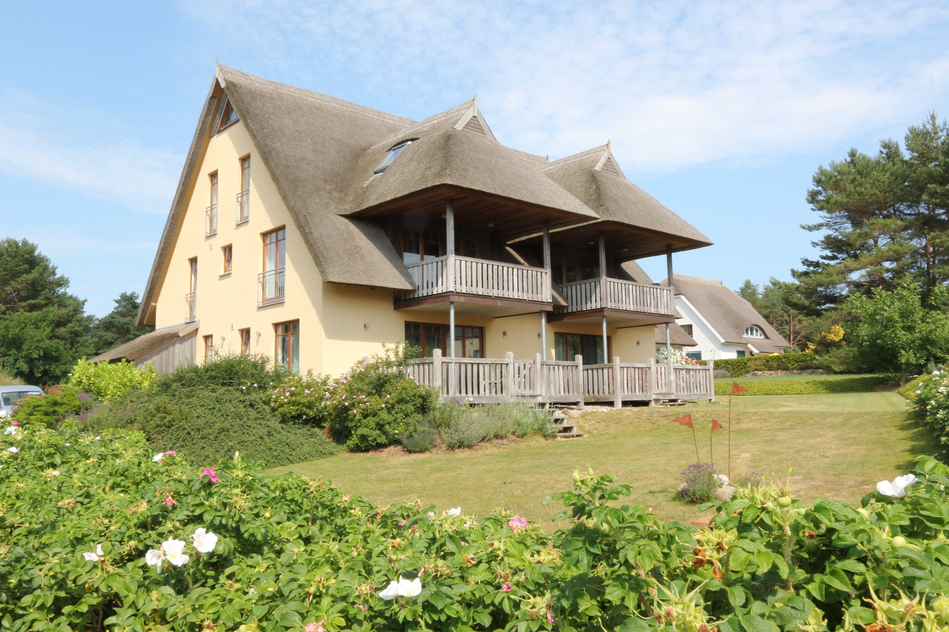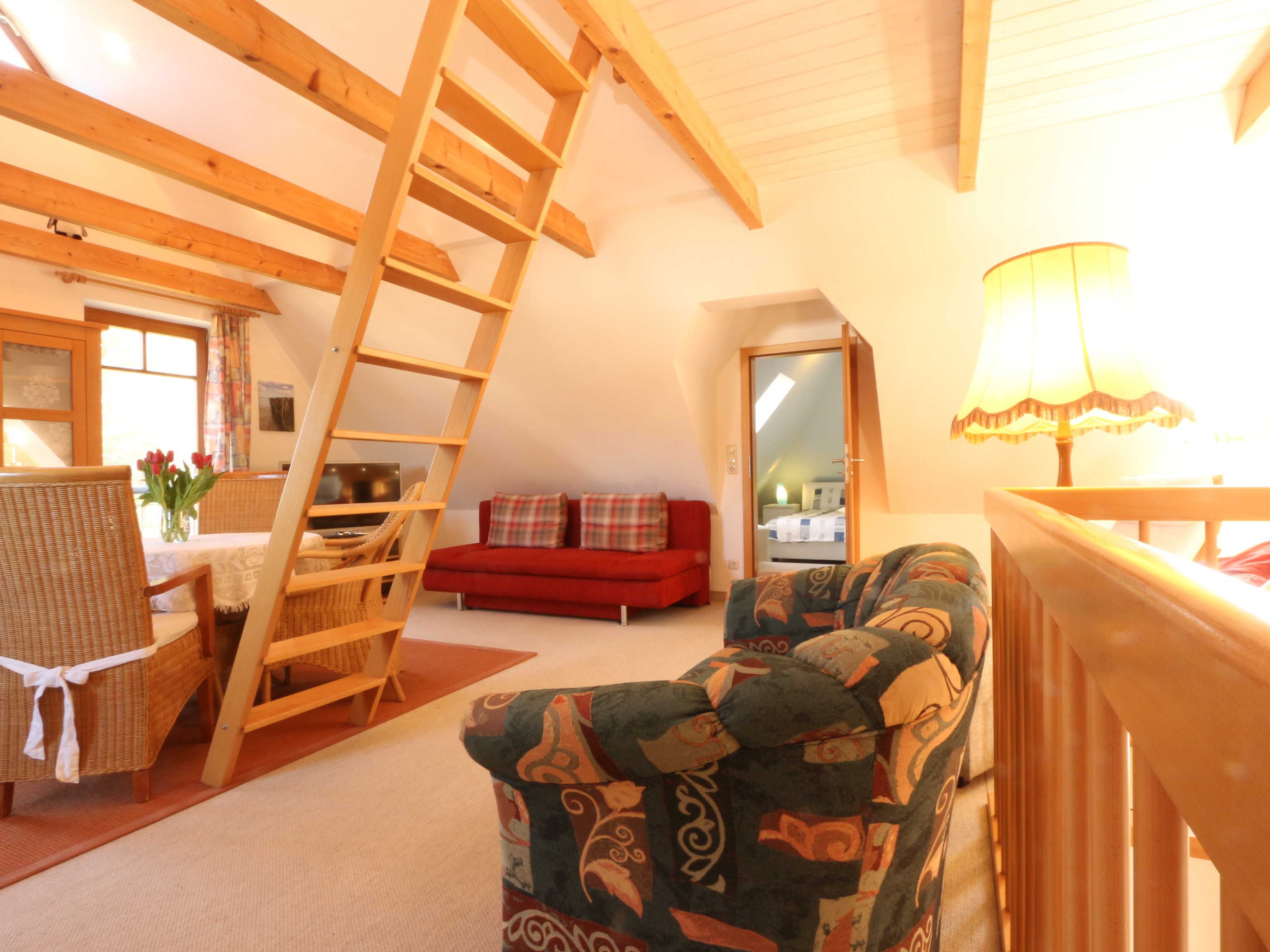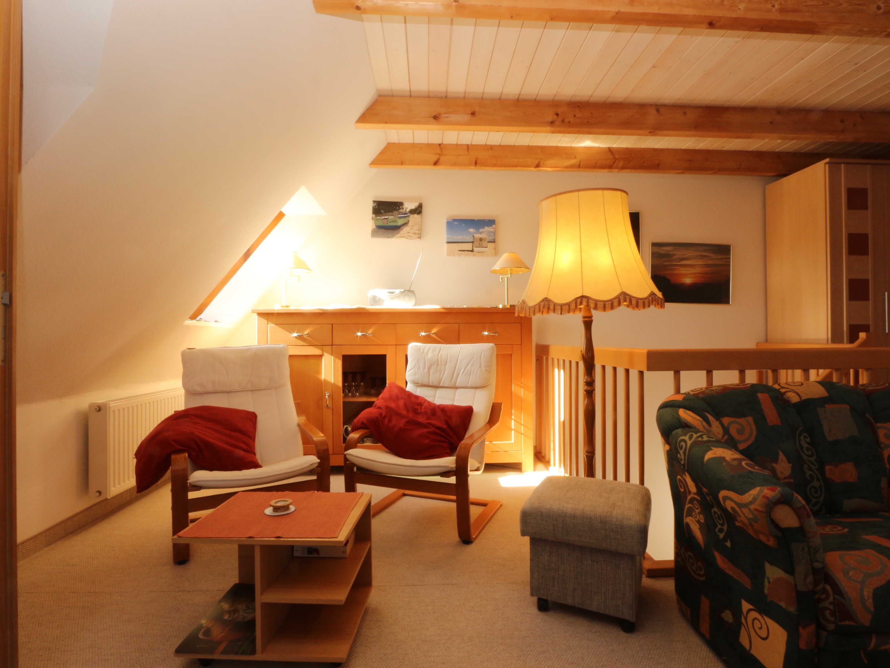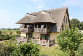• Die großräumige Ferienwohnung unterm Reetdach hat 2 Zimmer, einen Schlafboden und ein Bad. Das Wohn-,und Esszimmer ist mit einer Küchenzeile, Esstisch mit Korbsesseln für 4 Pers., 2 Fernsehsesseln, 2 Sofas mit Schlaffunktion, Küchenvitrine, einer Wohnanrichte, Kleiderschrank, Kabel-TV, DVD Player und Fernseher eingerichtet.